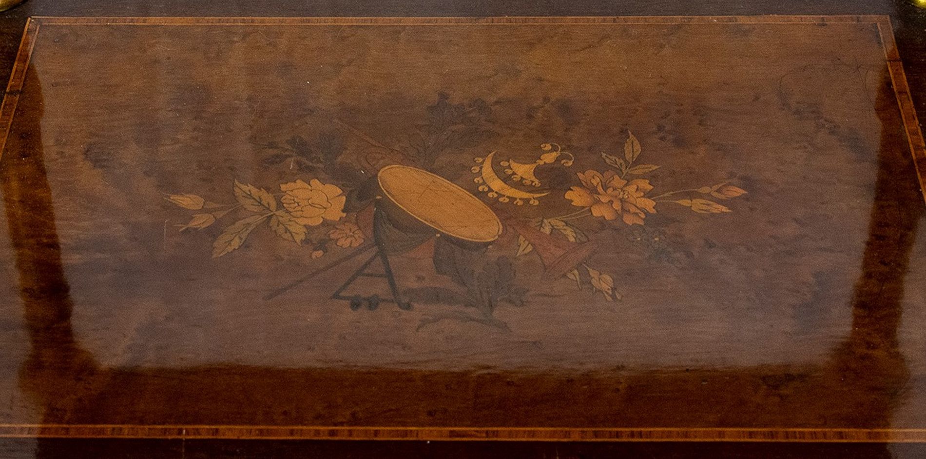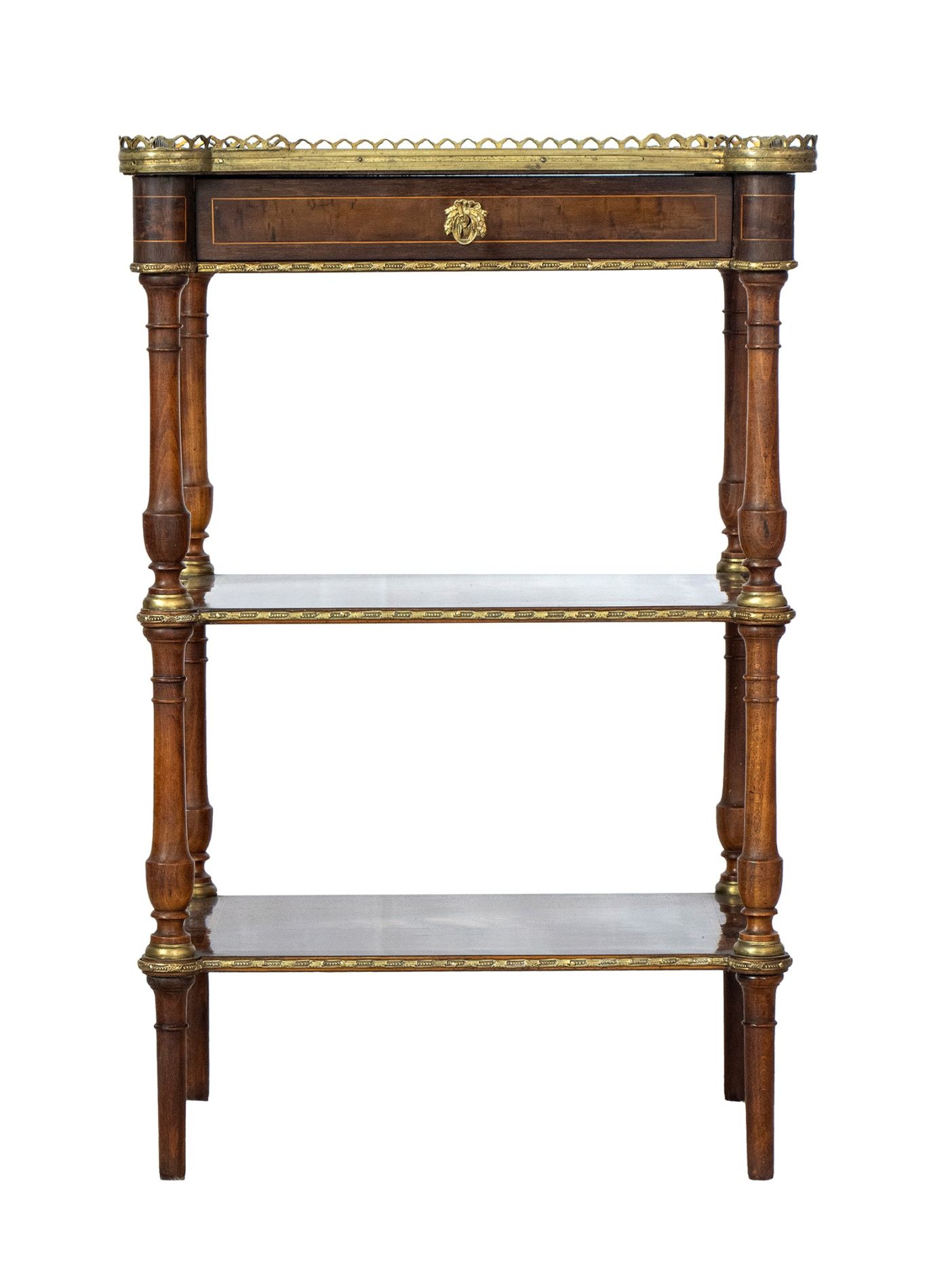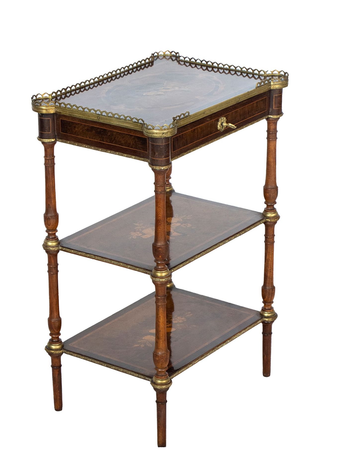 Etargere Napoleone III in radica di tuia ed ebano viola - XIX secolo con cassetto sotto il piano e tre piani intarsiati in legno di frutto ed ebano viola, differenti per ogni piano, a motivi floreali e musicali; applicazioni in bronzo dorato.