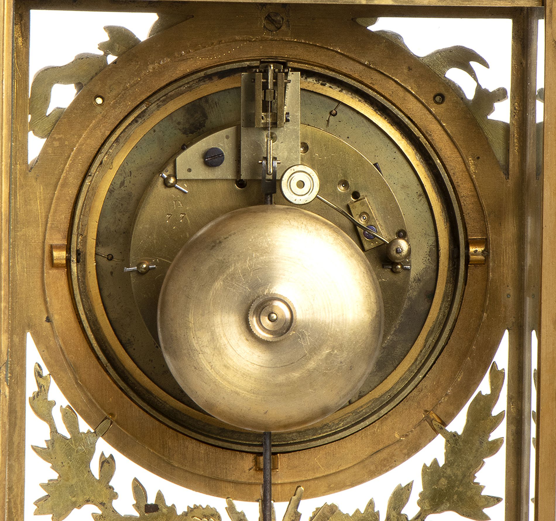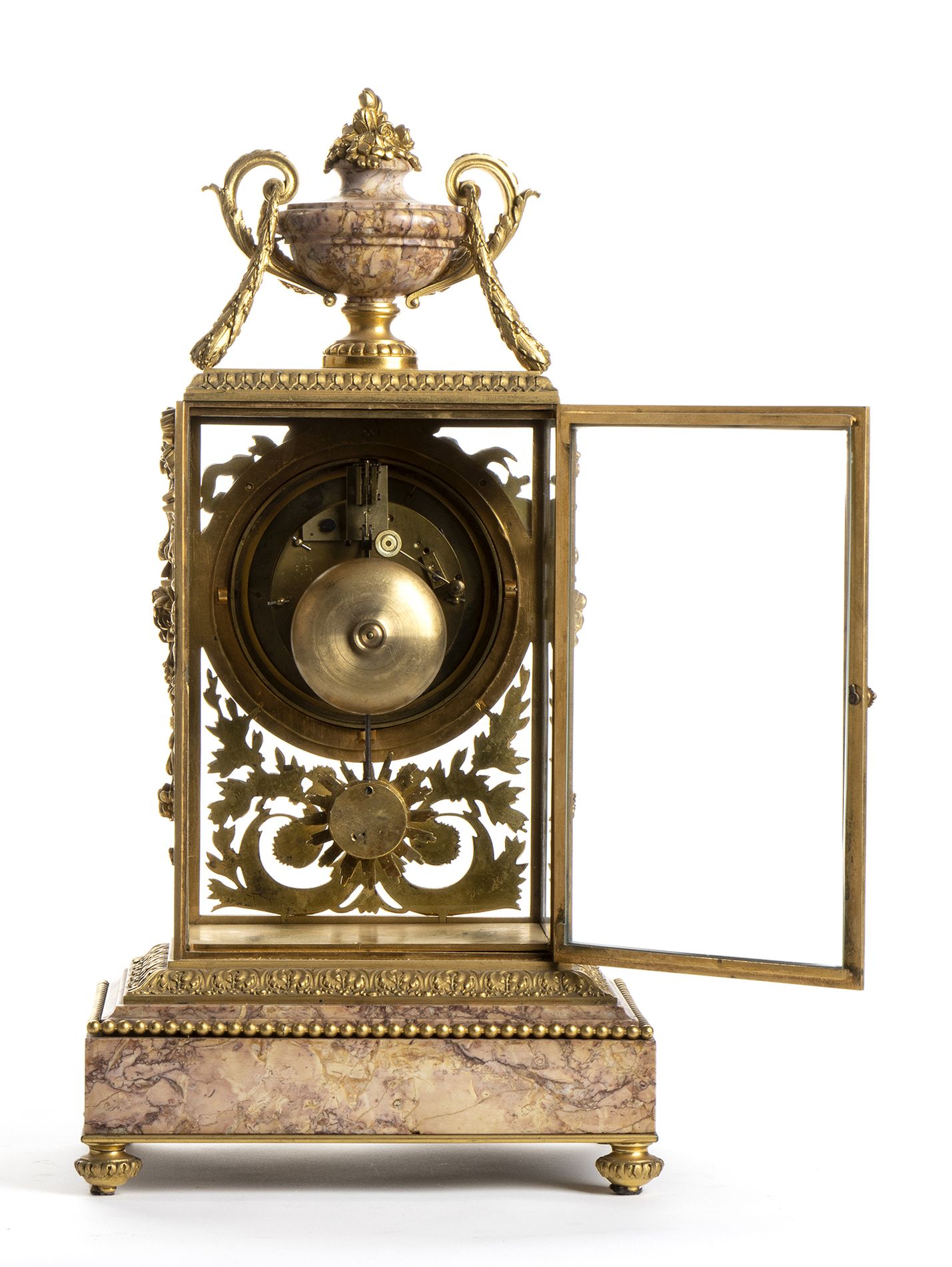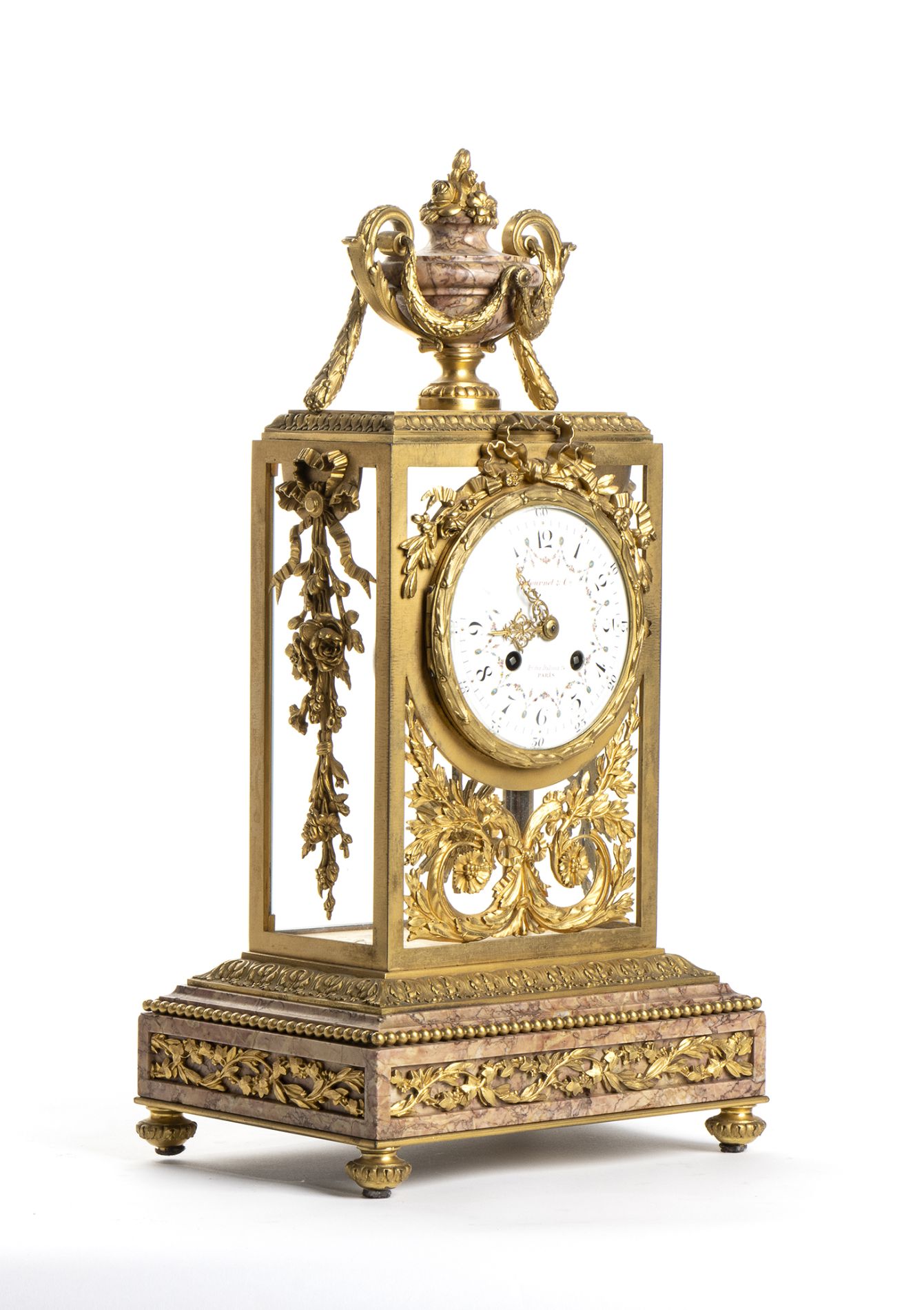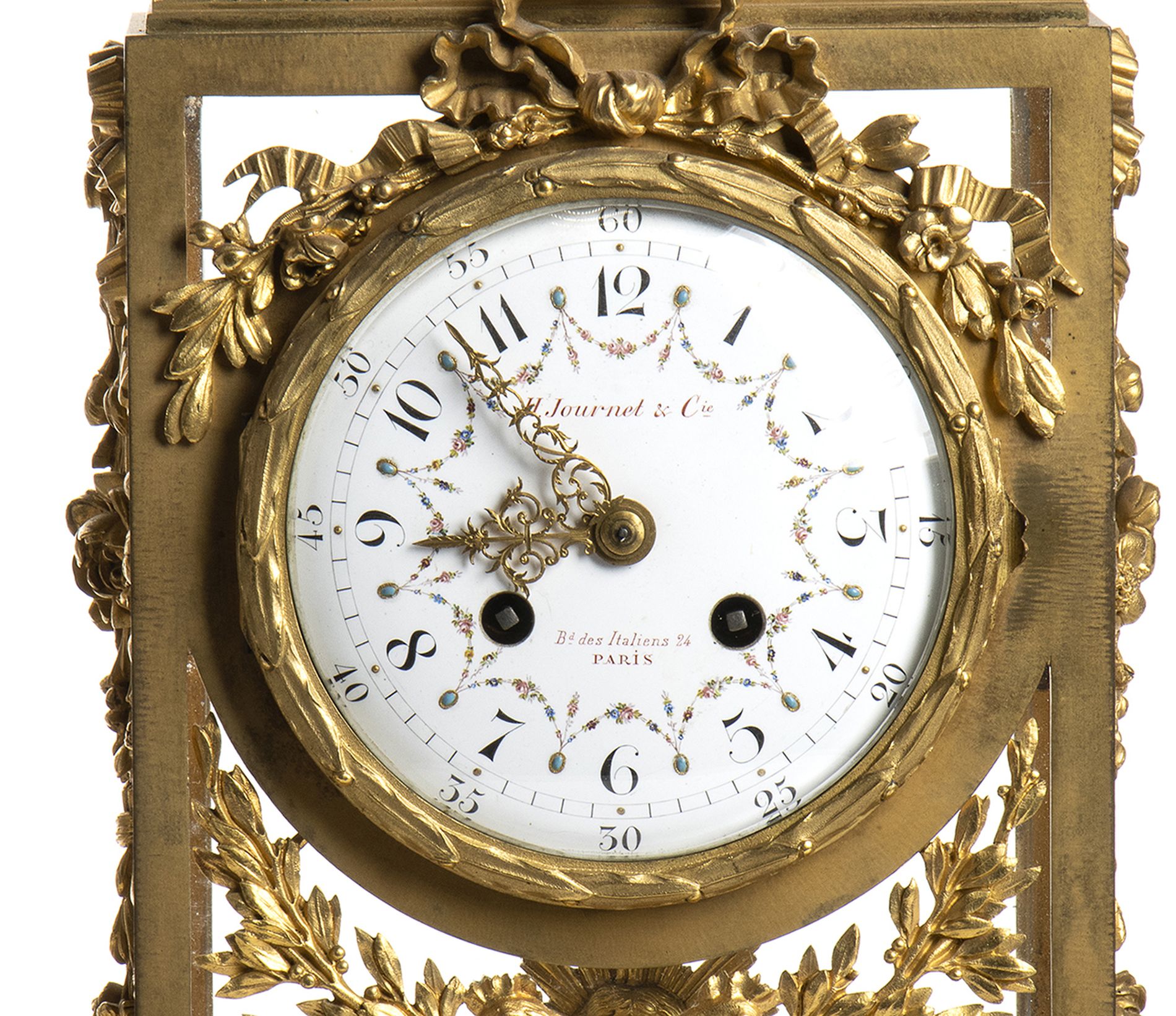 Orologio a base rettangolare in marmo e bronzo dorato poggianti su piedini a trottola. Quadrante in ceramica bianca deocrata con festoni policromi, numeri romani e sfere dorate, firmata "H.Journet & Cie B.d des Italiens 24, Paris.” , movimento con regolatore a pendolo e suoneria delle ore e delle mezze su campana.L’orologio è sormontato da un vaso in bronzo.