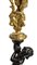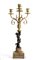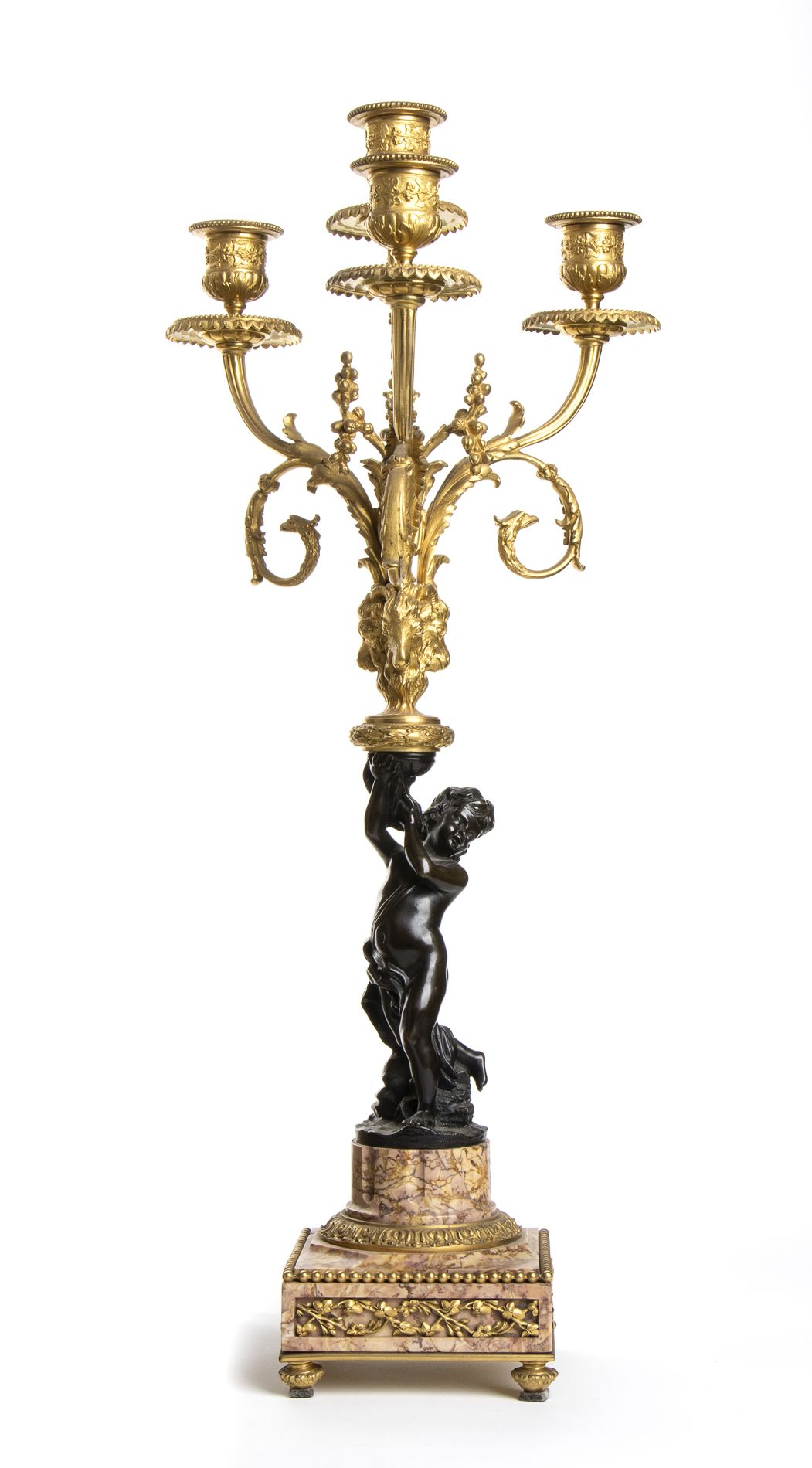 Trittico francese in bronzo dorato - Parigi XIX secolo, firmato H. JURNET & CIE. coppia di candelabri a base quadrata in marmo e bronzo dorato poggianti su piedini a trottola, fusti in bronzo patino raffiguranti due putti che sostengono la parte superiore cinque fiamme.