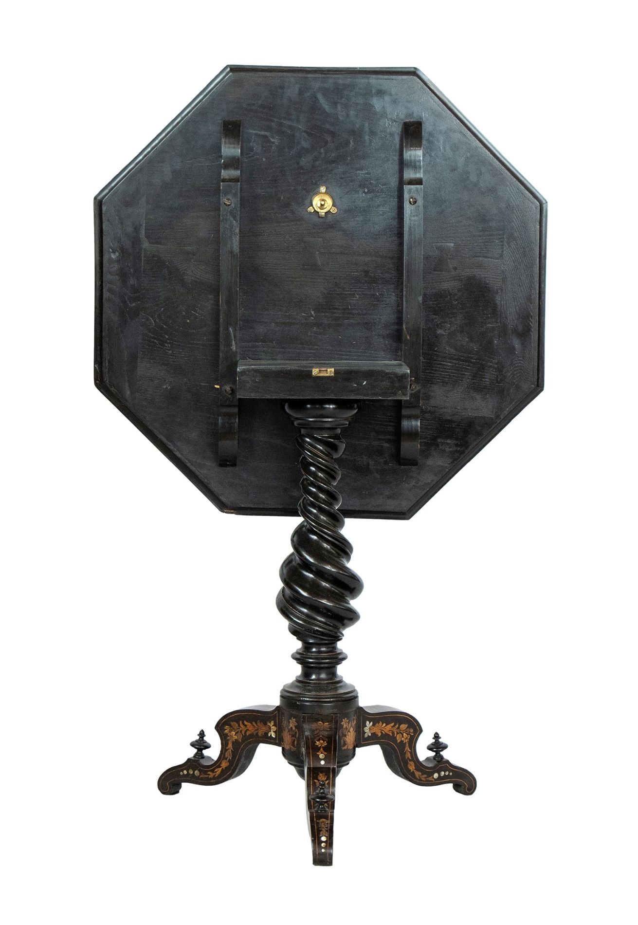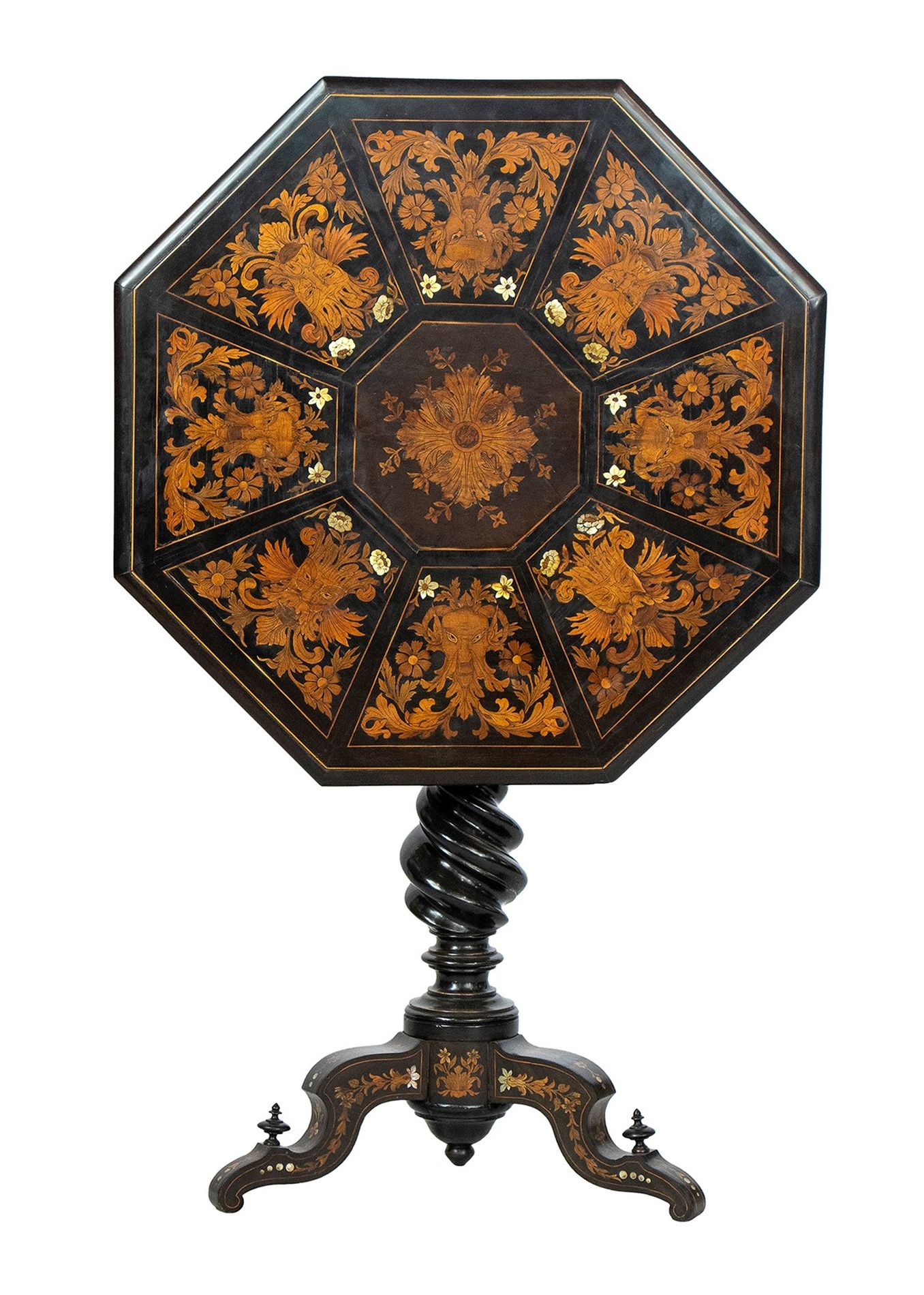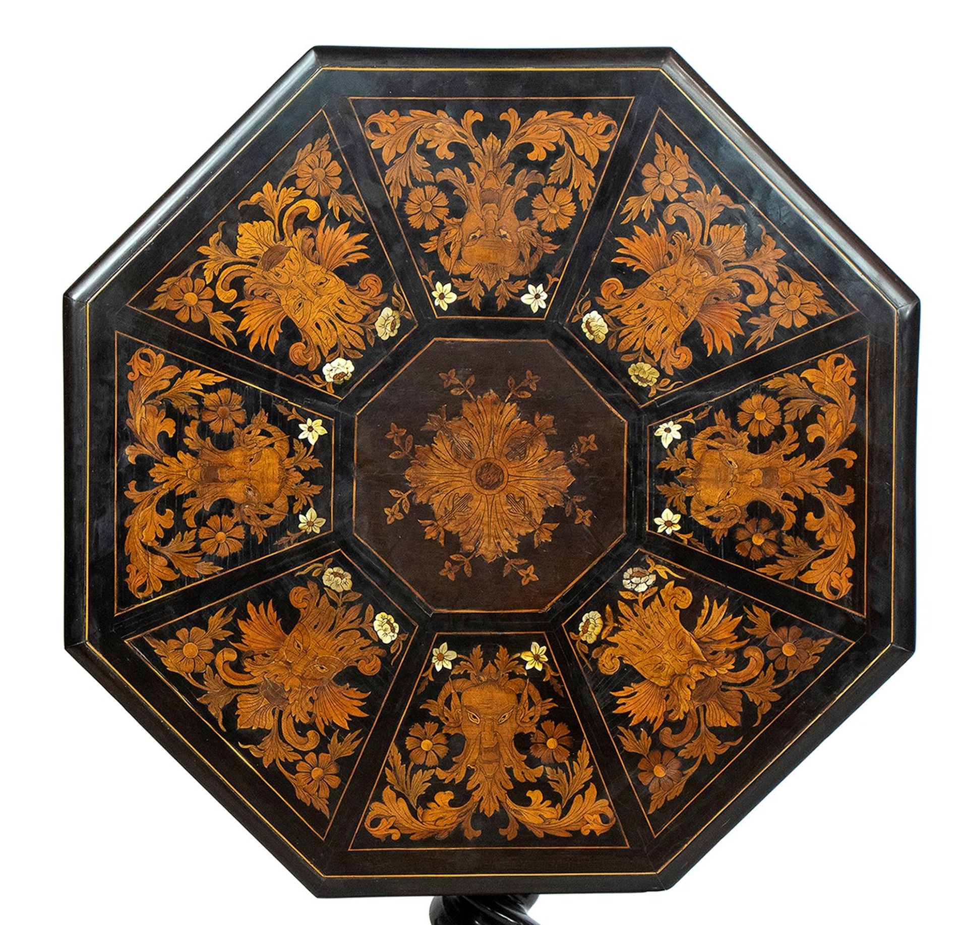 Tavolo ottagonale intarsiato - Toscana, XIX secolo, ambito FALCINI intarsiato in madre perla e legni di frutta alla maniera di Giuseppe Arcimboldo, sorretto da gamba a torciglione poggiante su base ottagonale rialzata su quattro piedini; il piano è ribaltabile a vela.