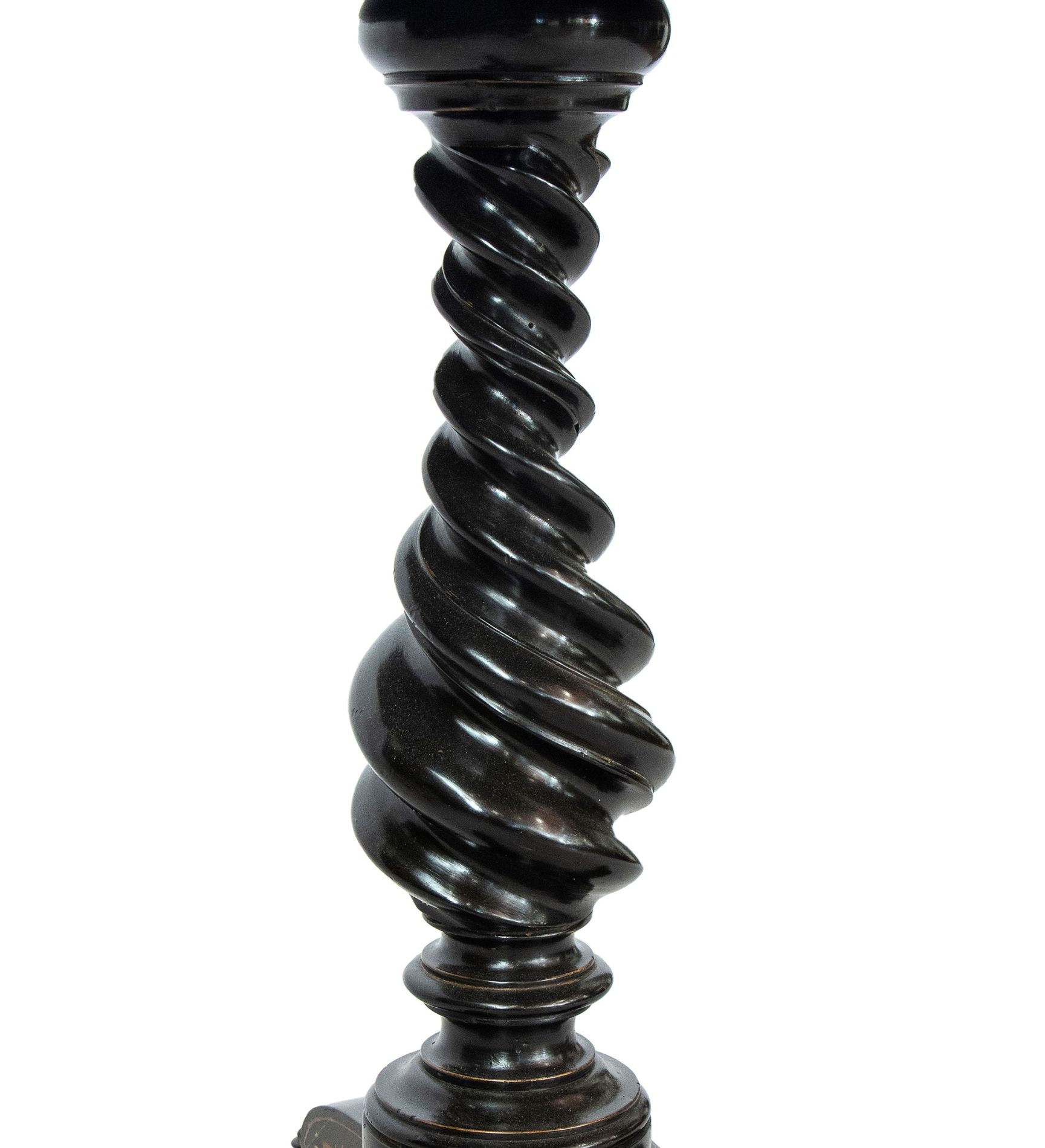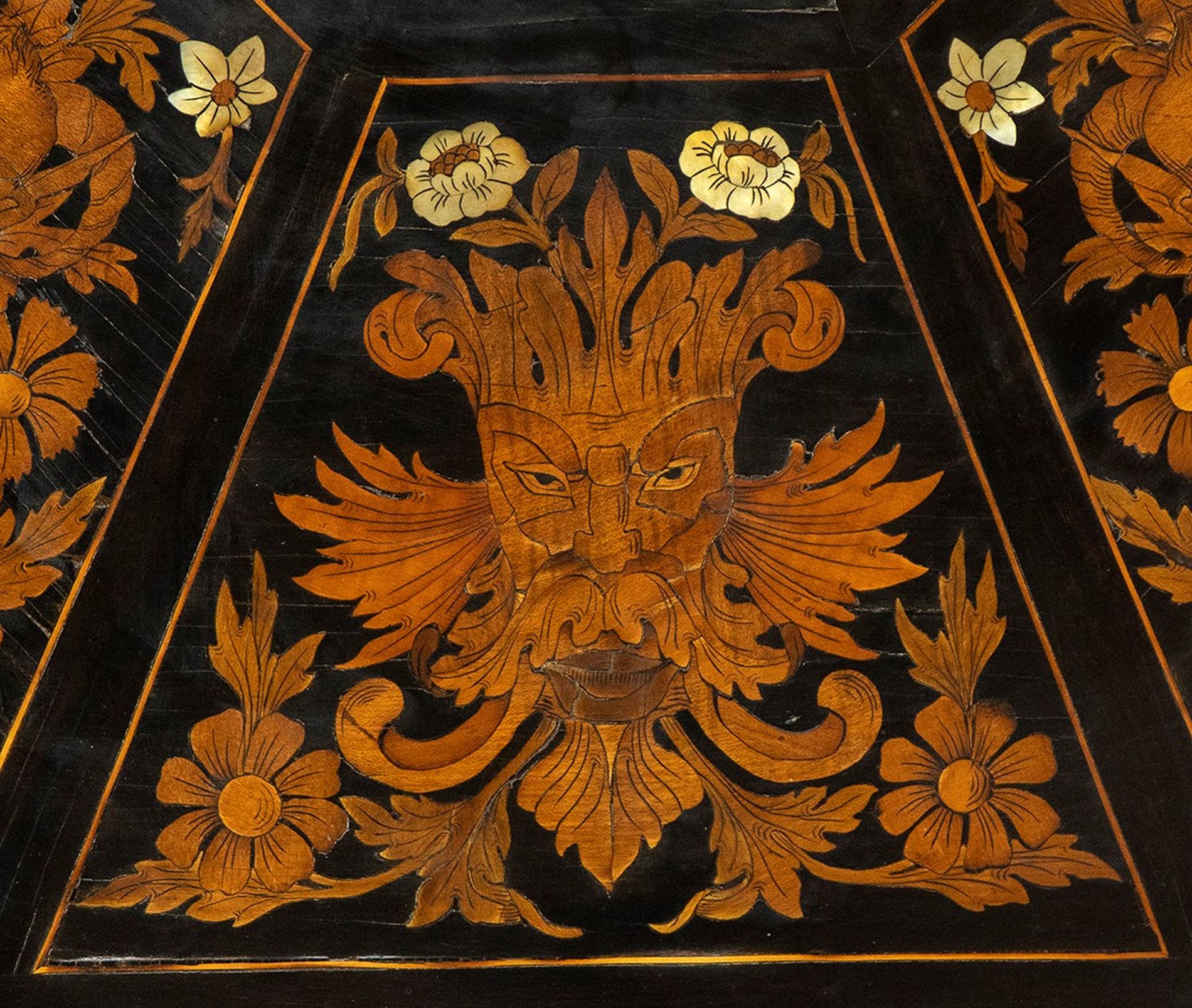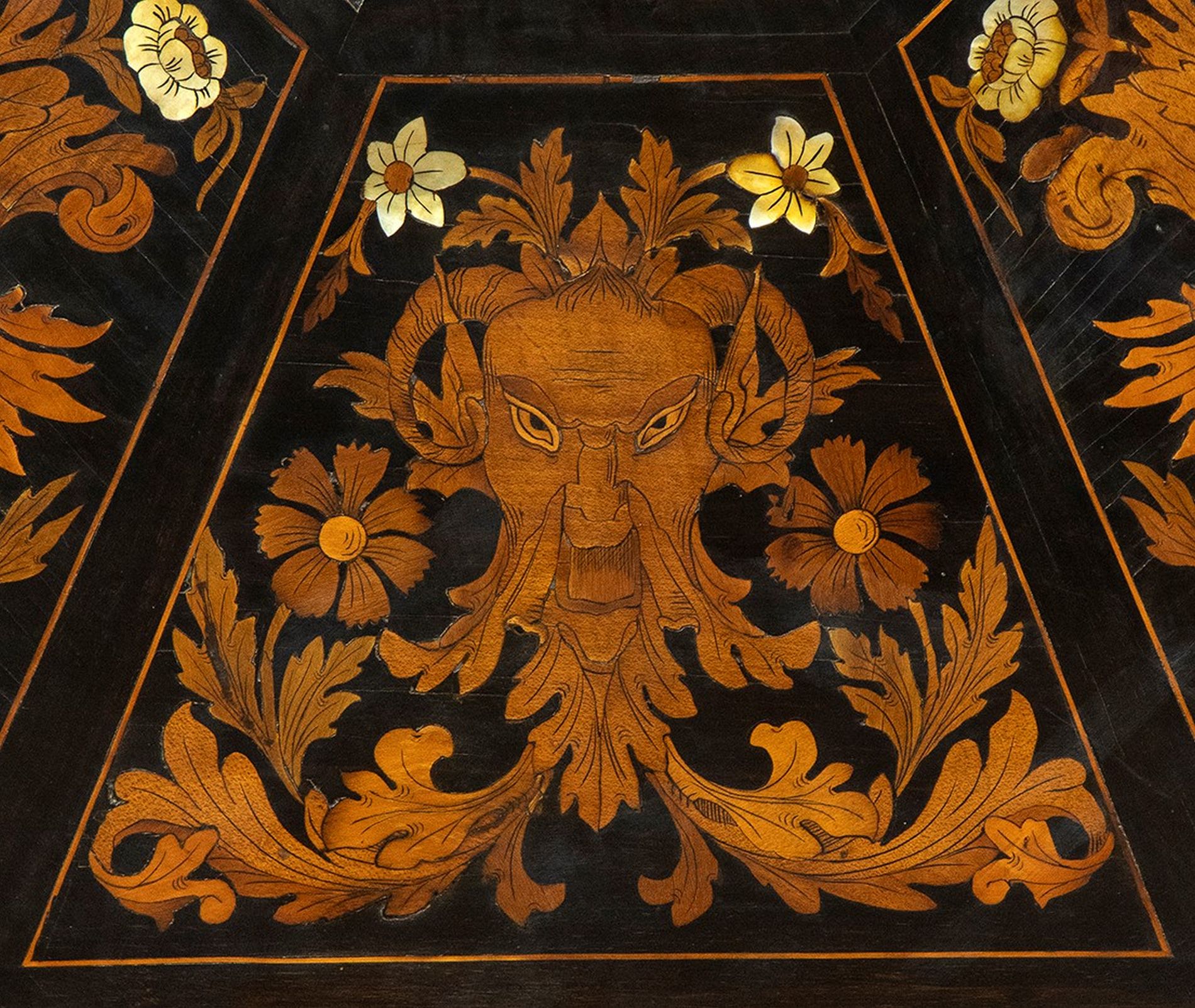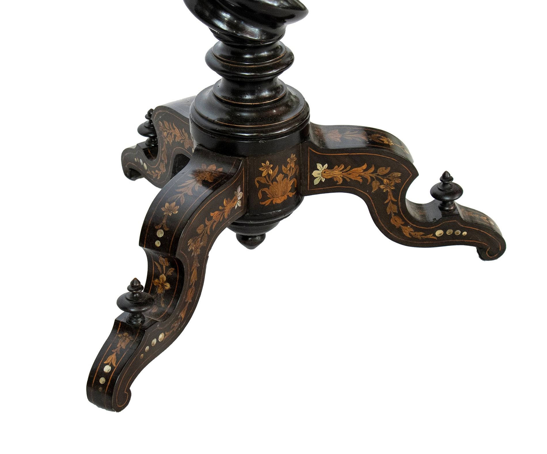 Tavolo ottagonale intarsiato - Toscana, XIX secolo, ambito FALCINI intarsiato in madre perla e legni di frutta alla maniera di Giuseppe Arcimboldo, sorretto da gamba a torciglione poggiante su base ottagonale rialzata su quattro piedini; il piano è ribaltabile a vela.