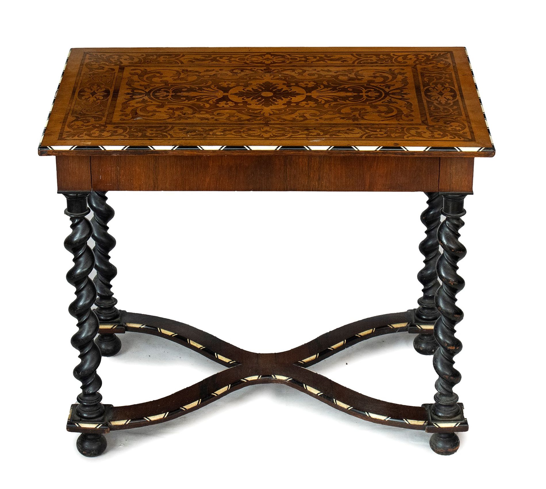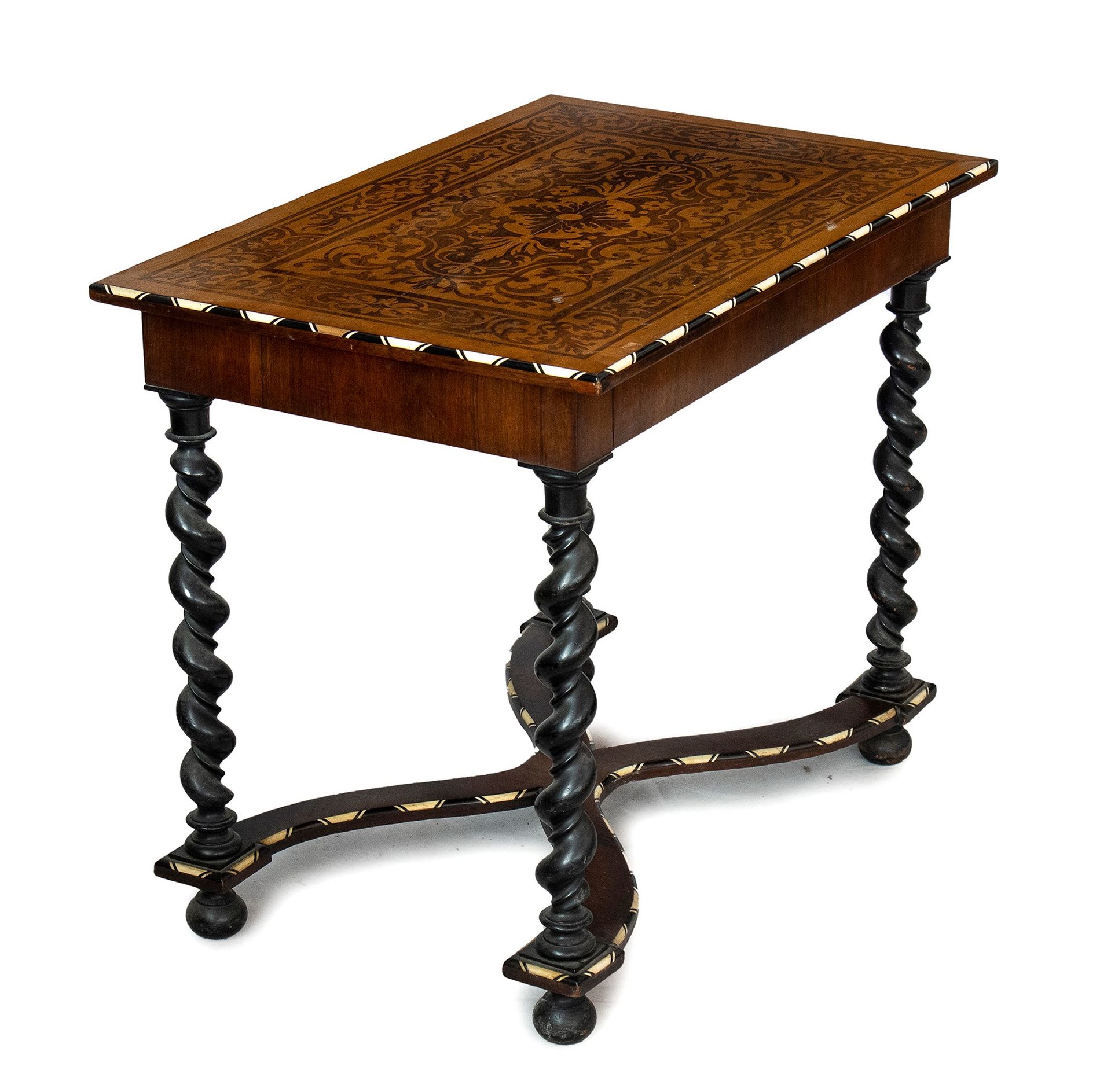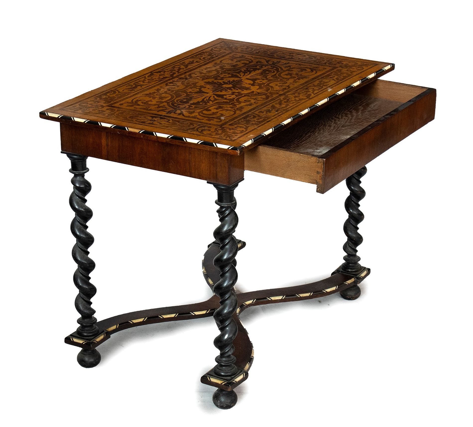 Tavolino intarsiato - Lombardia, XIX secolo in legno di noce ebanizzato con intarsi in legni di frutto ed osso. Il piano risulta completamente intarsiato, sulla fascia sottopiano è presente un cassetto, le gambe sono a torciglione unite da una crociera in legno intarsiata.