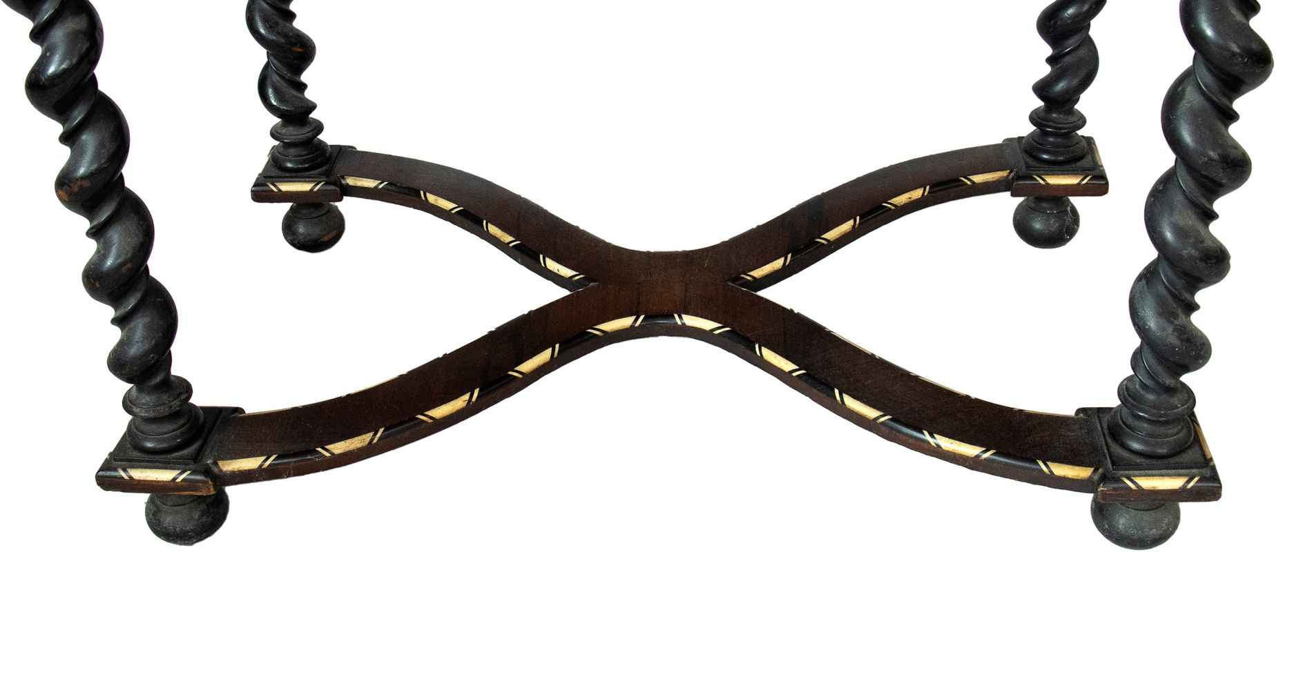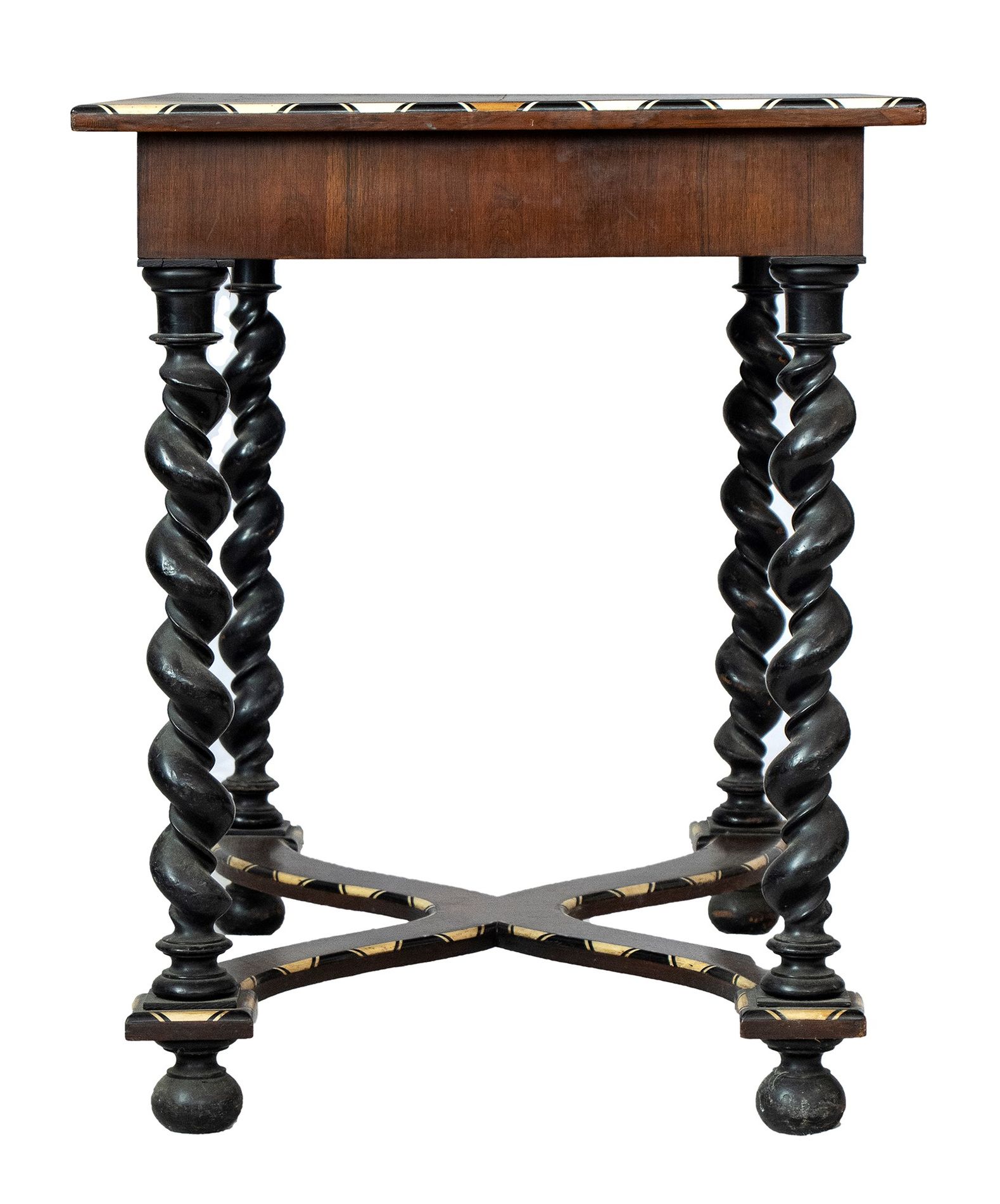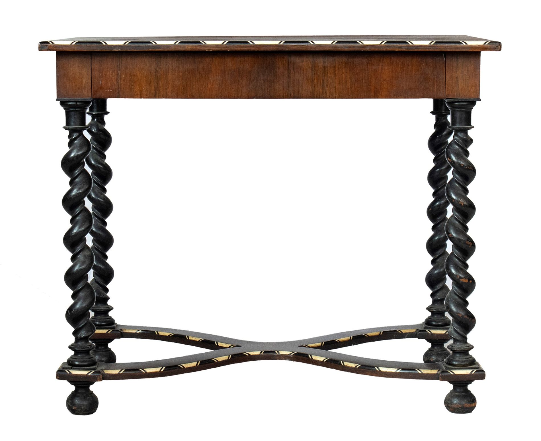 Tavolino intarsiato - Lombardia, XIX secolo in legno di noce ebanizzato con intarsi in legni di frutto ed osso. Il piano risulta completamente intarsiato, sulla fascia sottopiano è presente un cassetto, le gambe sono a torciglione unite da una crociera in legno intarsiata.