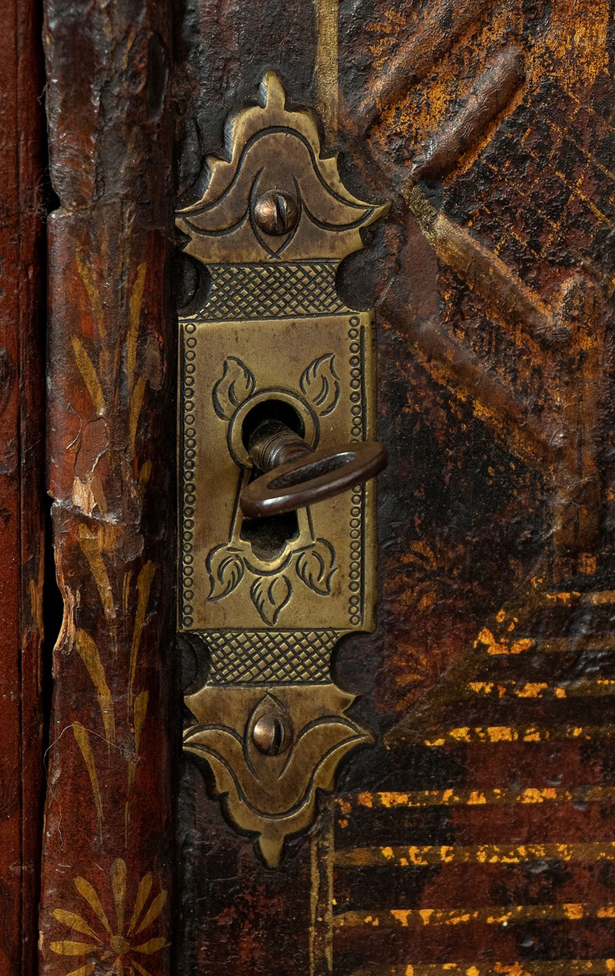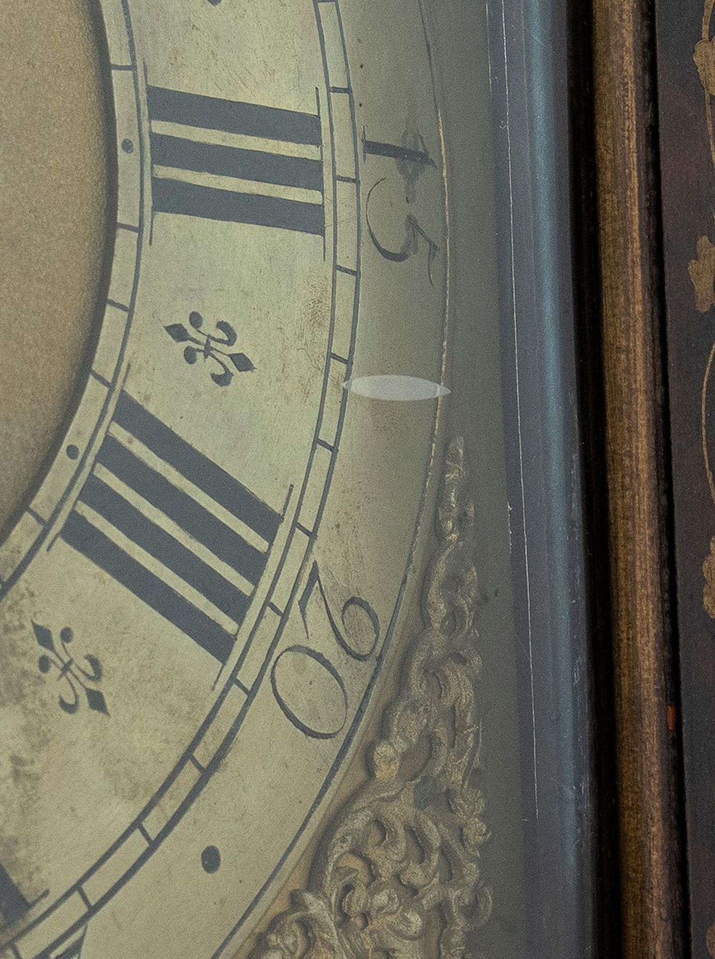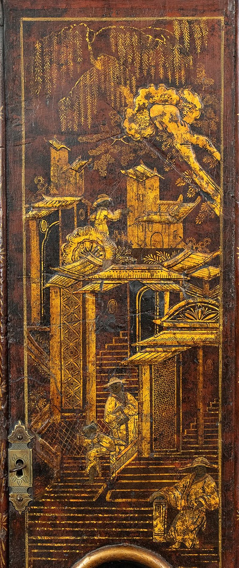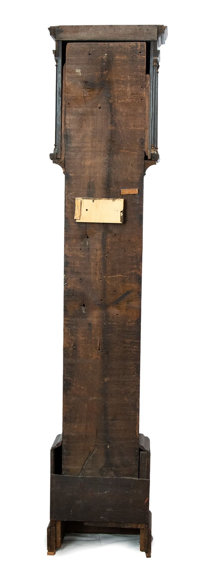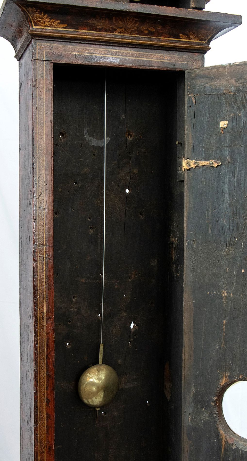 Orologio a torre a cineserie - Inghilterra, Giorgio I, 1690 circa cassa interamente laccata con scene di vita quotidiana orientale, quadrante circolare con numeri romani e datario. Regolatore a pendolo e suoneria delle ore e delle mezze su campana.
