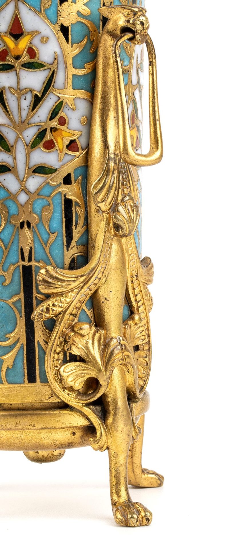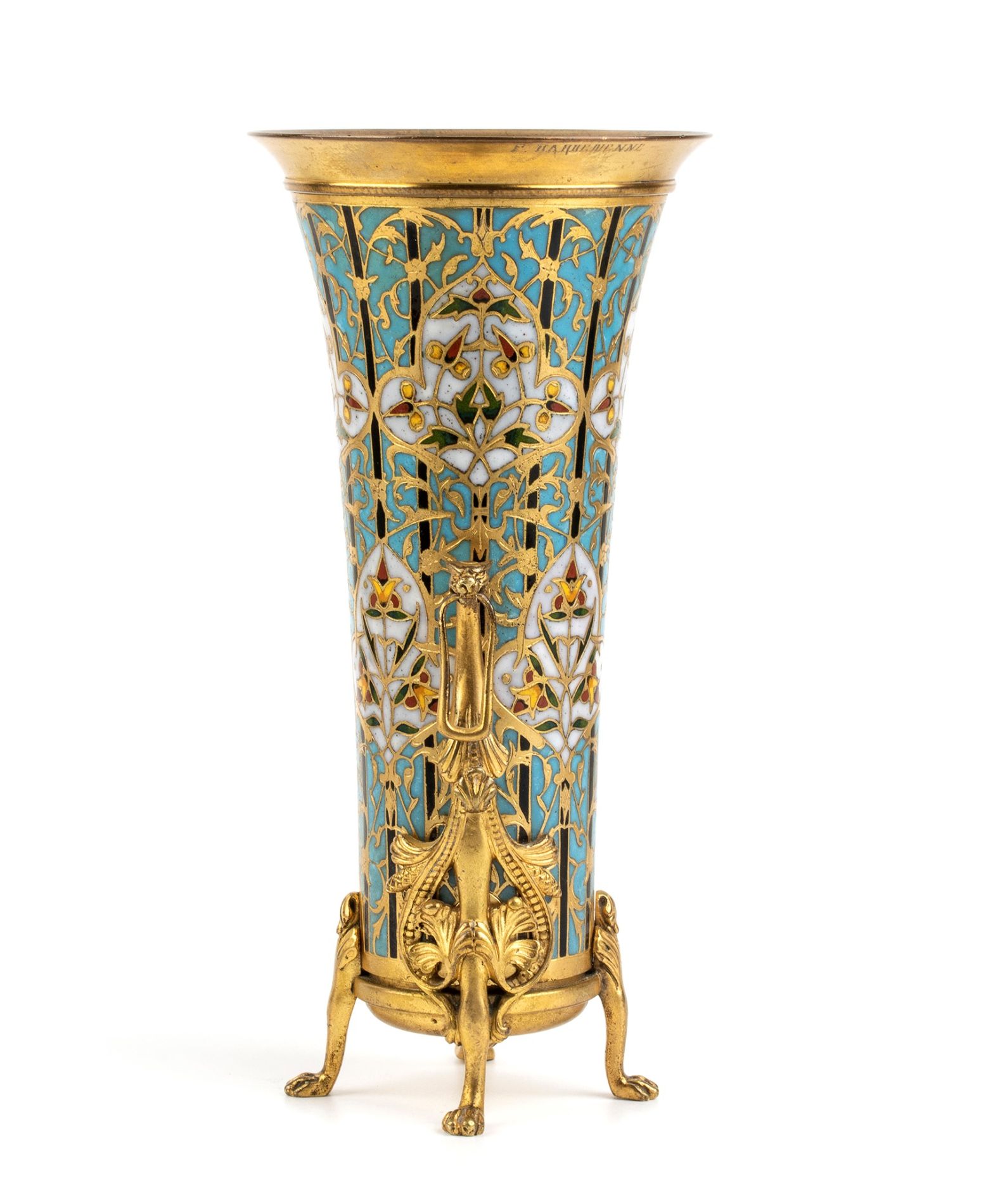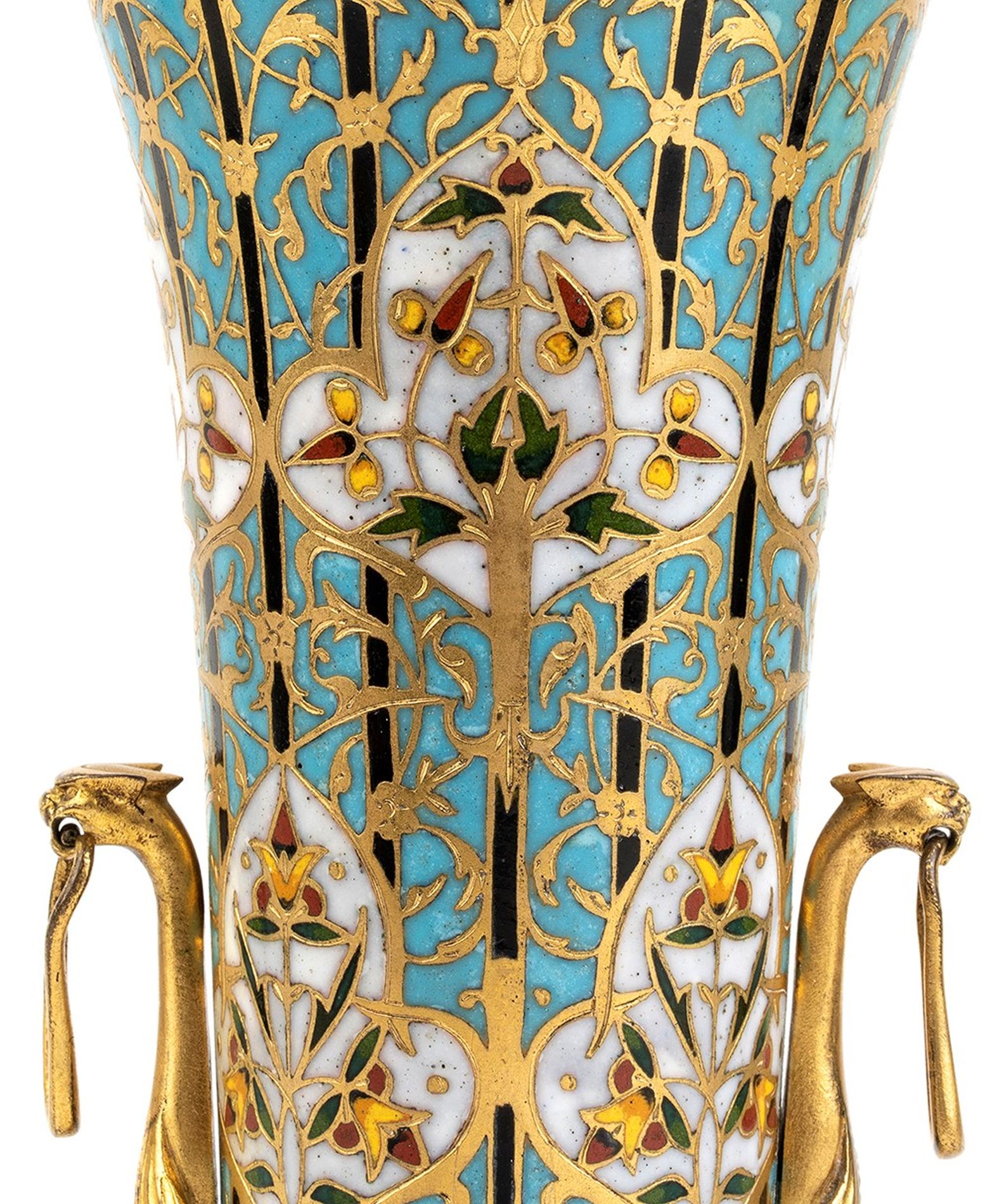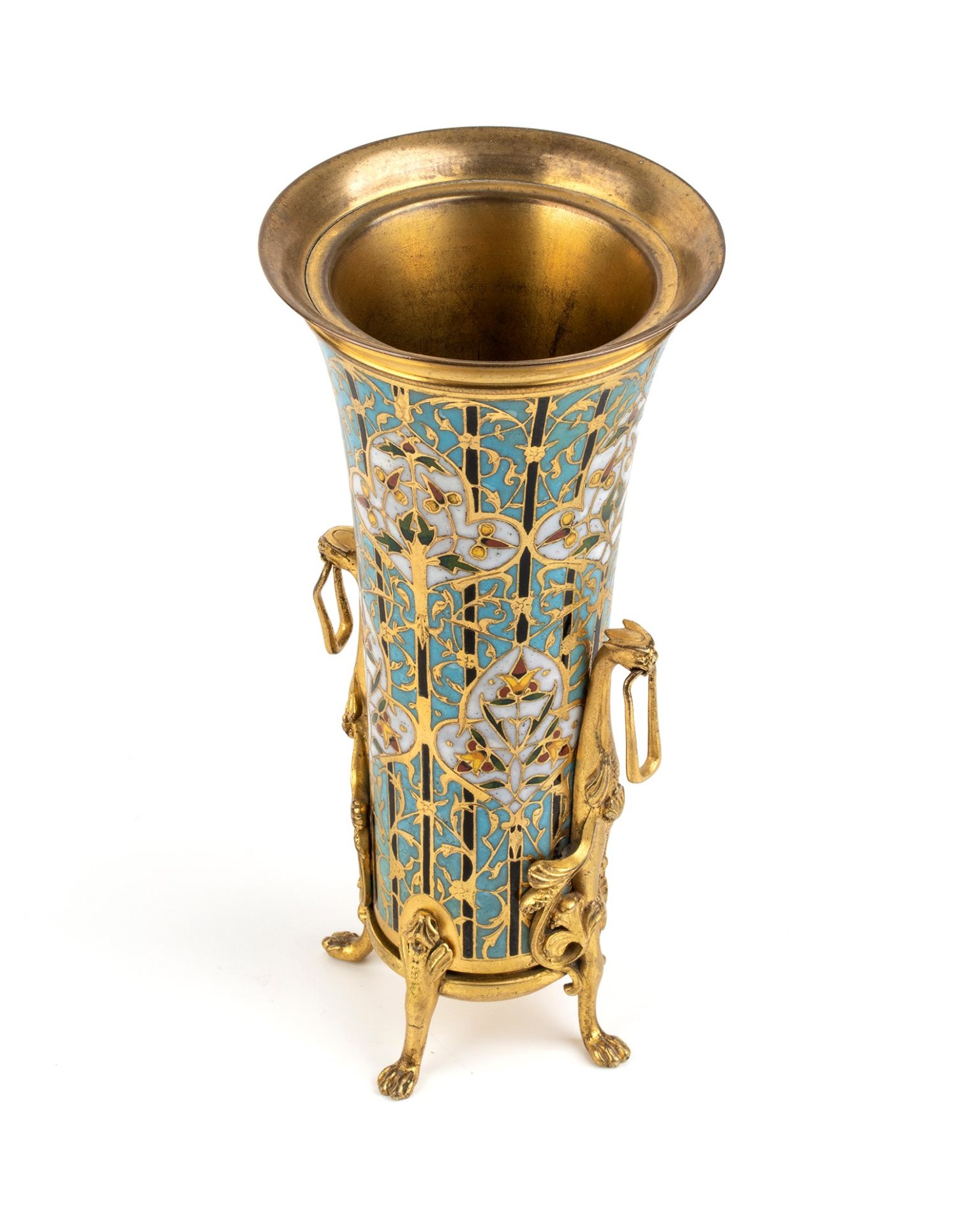 Vaso francese in bronzo e smalticon smalti policromi - FERDINAND BARBEDIENNE (1810 - 1892) Questo eccezionale vaso è probabilmente il risultato della collaborazione tra Louis Constant Sevin, disegnatore e progettista, e Ferdinand Barbedienne, bronzista e fondatore dell'omonima famosa fonderia del XIX secolo. Questo vaso è molto simile a un modello presentato nello stand di Barbedienne durante l'Esposizione Internazionale di Londra del 1862.