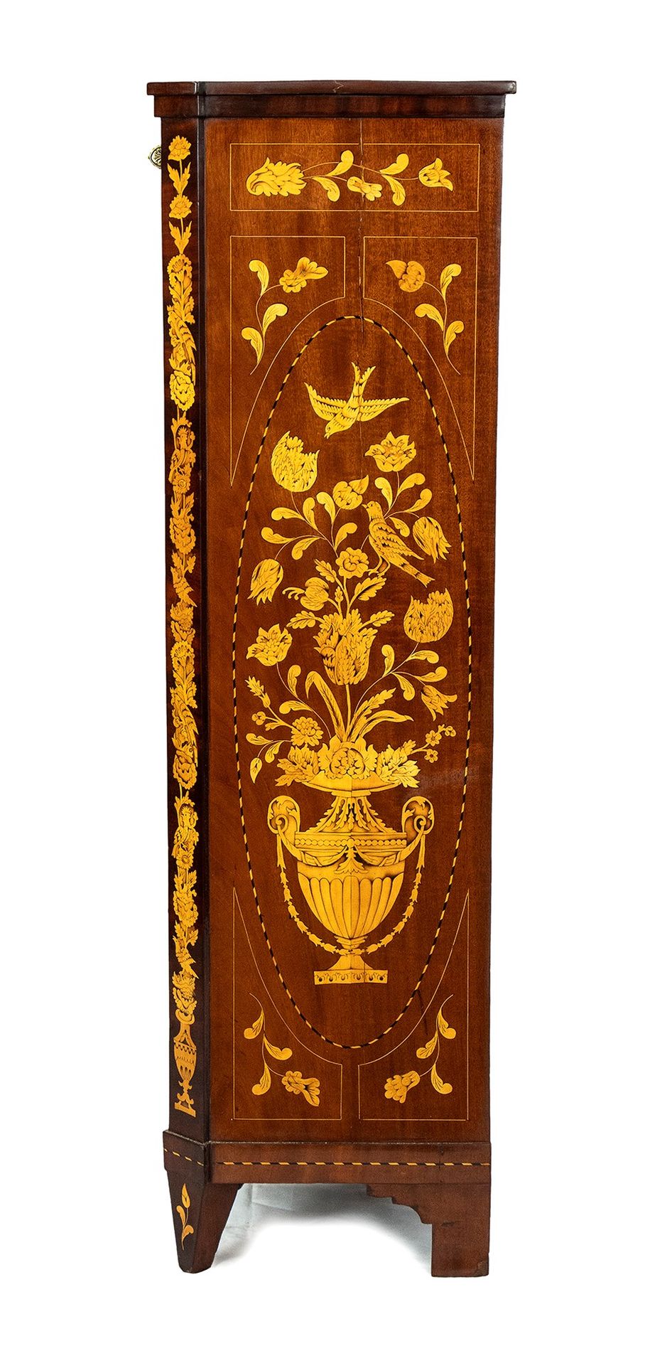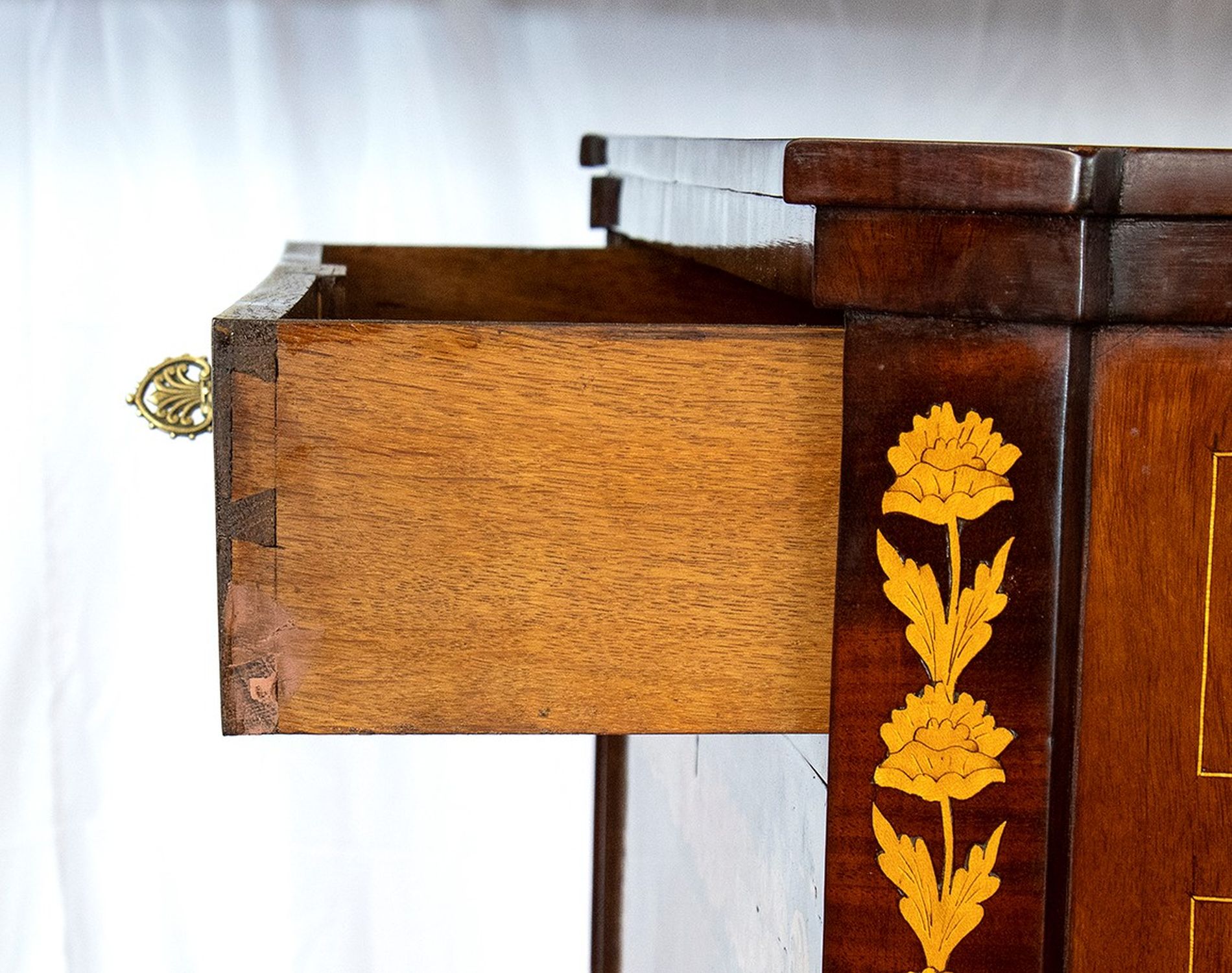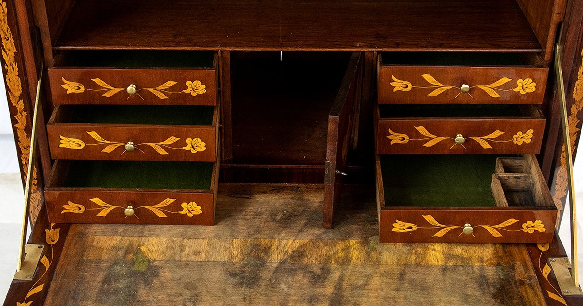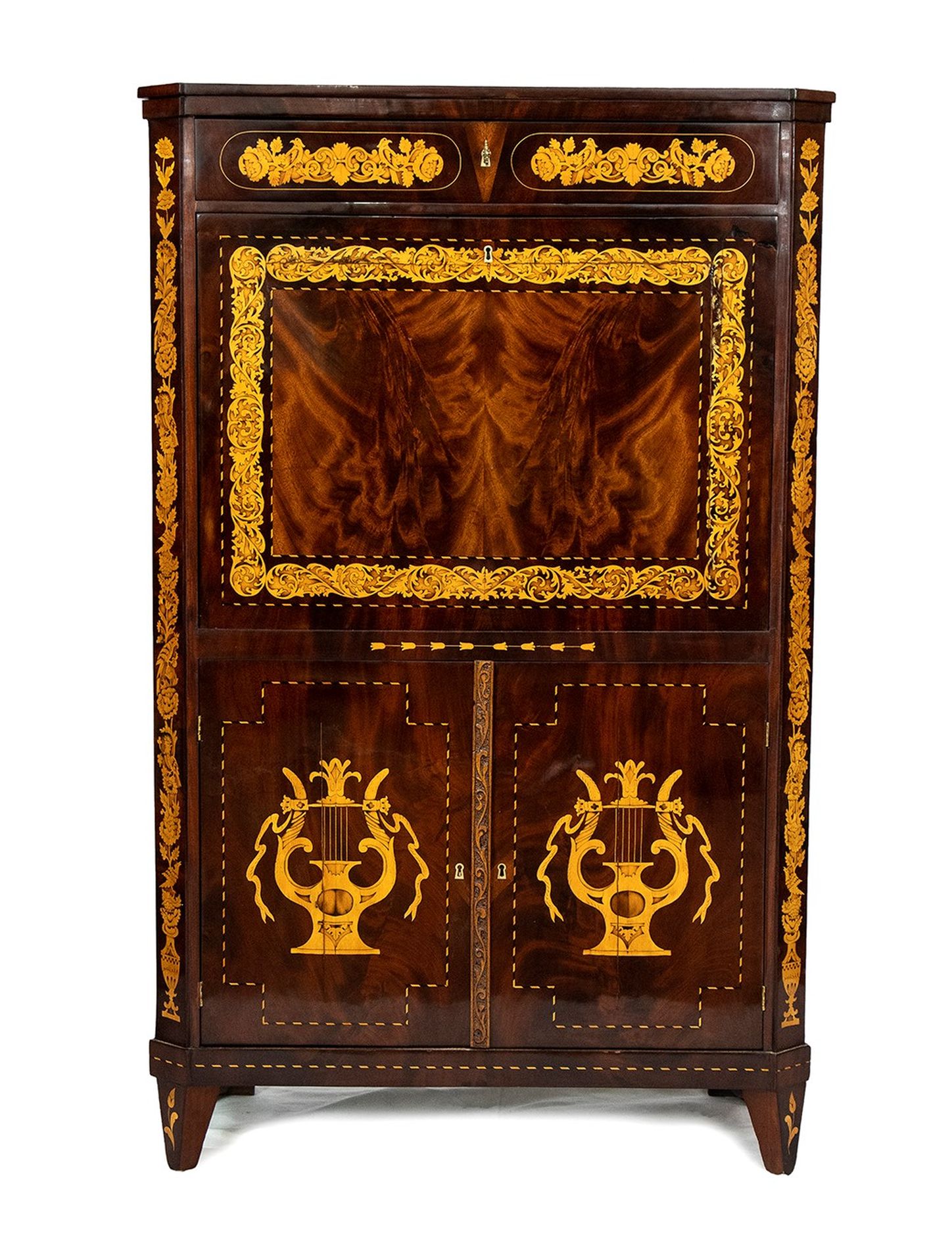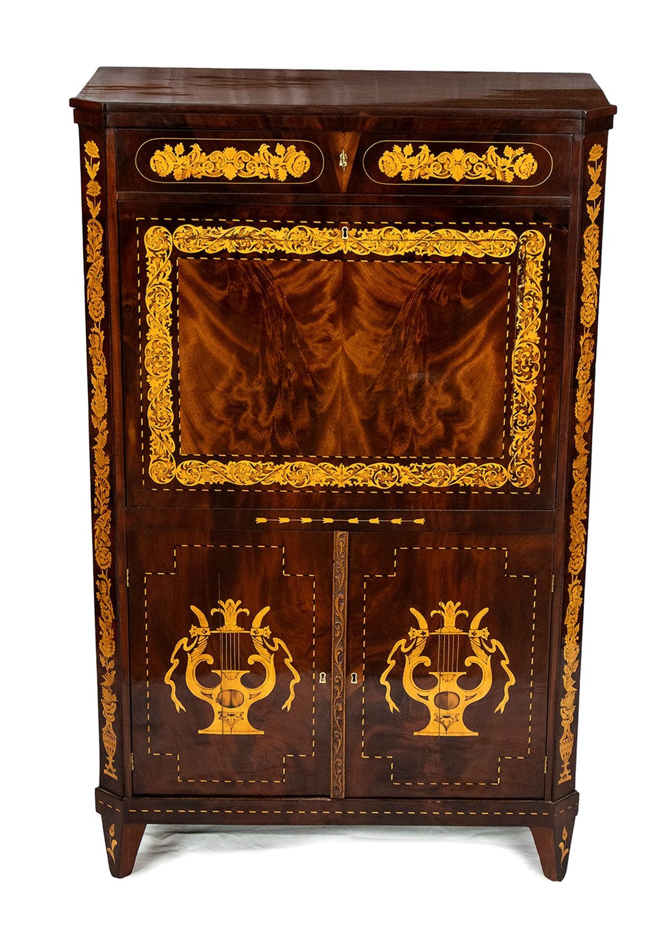 Secretaire Carlo X in mogano intarsiato - Olanda, XIX secolo in mogano con intarsi floreali in legno di acero, a due ante nella parte inferiore con ribalta superiore e cassetto sotto il piano superiore; ferramenta originale.