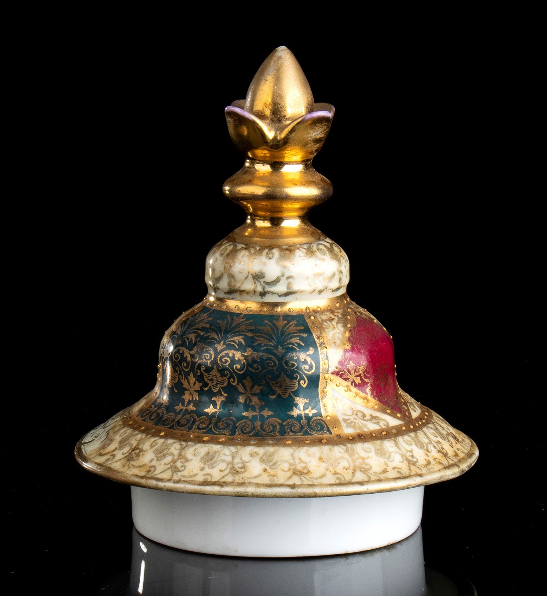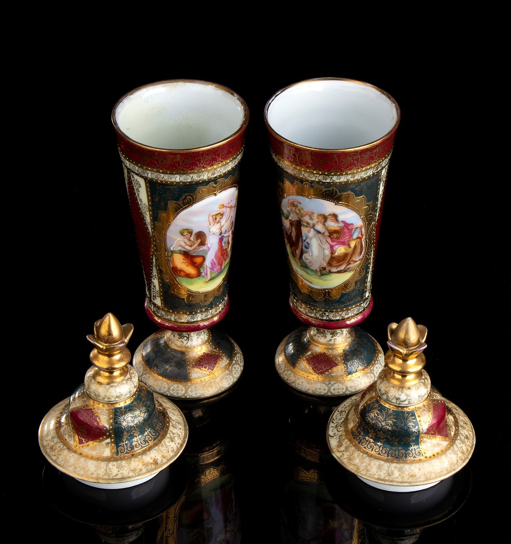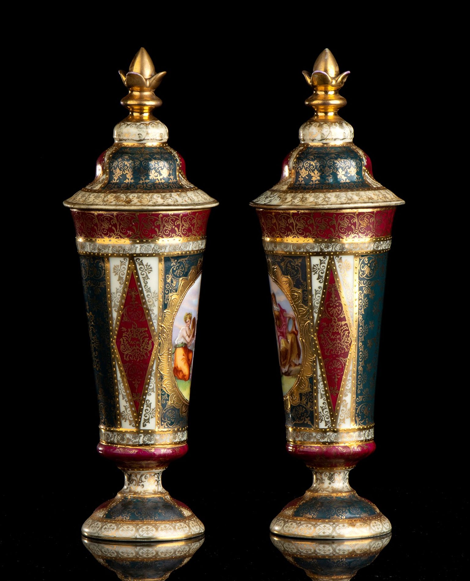 Coppia di vasi dipinti e dorati - VIENNA, 1870 circa, con coperchio, base circolare e corpo troncoconico; dipinti e dorati.