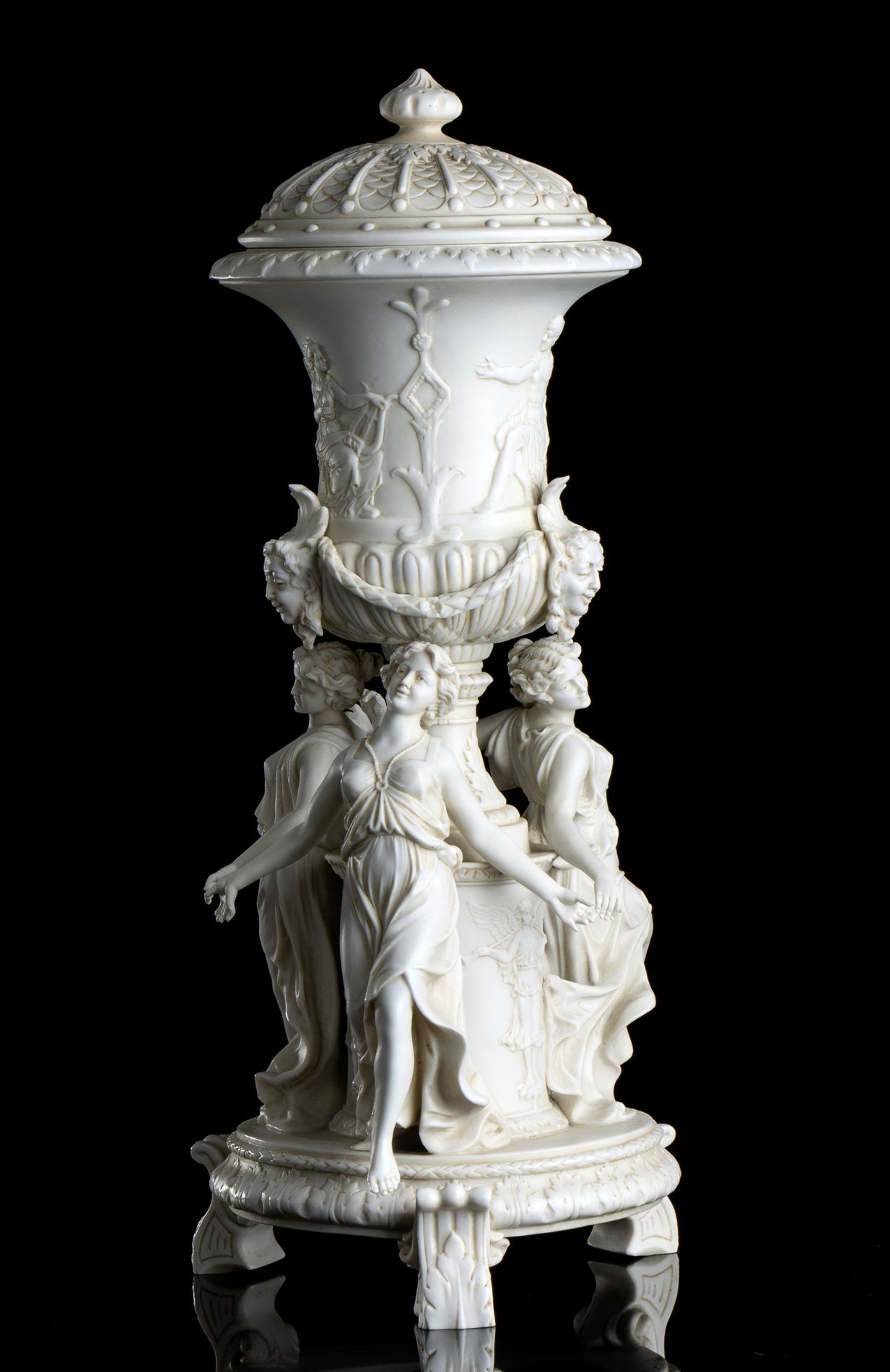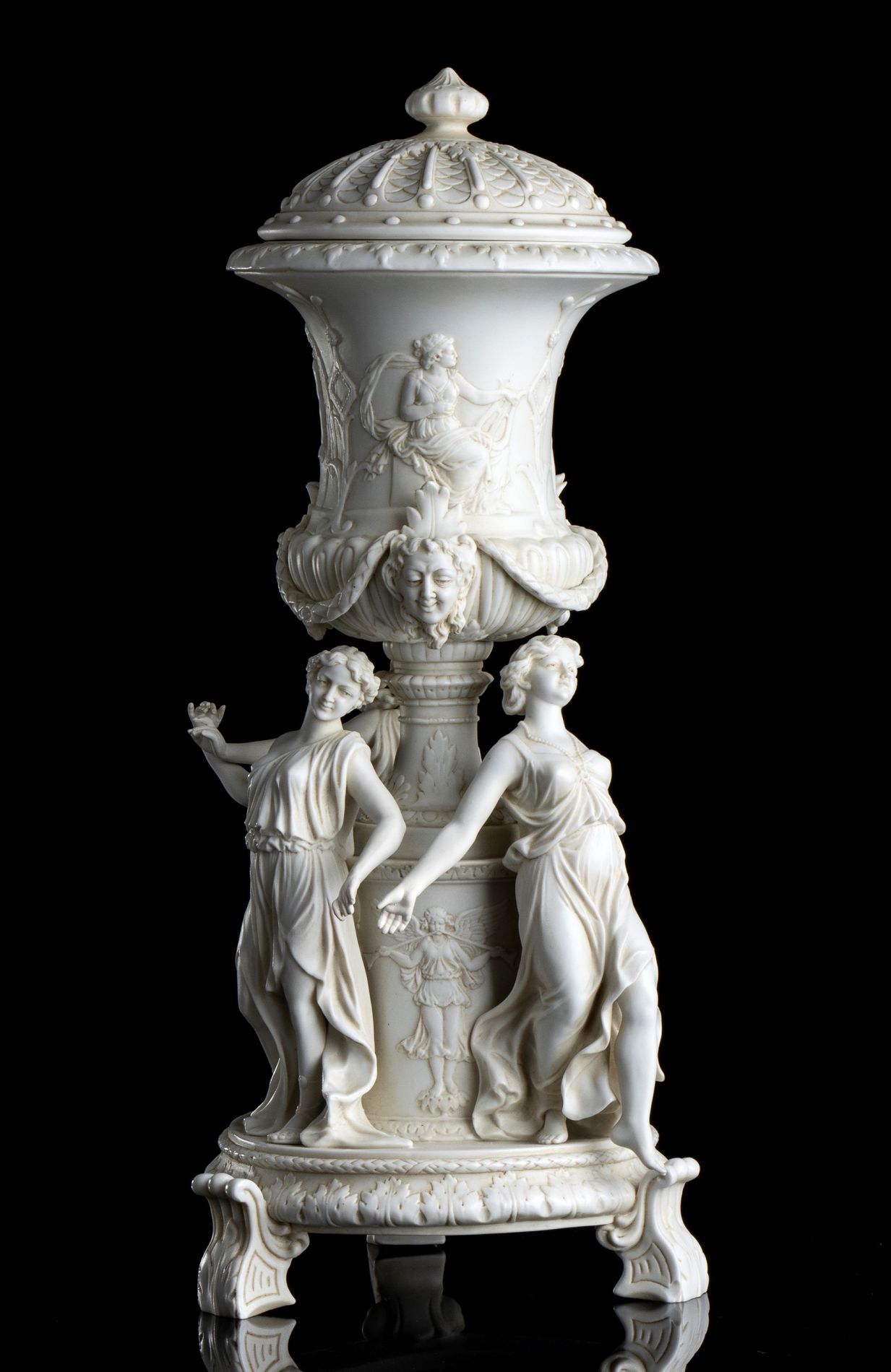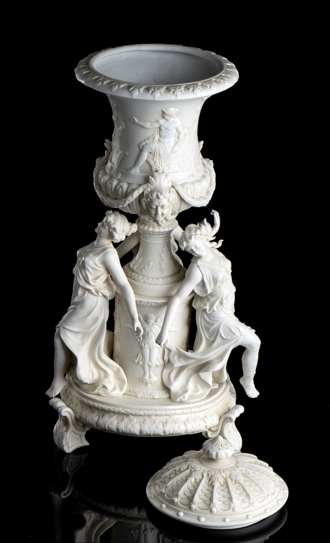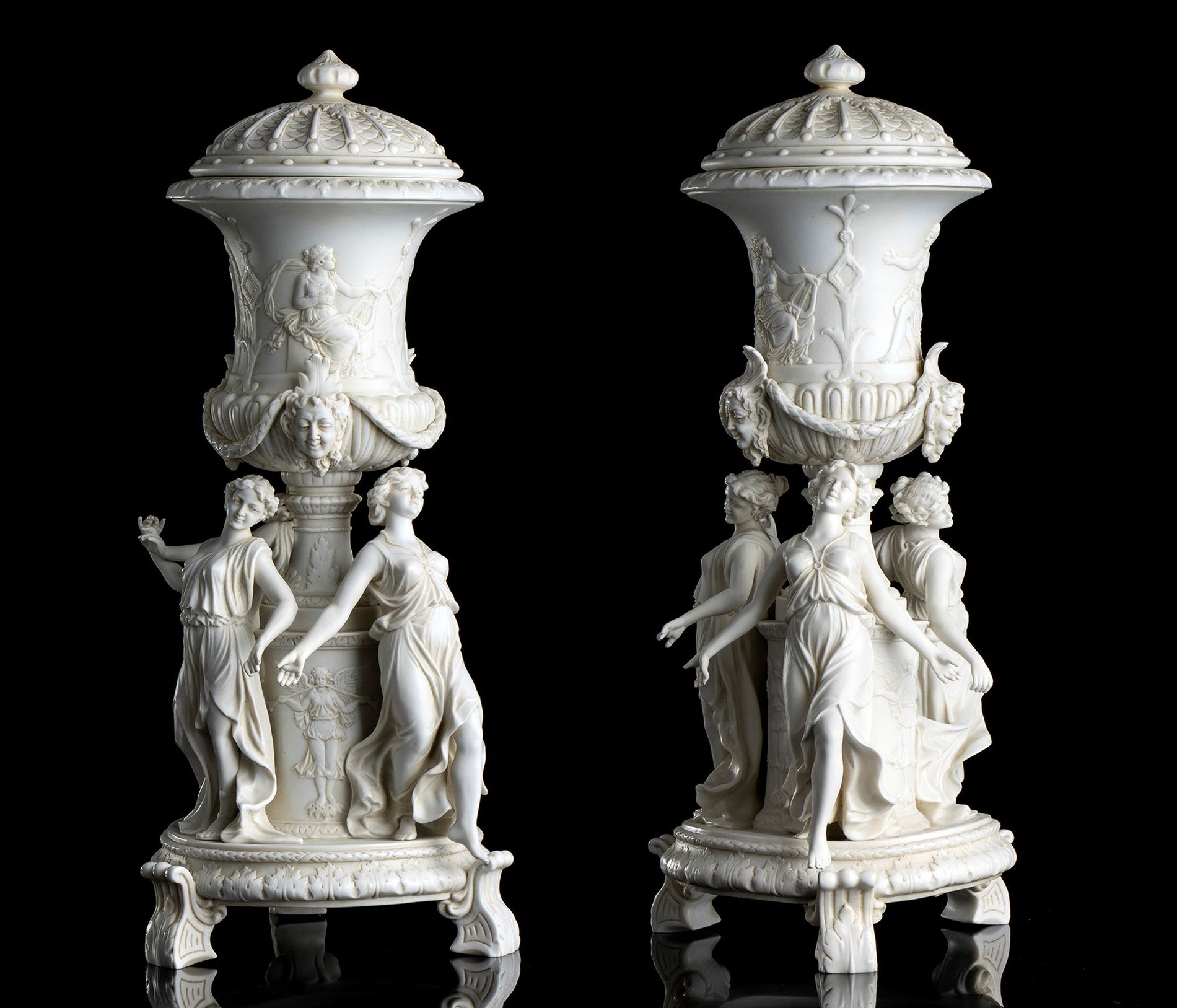 Coppia di coppe con coperchio Napoleone III in porcellana biscuit - Francia, XIX secolo basamento con tre figure femminili raffiguranti le tre grazie, coppe con maschere femminili alternate a festoni e figure classiche, coperchio a cupola con presa centrale.