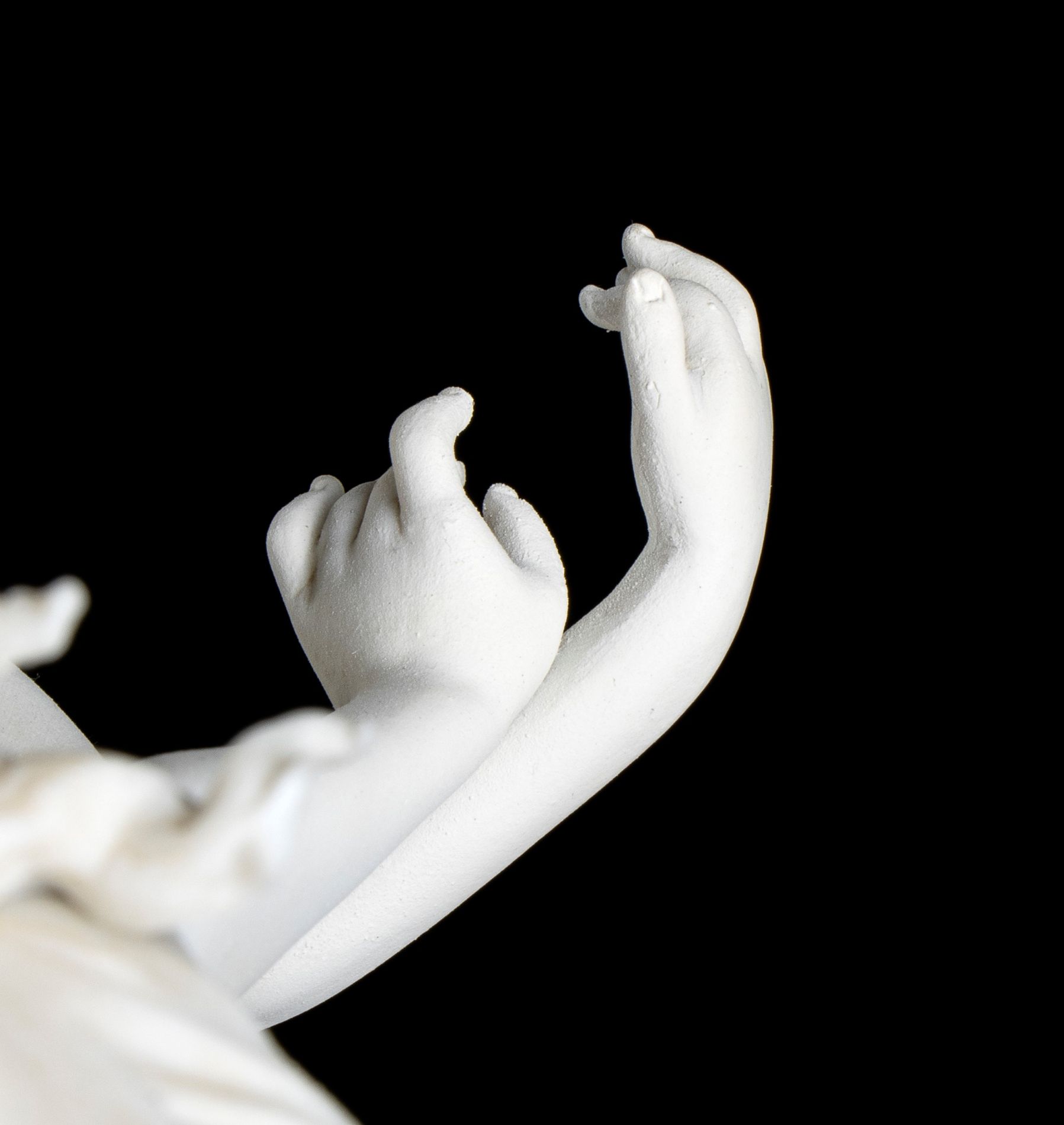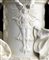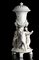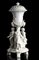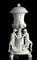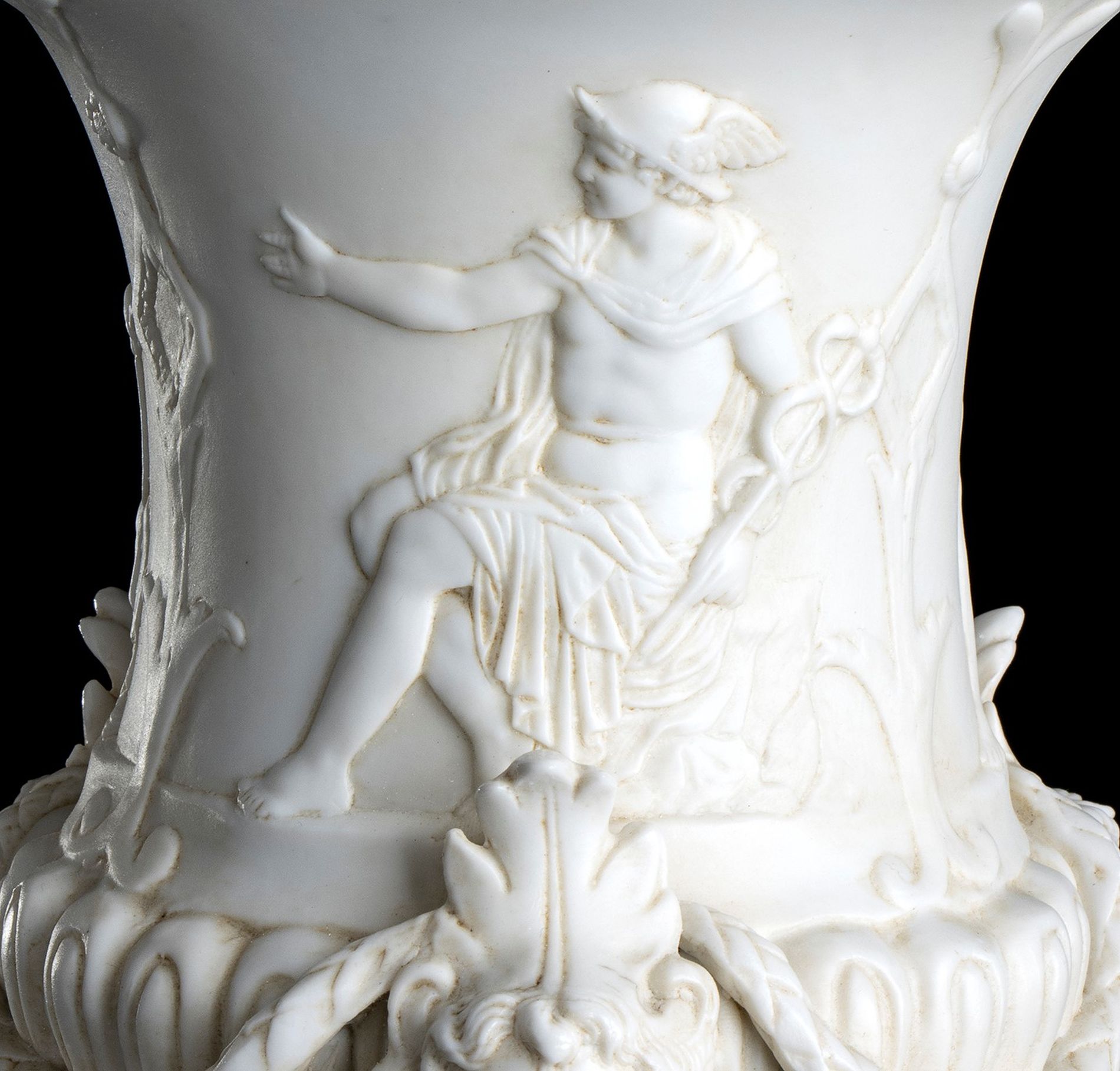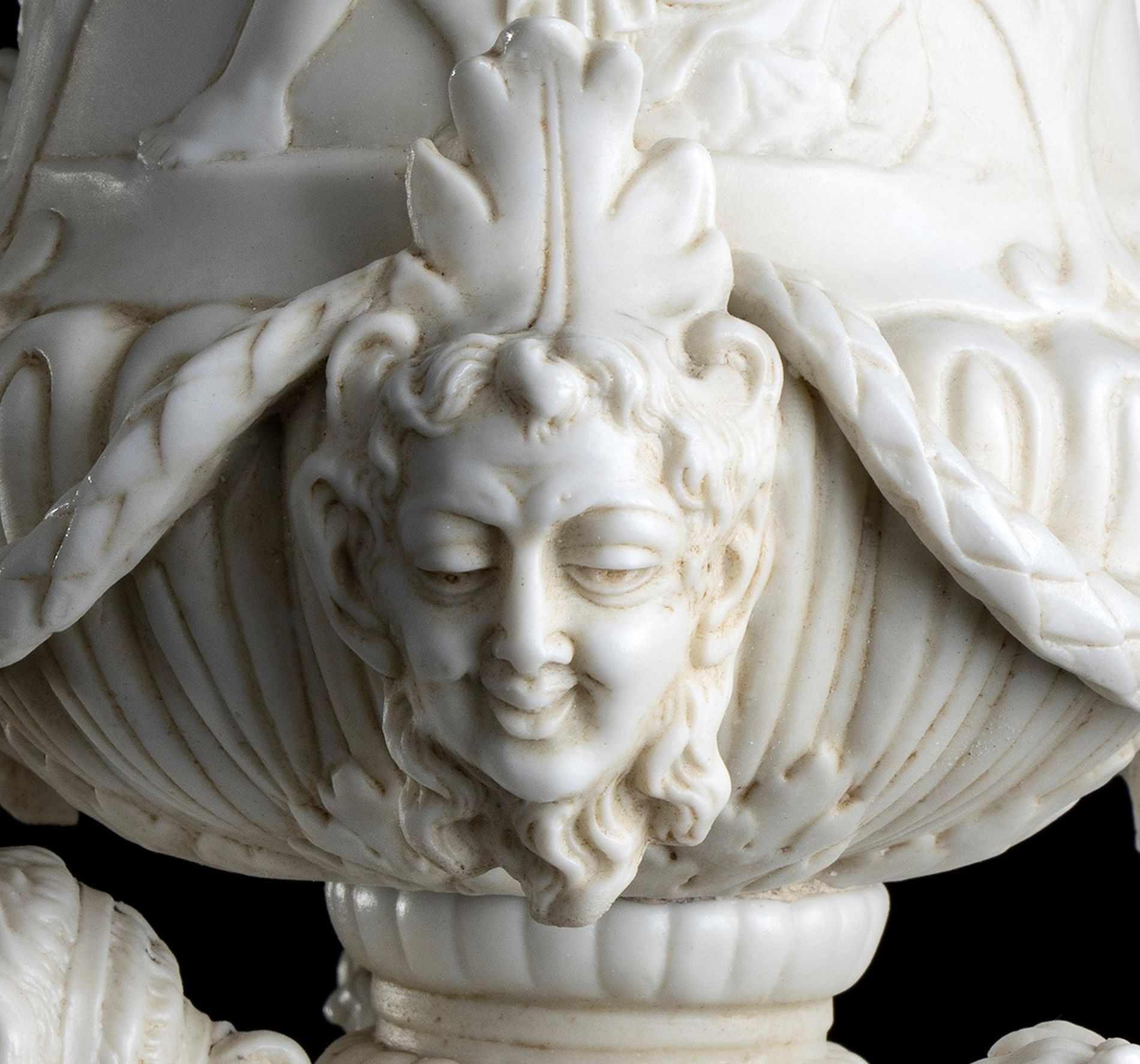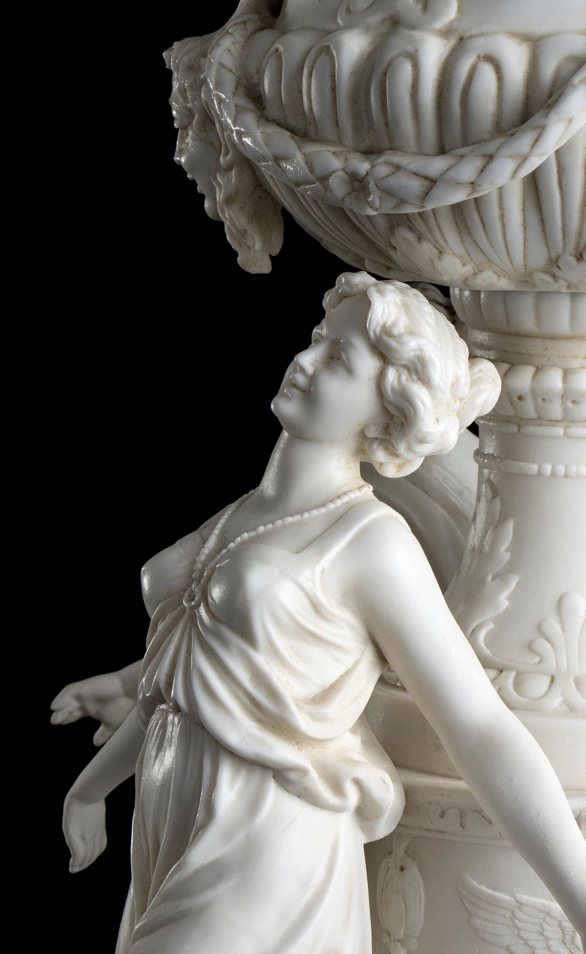 Coppia di coppe con coperchio Napoleone III in porcellana biscuit - Francia, XIX secolo basamento con tre figure femminili raffiguranti le tre grazie, coppe con maschere femminili alternate a festoni e figure classiche, coperchio a cupola con presa centrale.