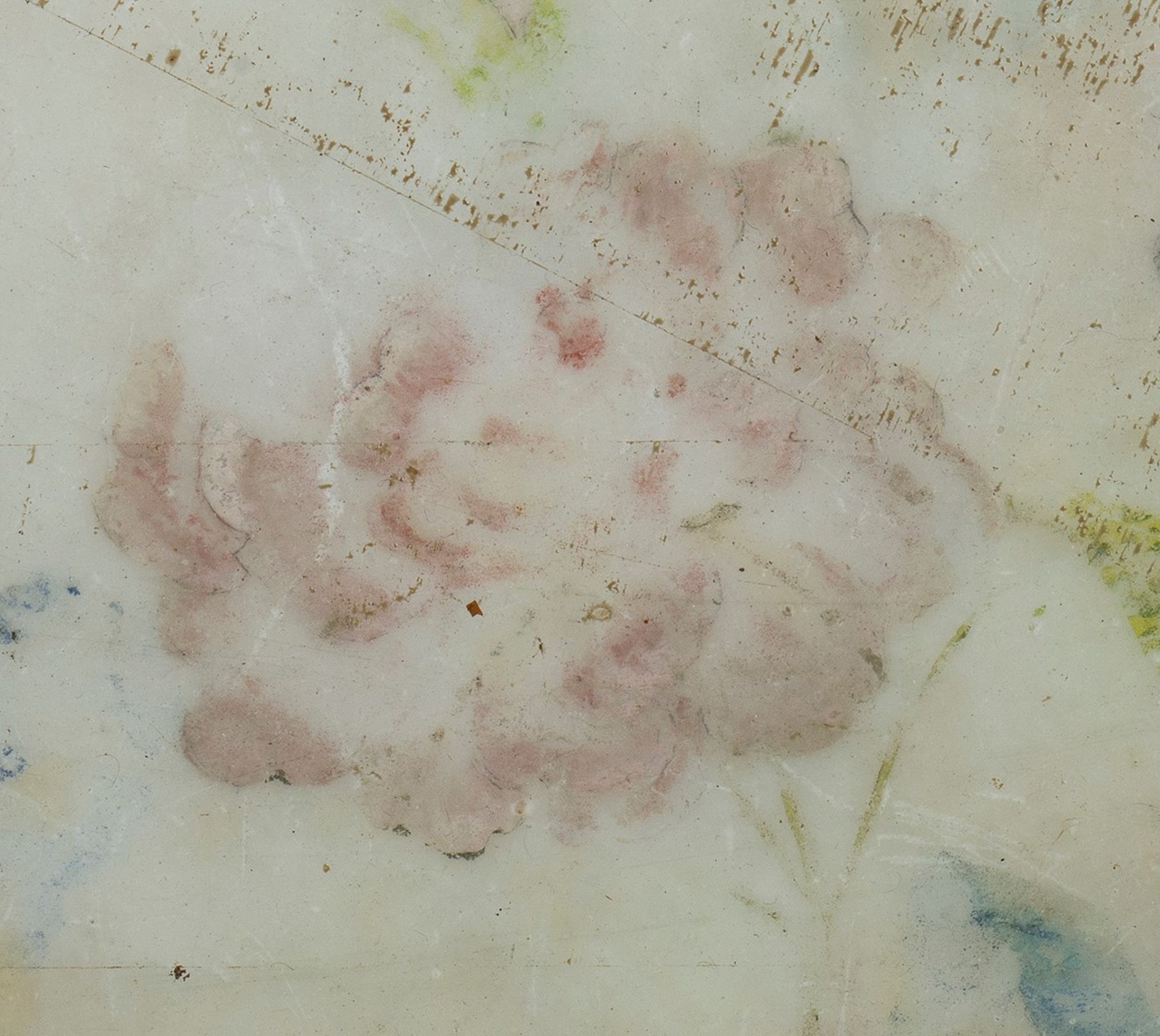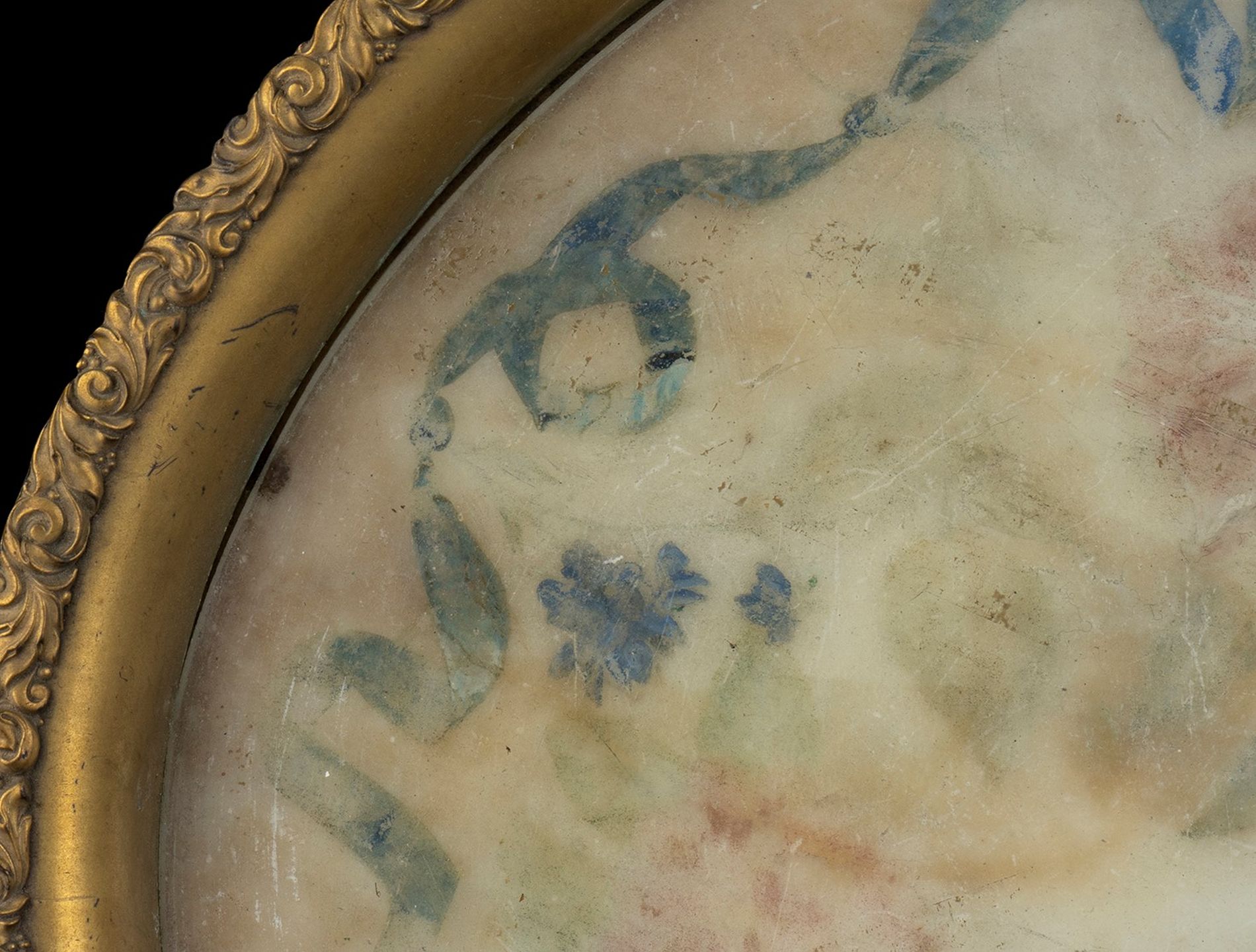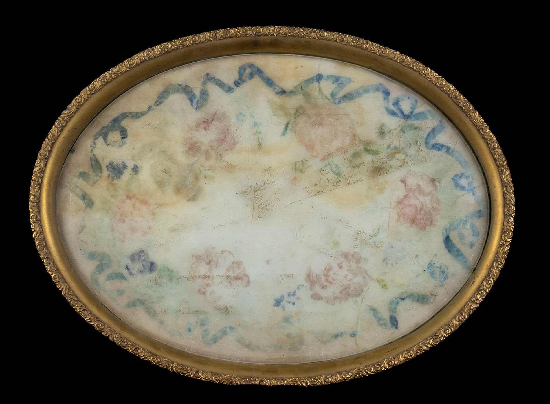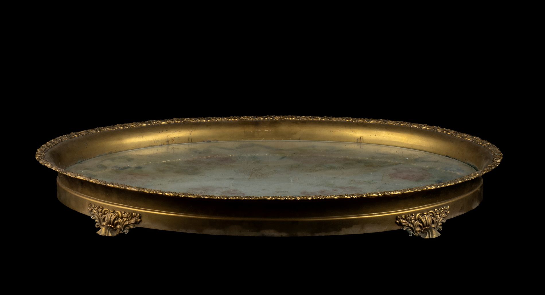 Vassoio in bronzo con piano in marmo - Francia, prima metà del XIX secolo di forma ovale con bordo perimetrale a decori vegetali; il piano in marmo, dipinto in policromia con fiori e nastri, è protetto da una lastra di vetro.