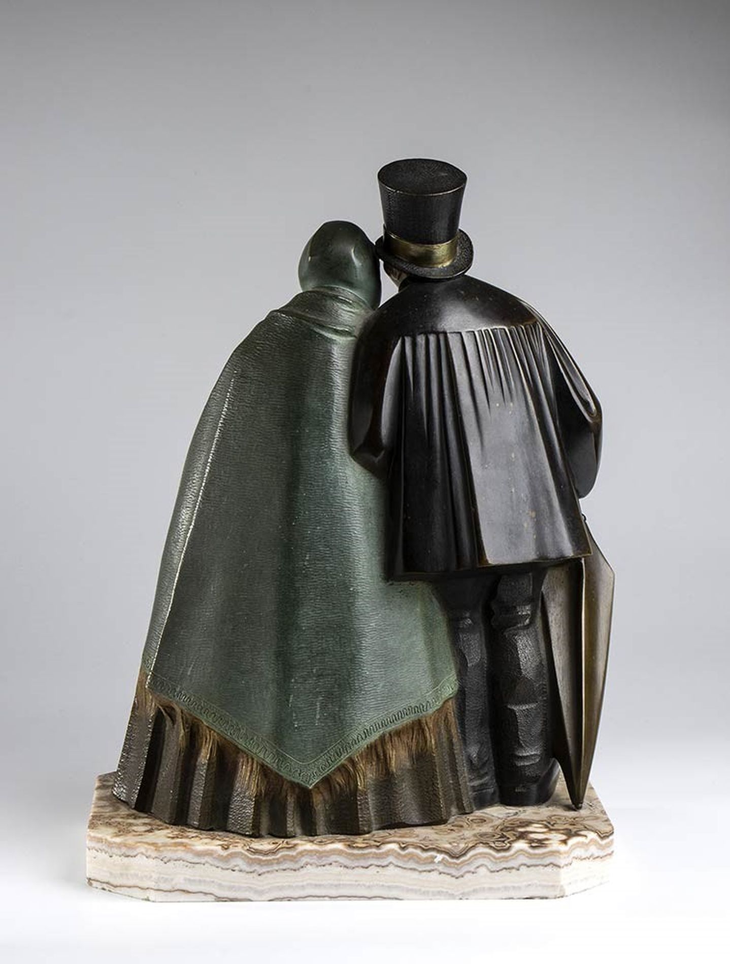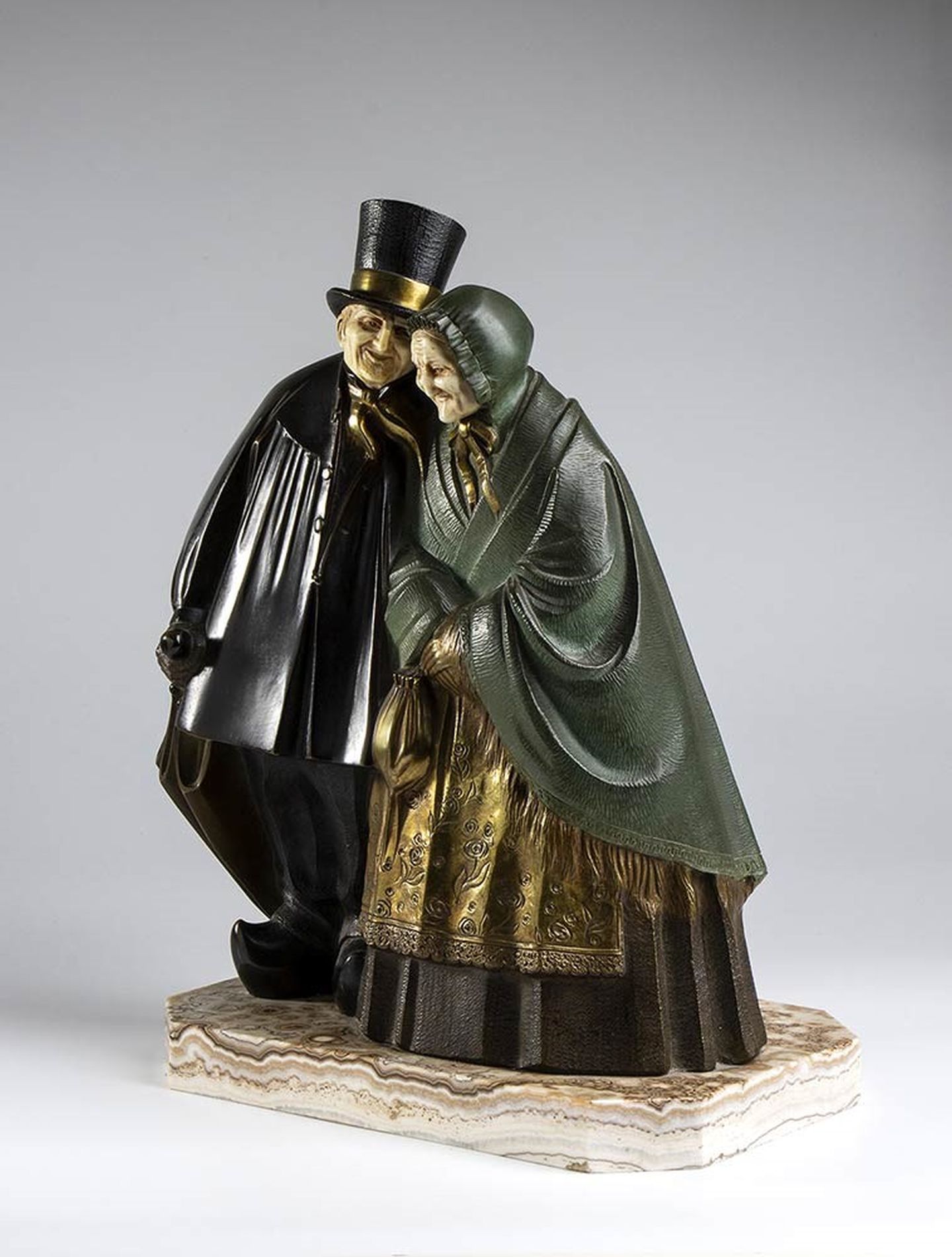 scultura criselefantina art déco raffigurante una coppia di di anziani abbracciati con viso in avorio di elefante (Loxodonta africana Blumenbach, 1797 o Elephas maximus Linnaeus, 1758) posti su un basamento in onice. Firmata alla base "Bequerel".