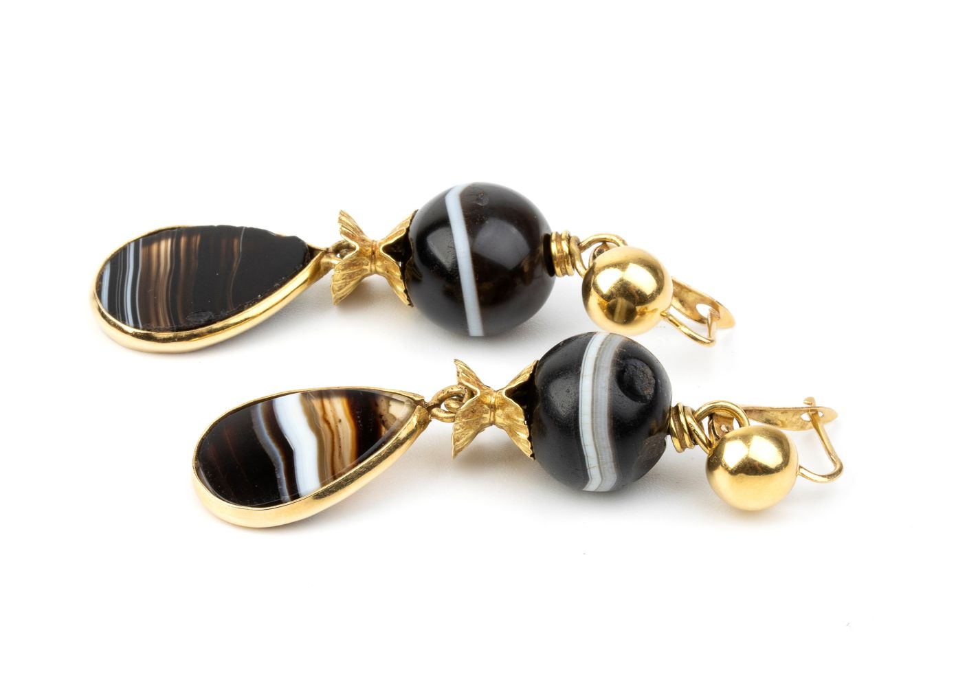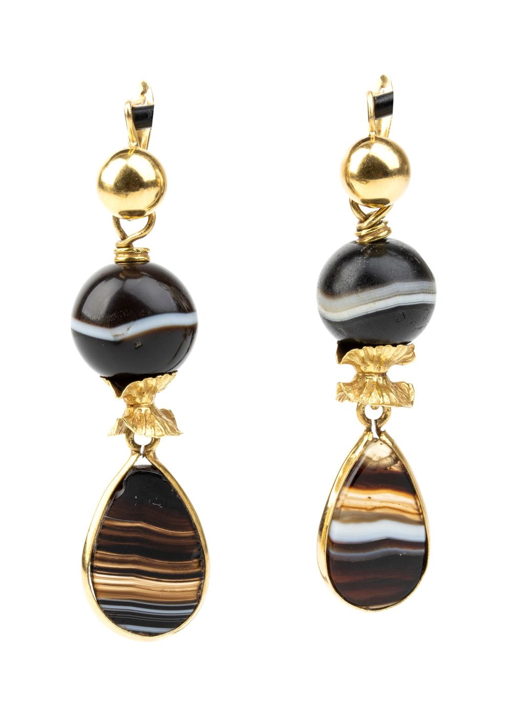 Paio di orecchini pendenti in oro giallo, agata ed onice