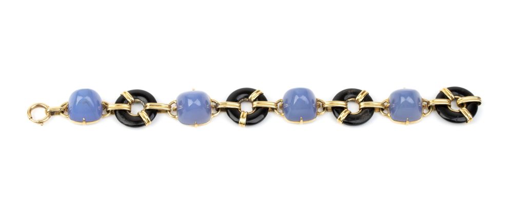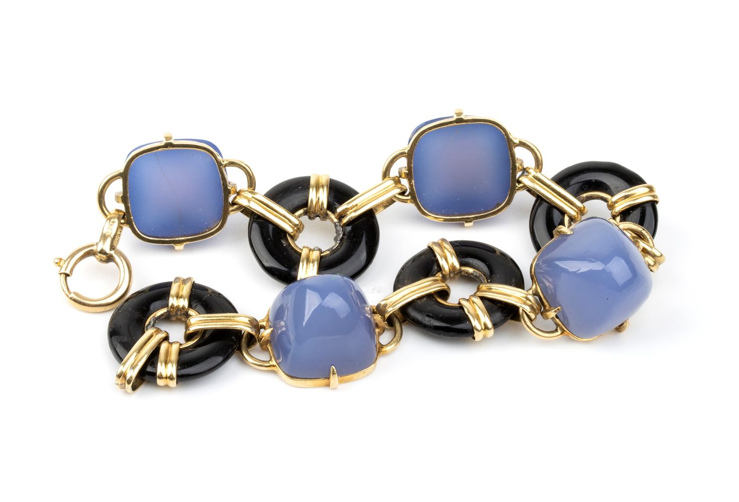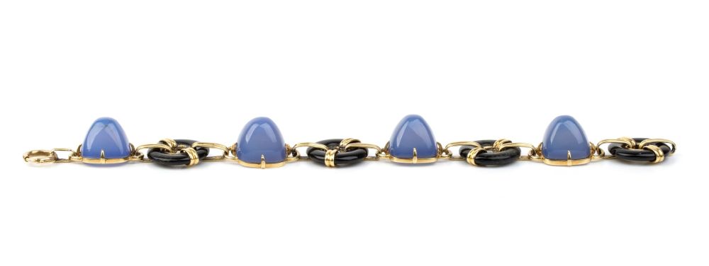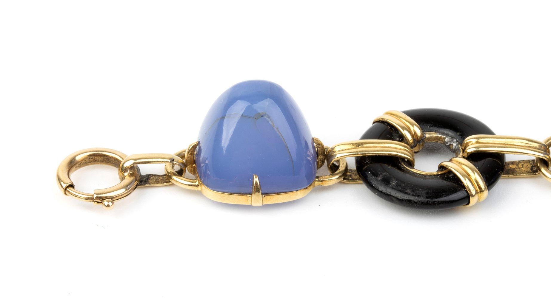 con catena a maglie in oro giallo incastonate con cabochon di calcedonio ed anelli di onice nero.