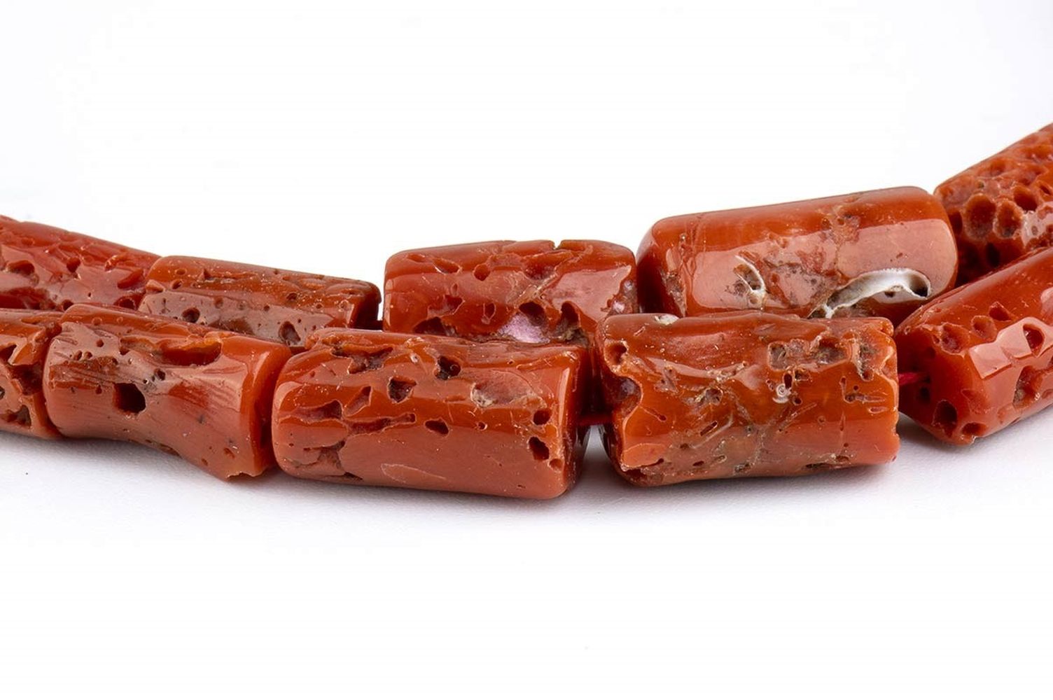 2 fili slegati di cilindretti di corallo grezzo Mediterraneo disposti in gradaz