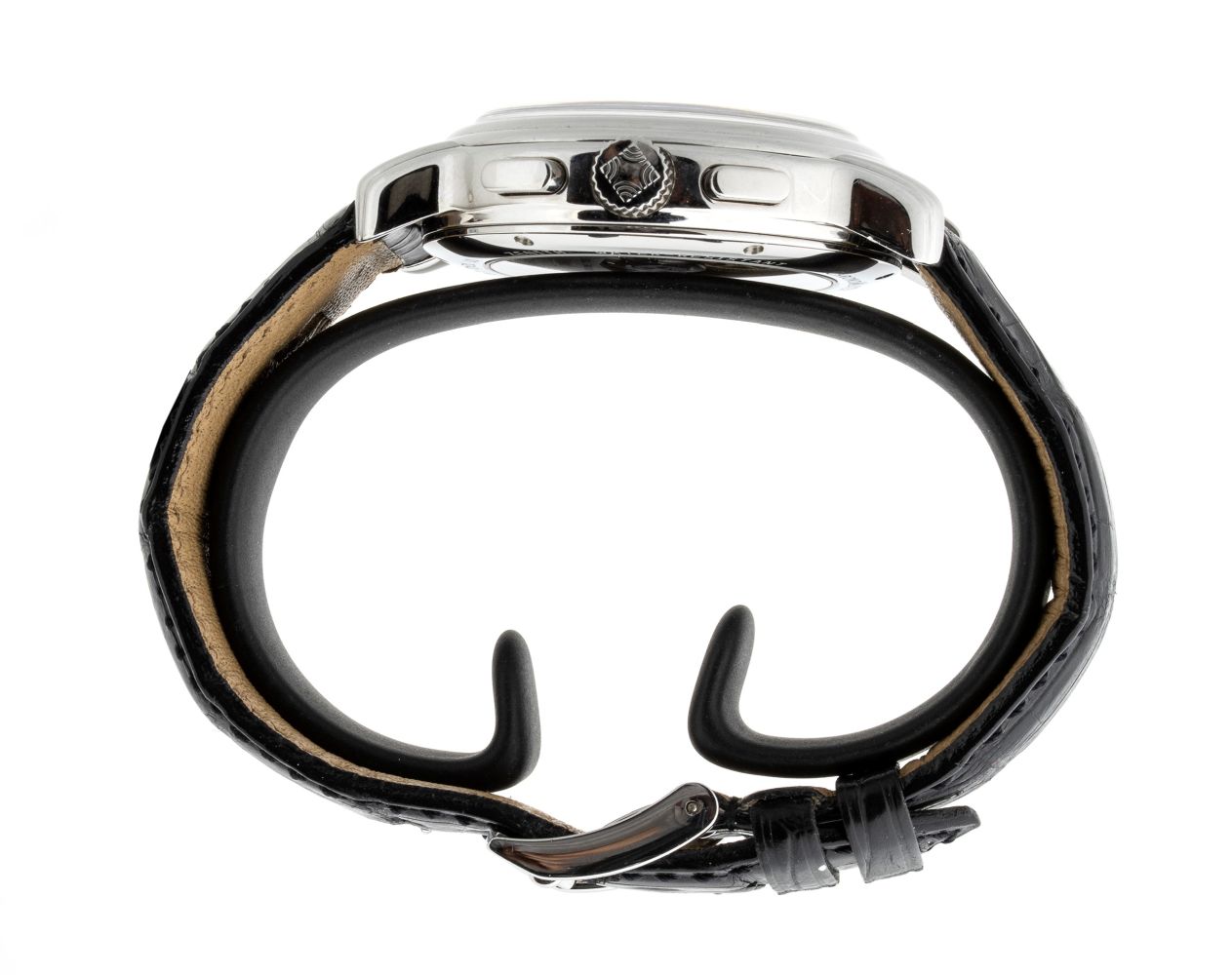 cassa in acciaio, lunetta in acciaio, fondello a vista, quadrante argenté, numeri romani applicati, vetro minerale. Movimento a carica automatica calibro 410Z con calendario completo e fasi lunari. Cinturino in pelle, fibbia in acciaio. (numero del movimento: 152xxx).