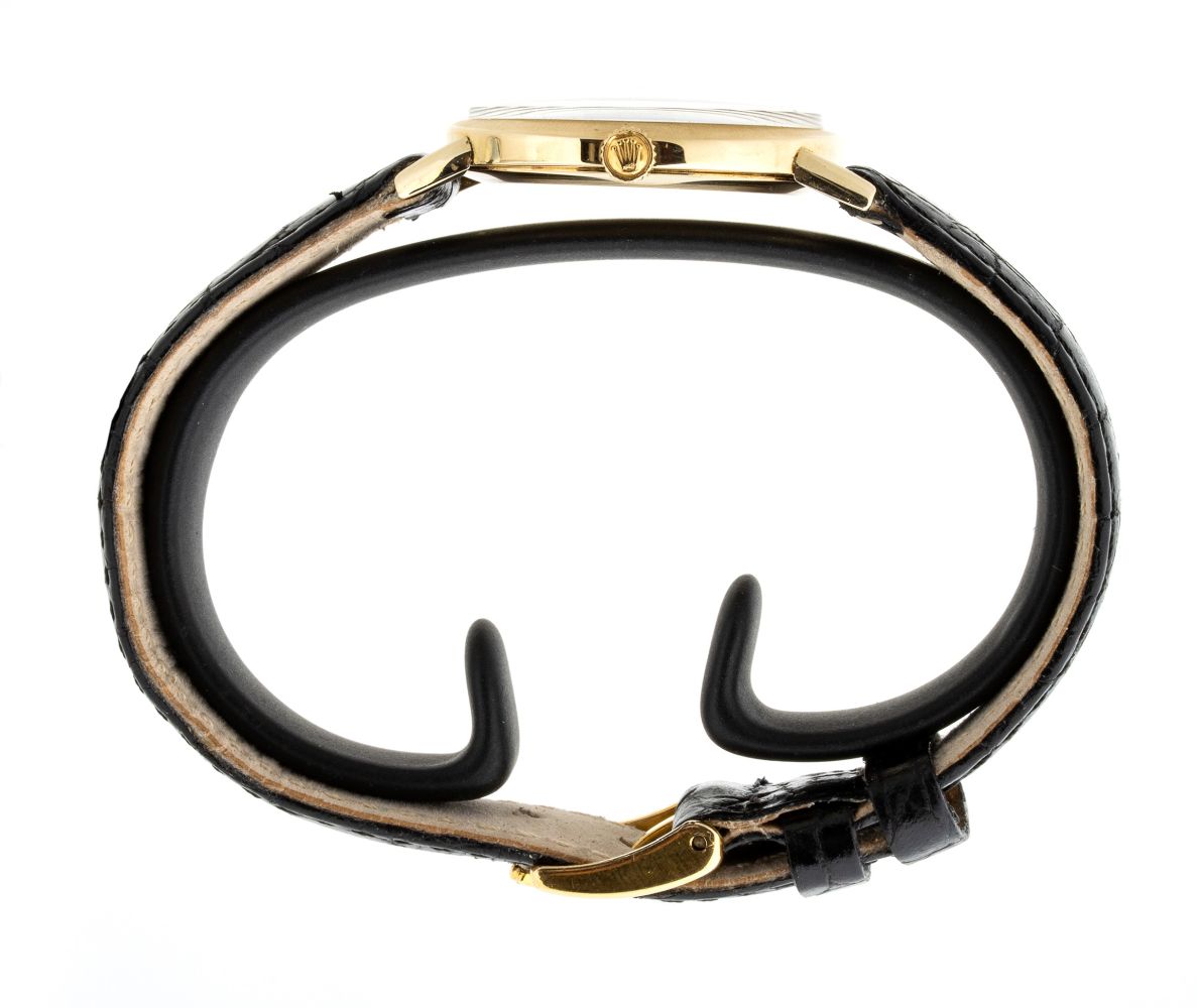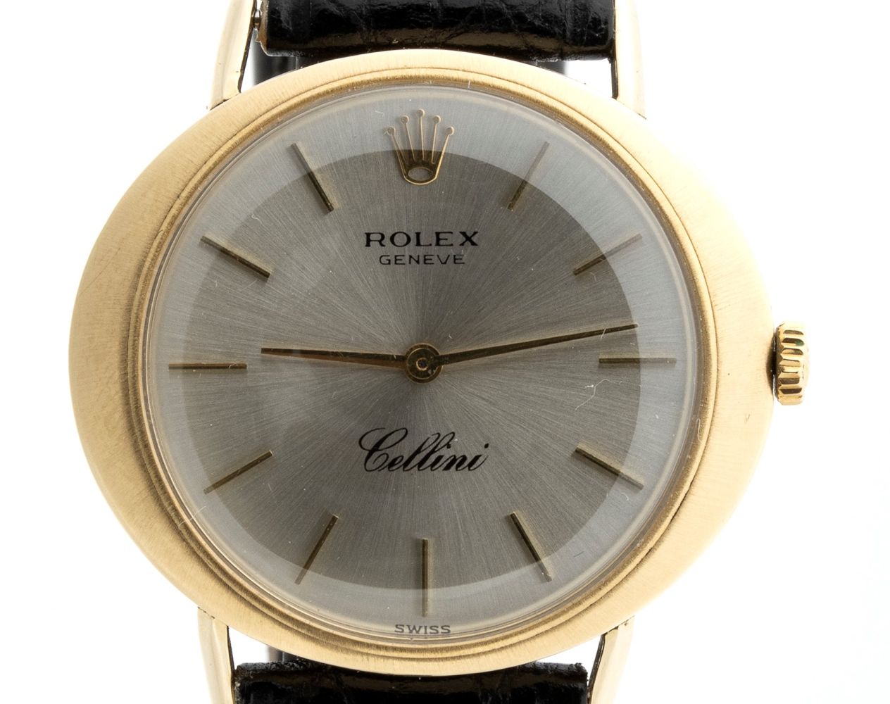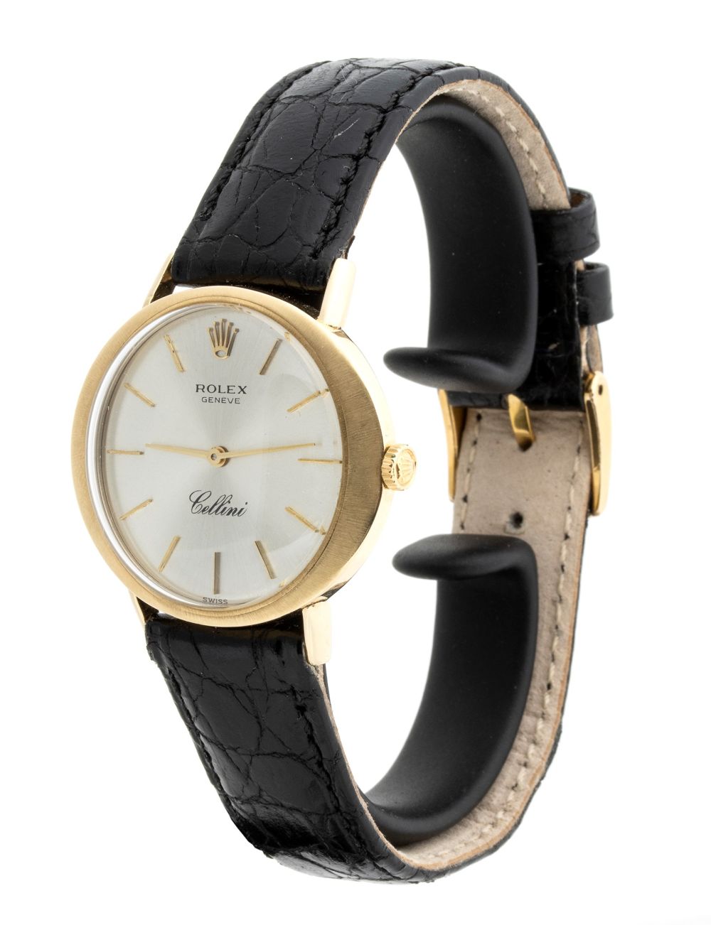 cassa in oro giallo 18k, quadrante argentato con indici a bastone firmato Rolex Geneve Cellini, sfere dorate. Movimento a carica manuale. Bracciale in pelle con fibbia dorata Rolex.