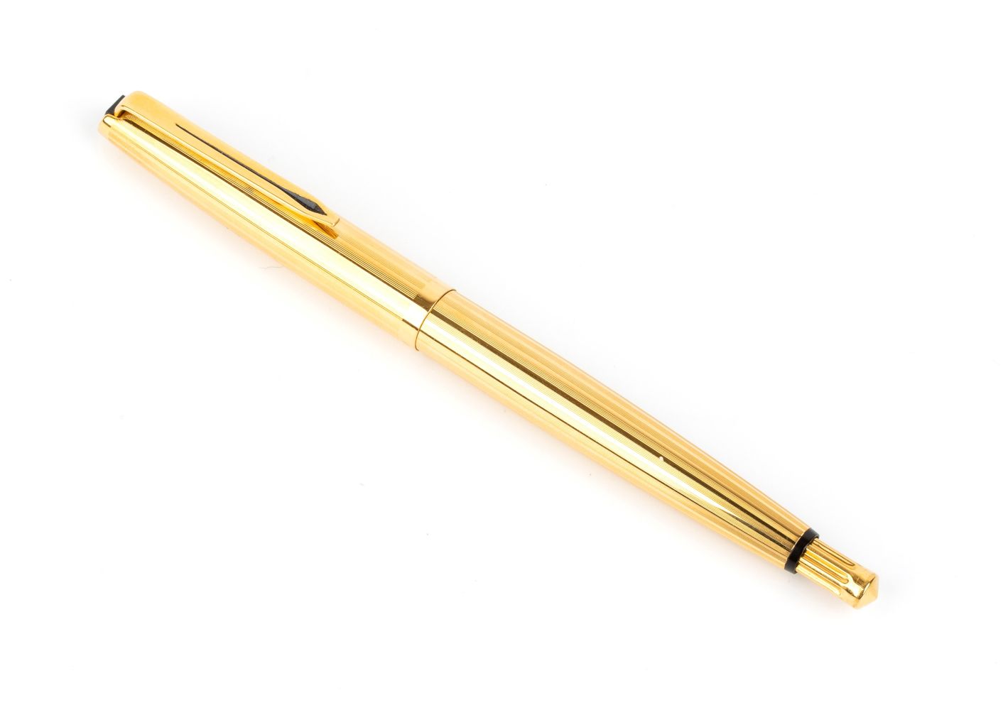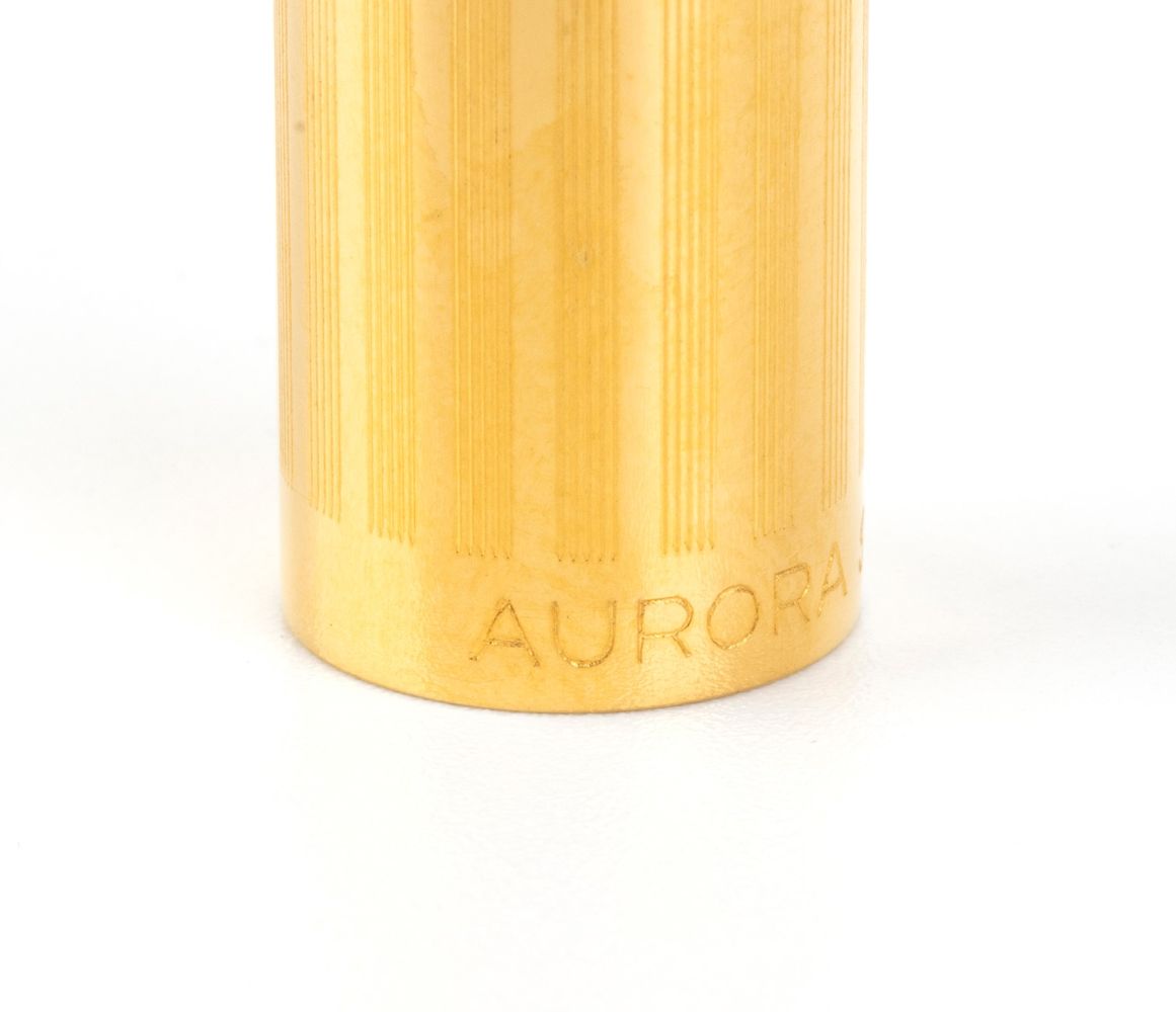 c) una penna stilografica AURORA in custodia originale, sistema di caricamento a stantuffo. Lunghezza 13,8 cm. Peso 21,6 gr.