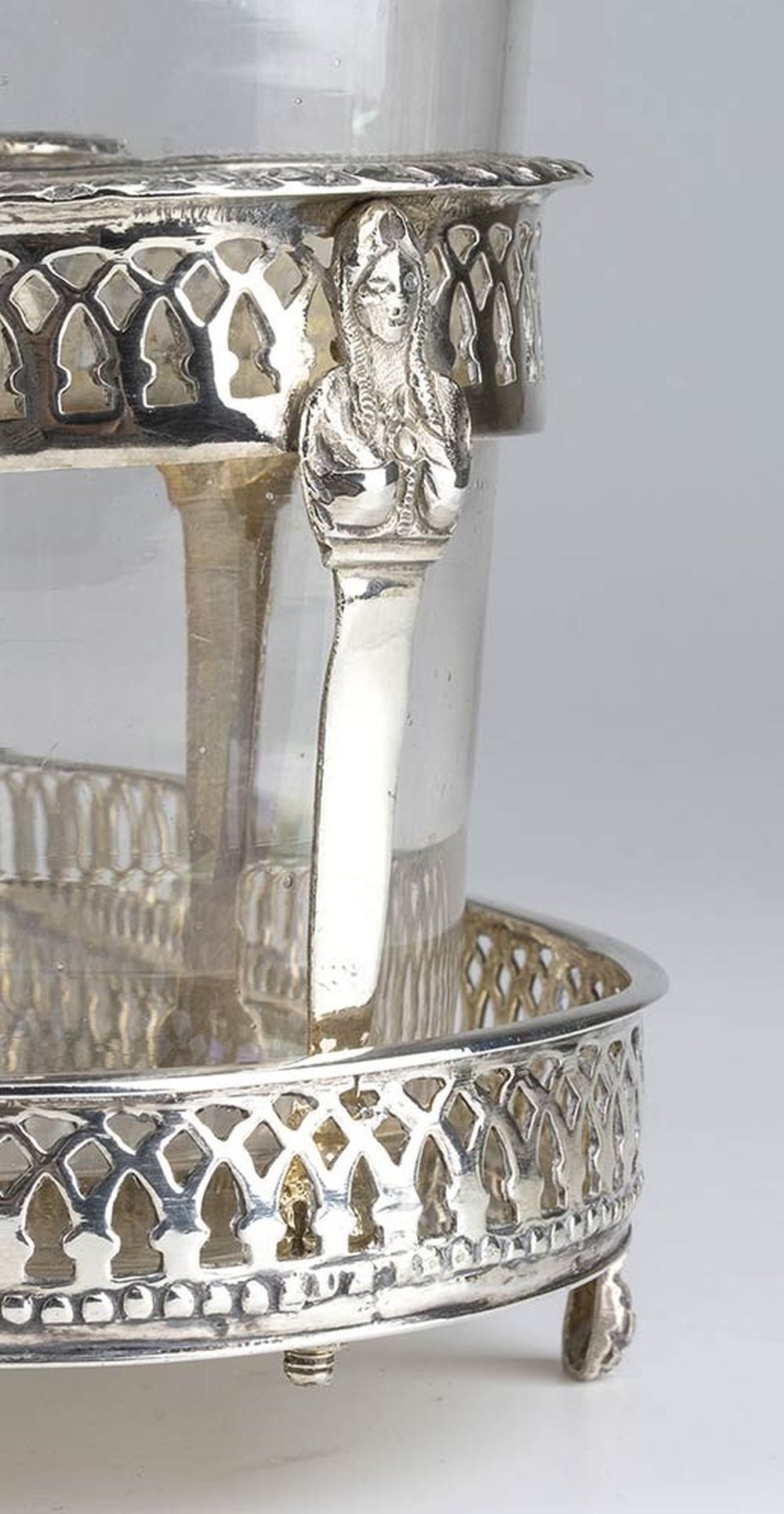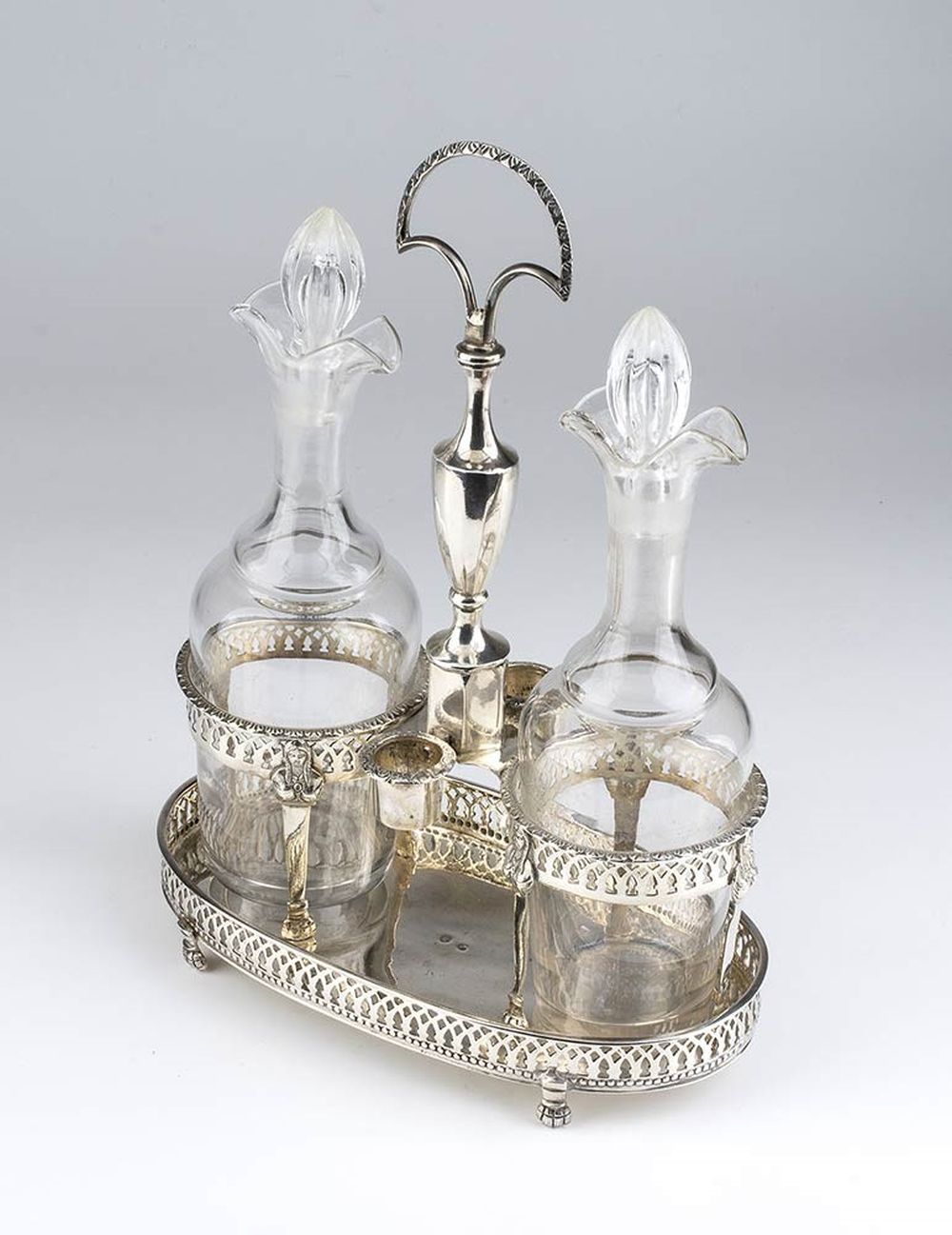 di forma ovale con bordo traforato, poggiante su quattro piedini; presa centrale con due ampolle laterali in vetro. Argento 800/1000, punzonata con i marchi in uso a Genova, Regno di Sardegna dal 1824 al 1872.