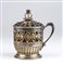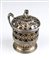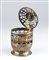 di forma circolare, realizzata a traforo con motivi geometrici e floreali, coperchio incernierato e manico ad ansa rialzata. L'avvolgicera centrale sostiene i resti di una bobina di cera. Punzonata con i marchi camerali in uso a Roma dopo il 1815 per l'argento al titolo al titolo di 10 once e 16 denari (889/1000) e con il marchio dell'argentiere GZ.