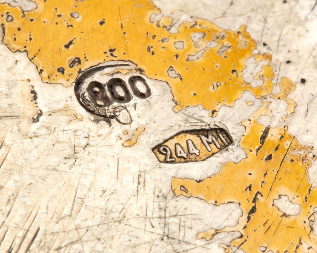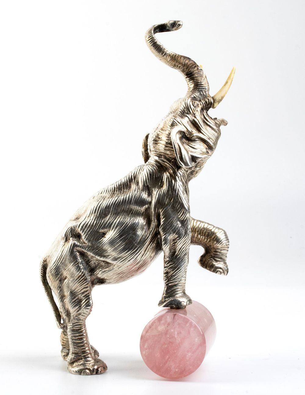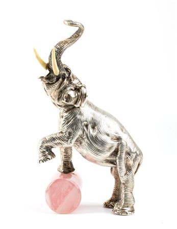 raffigurante un elefante con le zanne in osso con la zampa sinistra appoggiata ad un cilidro in quarzo rosa. Argento 800/1000. Punzonata "800 - 244 MI", argentiere Eredi Mazzetti di pandini o Gavirati Egidio s.a.s..