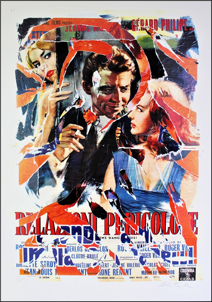ROTELLA MIMMO Catanzaro 1918 - Milano 2006 "Relazioni pericolose" Multiplo decollage con strappi di manifesto applicati su supporto serigrafico su cartoncino, cm 70x100. Firmato in basso a destra e numerato a sinistra, esemplare P.A. Timbro a secco Fondazione Rotella Mimmo in basso a sinistra. Opera pubblicata sul catalogo "Mimmo Rotella multipli decollage", Silvana Editoriale, a pag. 36 e 37.