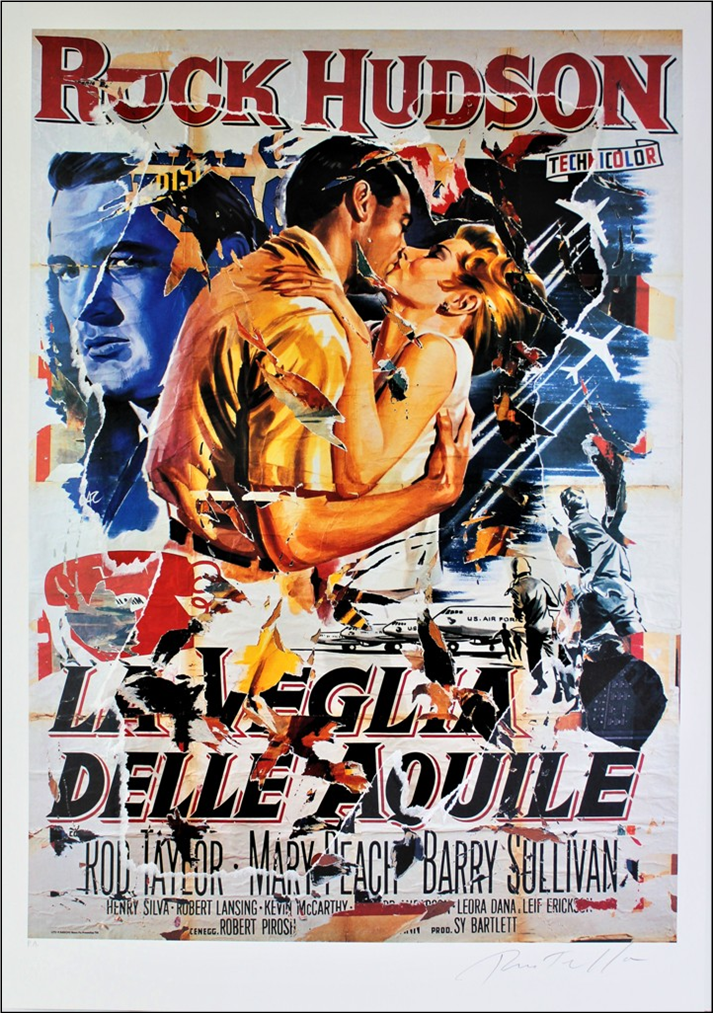 ROTELLA MIMMO Catanzaro 1918 - Milano 2006 "La veglia delle aquile" Multiplo decollage con strappi di manifesto applicati su supporto serigrafico su cartoncino, cm 70x100. Firmato in basso a destra e numerato a sinistra, esemplare P.A. Timbro a secco Fondazione Rotella Mimmo in basso a sinistra. Opera pubblicata sul catalogo "Mimmo Rotella multipli decollage", Silvana Editoriale, a pag. 46 e 47.