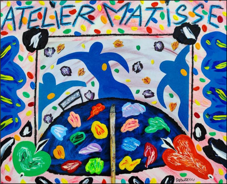 DONZELLI BRUNO Napoli 1941 "Atelier Matisse" Acrilico e collage su tela cm 50x40. Firmato sul fronte in basso a destra. Sul retro firmato ed intitolato. Autentica su foto a cura dell'Artista.