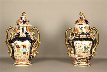 Firmato. Coppia di vasi con coperchio in porcellana Vecchia Parigi. XIX secolo. Difetti e restauri. Mis. Lung. cm. 24 Alt. cm. 34 ca.