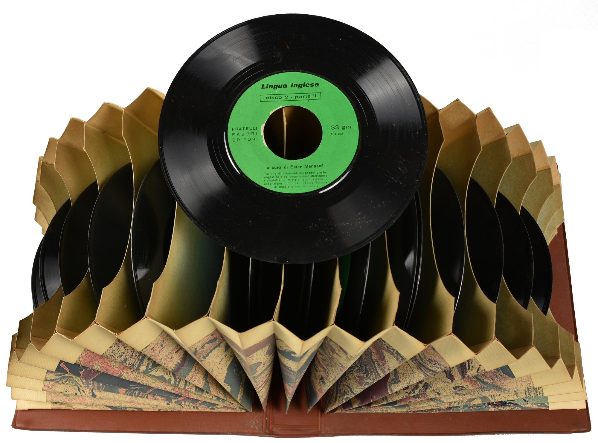 in cuoio, contenente il catalogo audio per l'insegnamento della lingua inglese a cura Ester Menasce' dei Fratelli Fabbri Editore. Consta di 18 dischi in vinile da 33 giri.