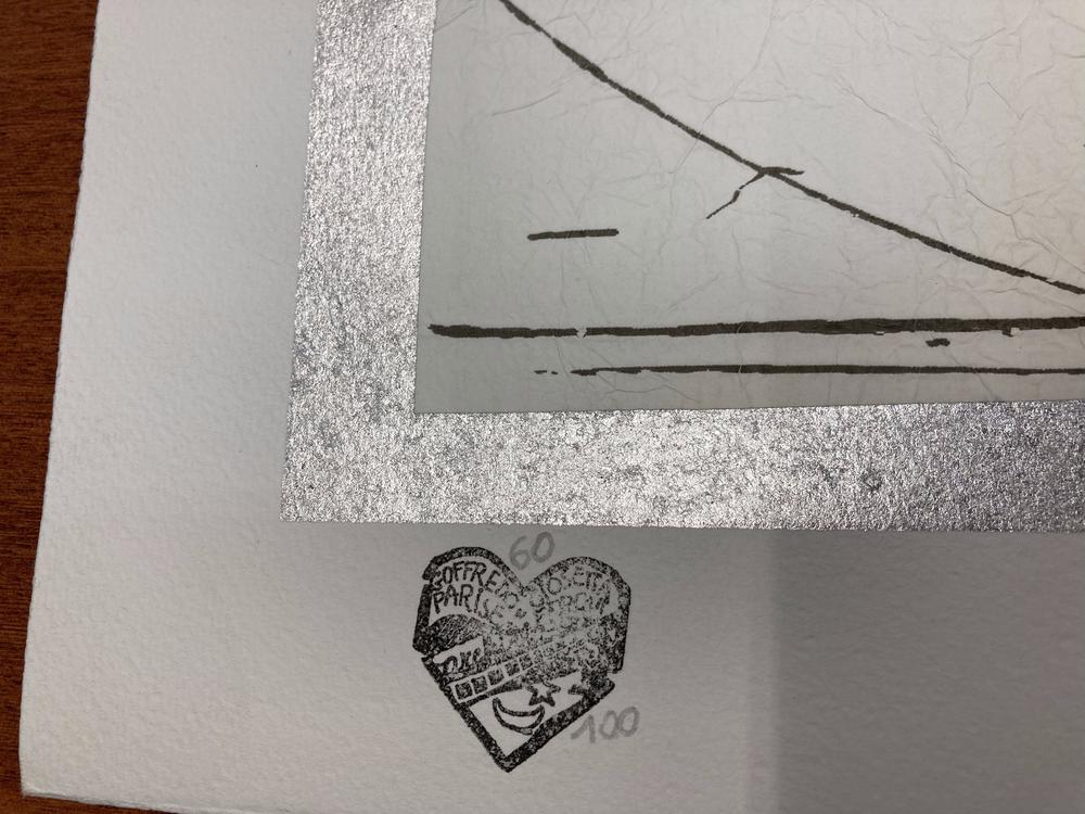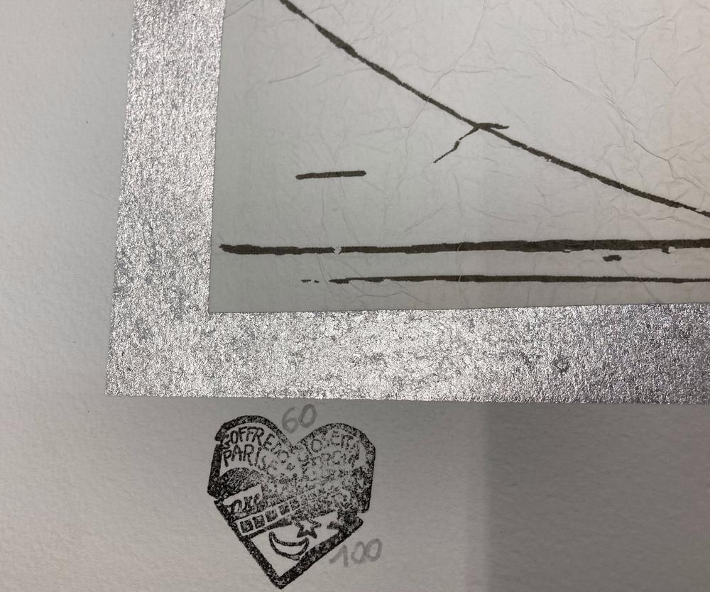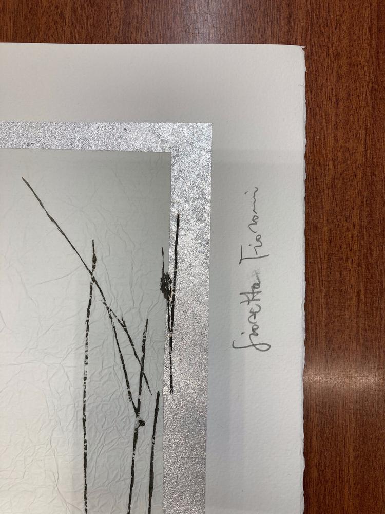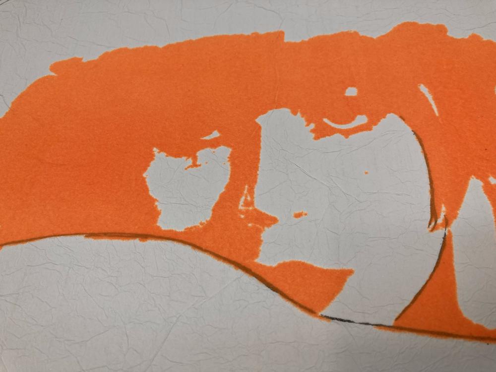serigrafia materia con pigmento arancio luminoso con floccaggio e applicazioni in foglia d'argento su carta Pescia, cm 50x50; es. 60/100