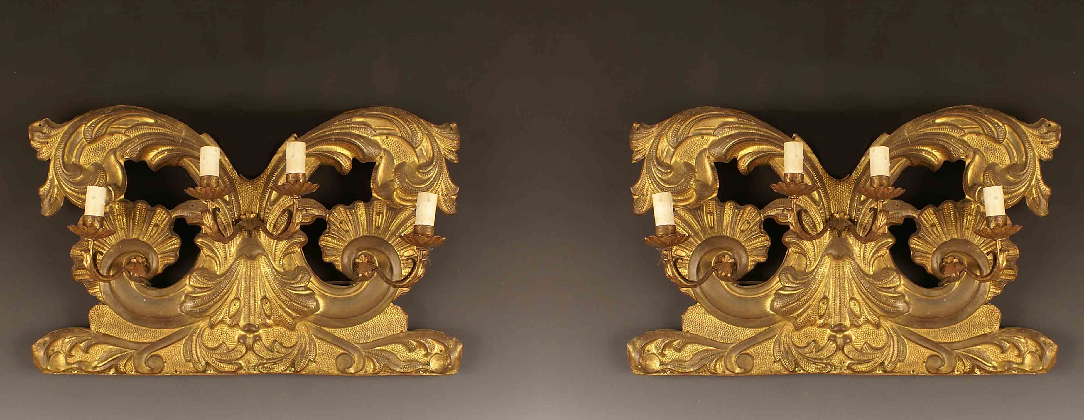 Coppia di appliques a quattro luci in metallo dorato, poggianti su basi in legno, vecchia manifattura, cm. 37x60.