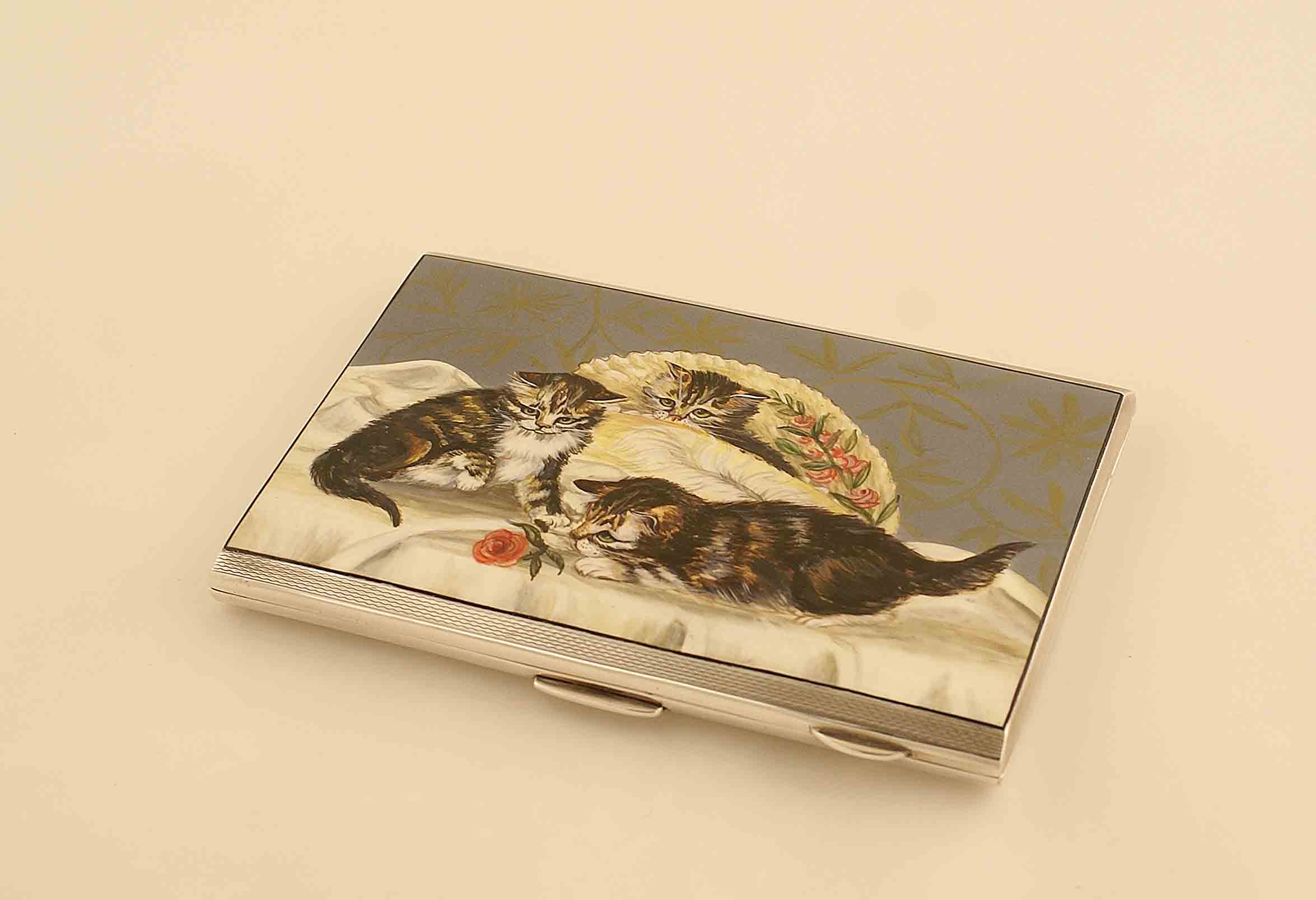 Scatola portasigarette di forma rettangolare in argento e smalto policromo raffigurante gattini che giocano, città di Birmingham 1947, cm. 12,5 .