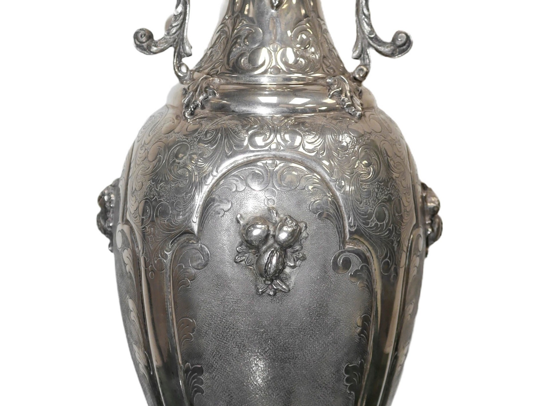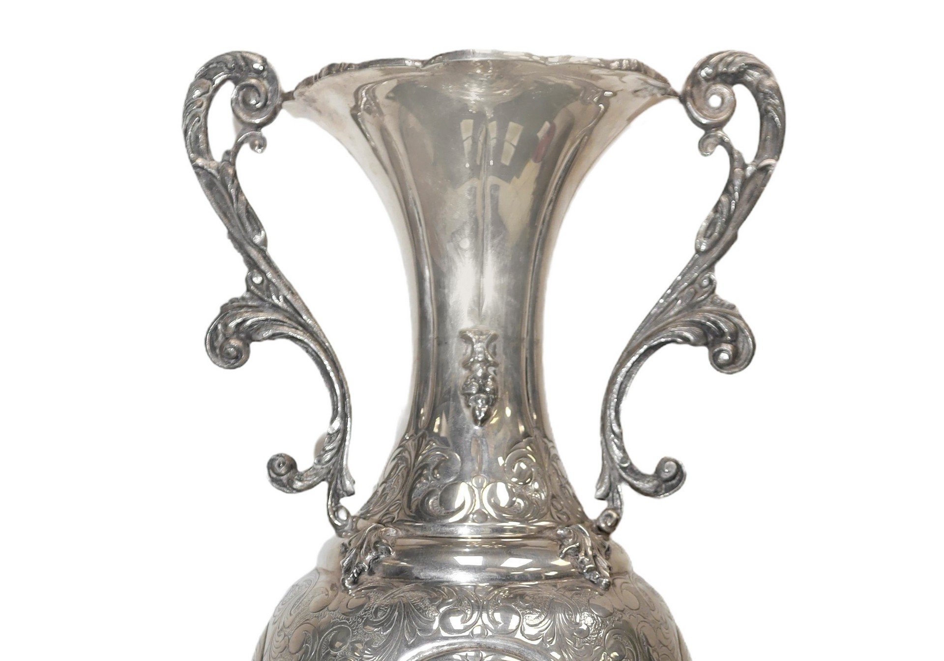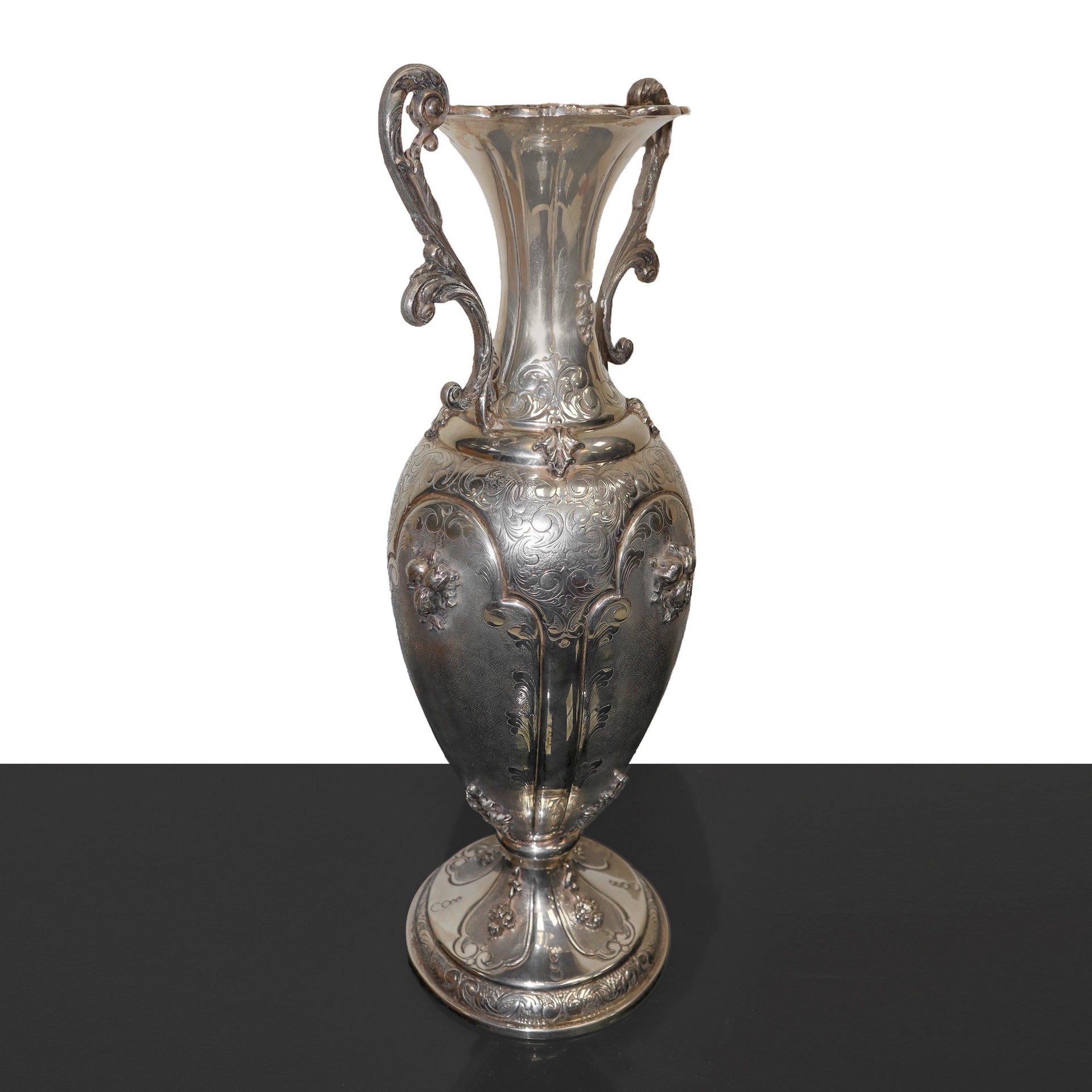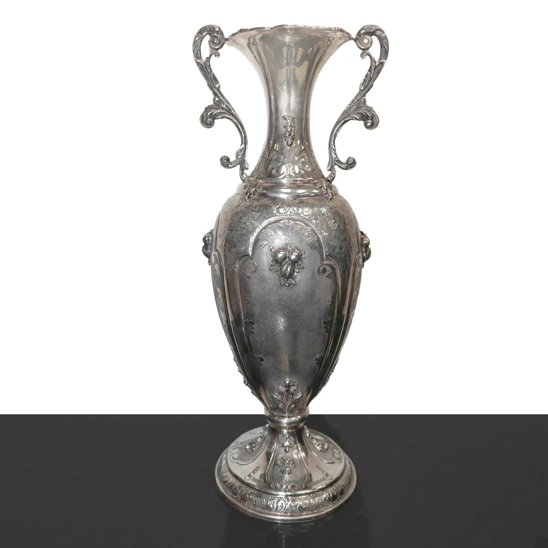 Vaso in argento 800 h cm 40, 1,350 kgt Con manici, incisioni e decori a sbalzoCon manici, incisioni e decori a sbalzo