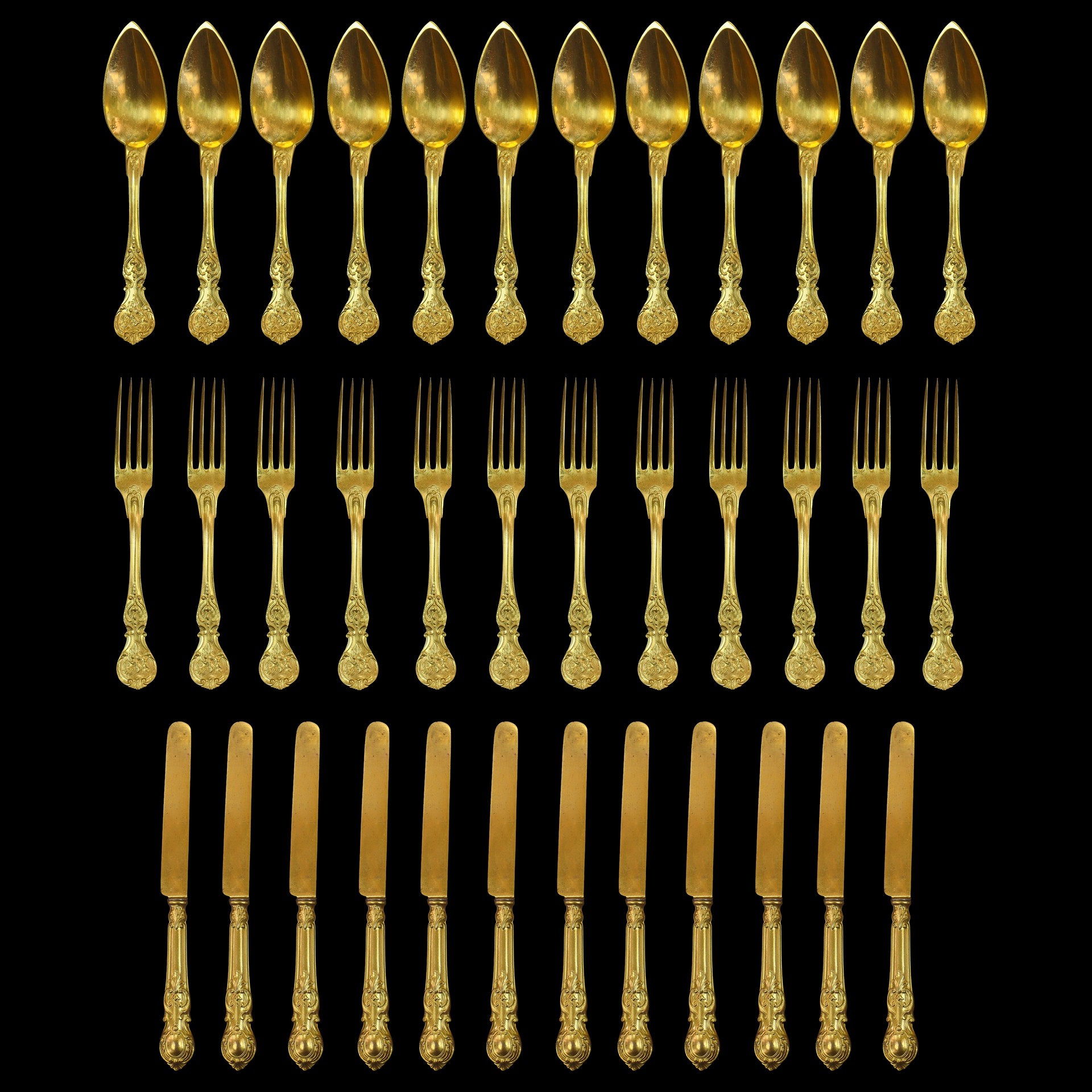 French Christofle - Antico Servizio di posate da 12, placcato oro, Early 1900s Composto da 12 forchette, 12 cucchiai e 12 coltelli. Punzonato ChristofleComposto da 12 forchette, 12 cucchiai e 12 coltelli. Punzonato Christofle