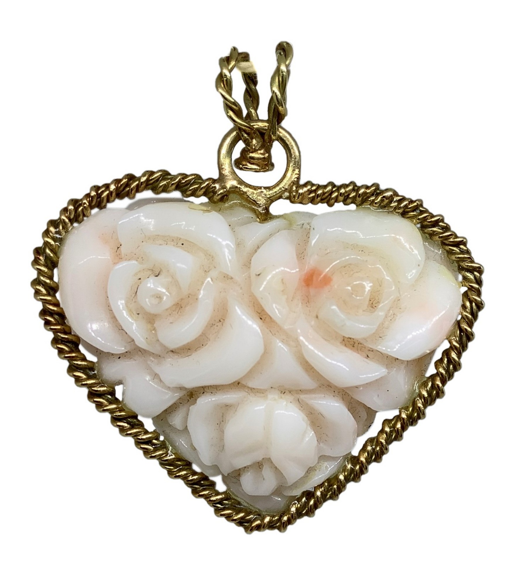 Ciondolo in oro 18 carati a treccia con cuore di corallo rosa inciso da entrambi i lati con soggetti floreali gr. 12,5