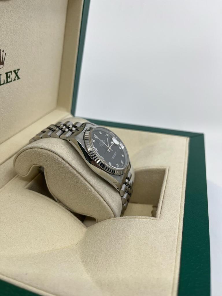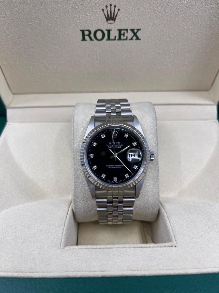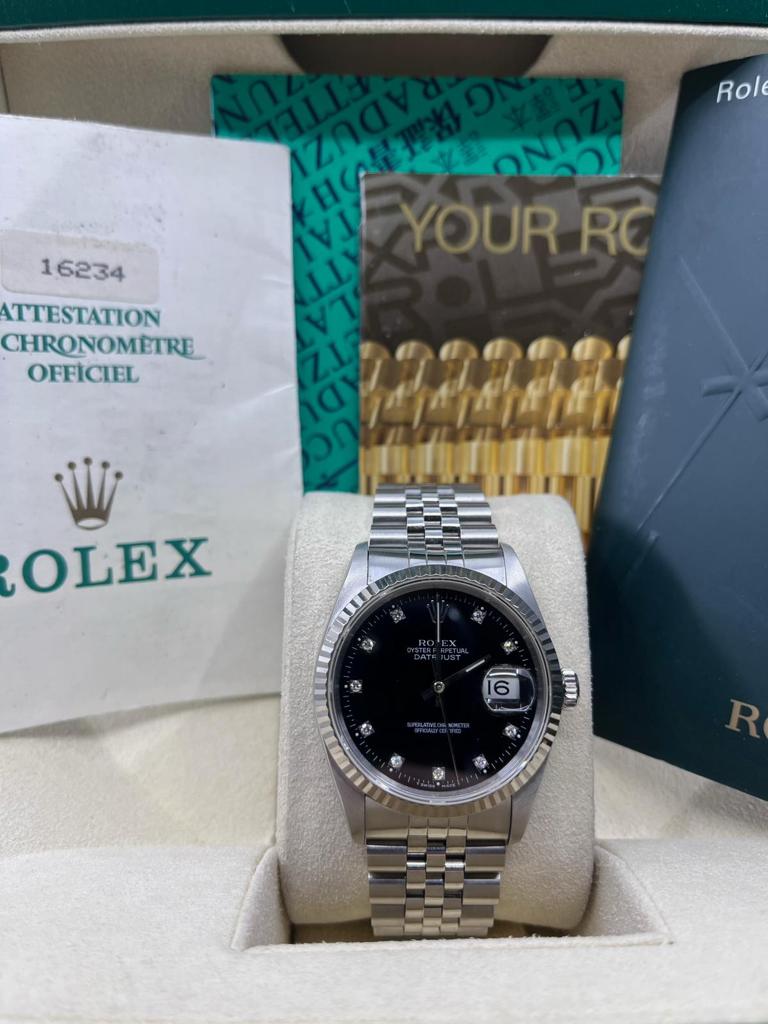 Rolex datejust 16234 Diametro 36mm Vetro zaffiro Cinturino jubilee Quadrante nero con diamanti Orologio con garanzia Rolex Anno 1991