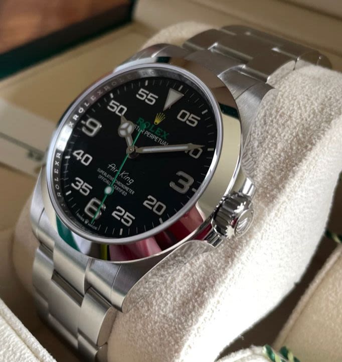 Marca Rolex Modello (Orologio) Air King Numero di referenza 126900 Carica Automatico Materiale della cassa Acciaio Materiale cinturino Acciaio Condizione Corredo documenti originali Carica Automatico Cassa Materiale della cassa Acciaio Diametro 40 mm Impermeabile 10 ATM Materiale lunetta Acciaio Vetro Vetro zaffiro Quadrante Nero Numeri sul quadrante Arabi Cinturino Materiale cinturino Acciaio Colore cinturino Acciaio Chiusura Déployante Materiale chiusura Acciaio Anni 20/22 No box