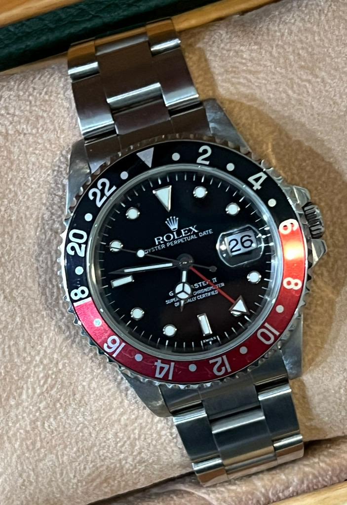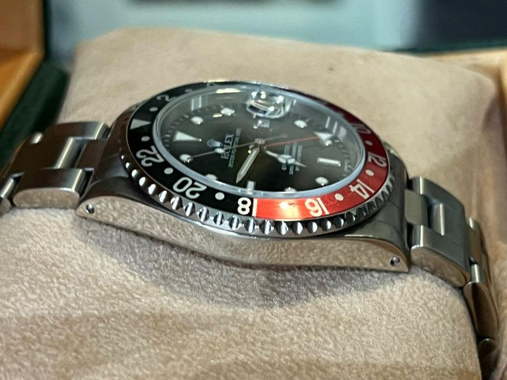 Marca Rolex Modello (Orologio) GMT-Master II Numero di referenza 16710 Carica Automatico Materiale della cassa Acciaio Anno di produzione anni 90 Condizione Ottimo Corredo Scatola di fornitura e documenti originali Rolex Calibro Carica Automatico Cassa Materiale della cassa Acciaio Diametro 40 mm Vetro Vetro zaffiro Quadrante Nero Funzioni Data, GMT