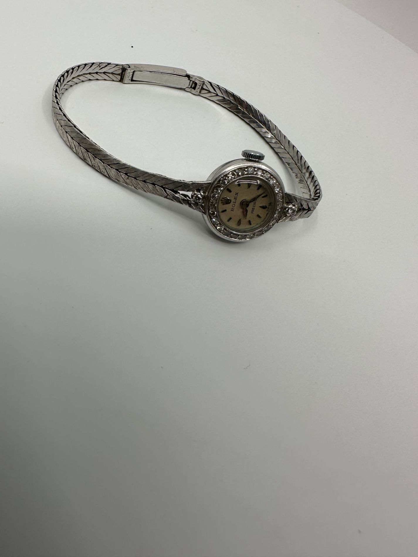 Marca Rolex Modello (Orologio) Precision Numero di referenza Rolex Precision oro bianco e diamanti Carica Manuale Materiale della cassa Oro bianco Materiale cinturino Oro bianco orologio funzionante con un anno di garanzia del negozio dal momento dell aggiudicazione Carica Manuale Materiale della cassa Oro bianco Diametro 15 mm Impermeabile Non impermeabile Materiale lunetta Oro bianco Vetro Plexiglas Cinturino Materiale cinturino Oro bianco Materiale chiusura Oro bianco