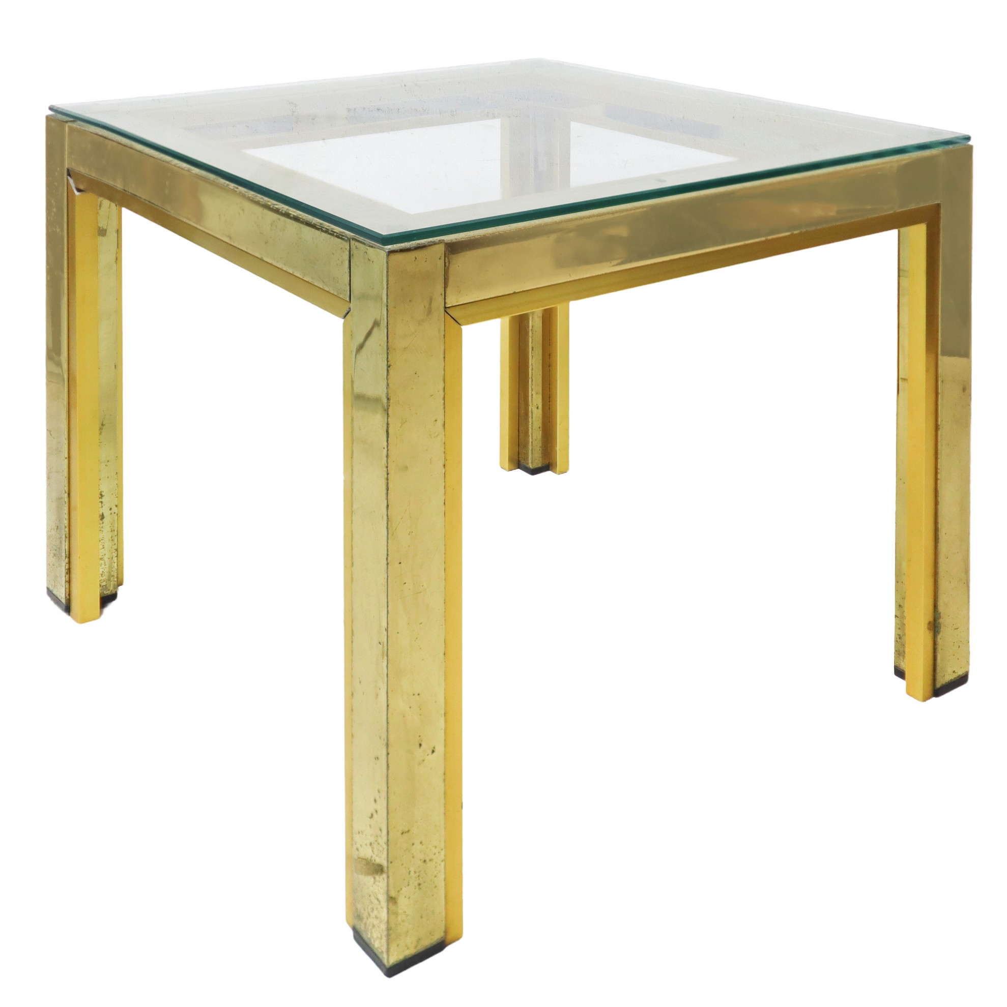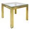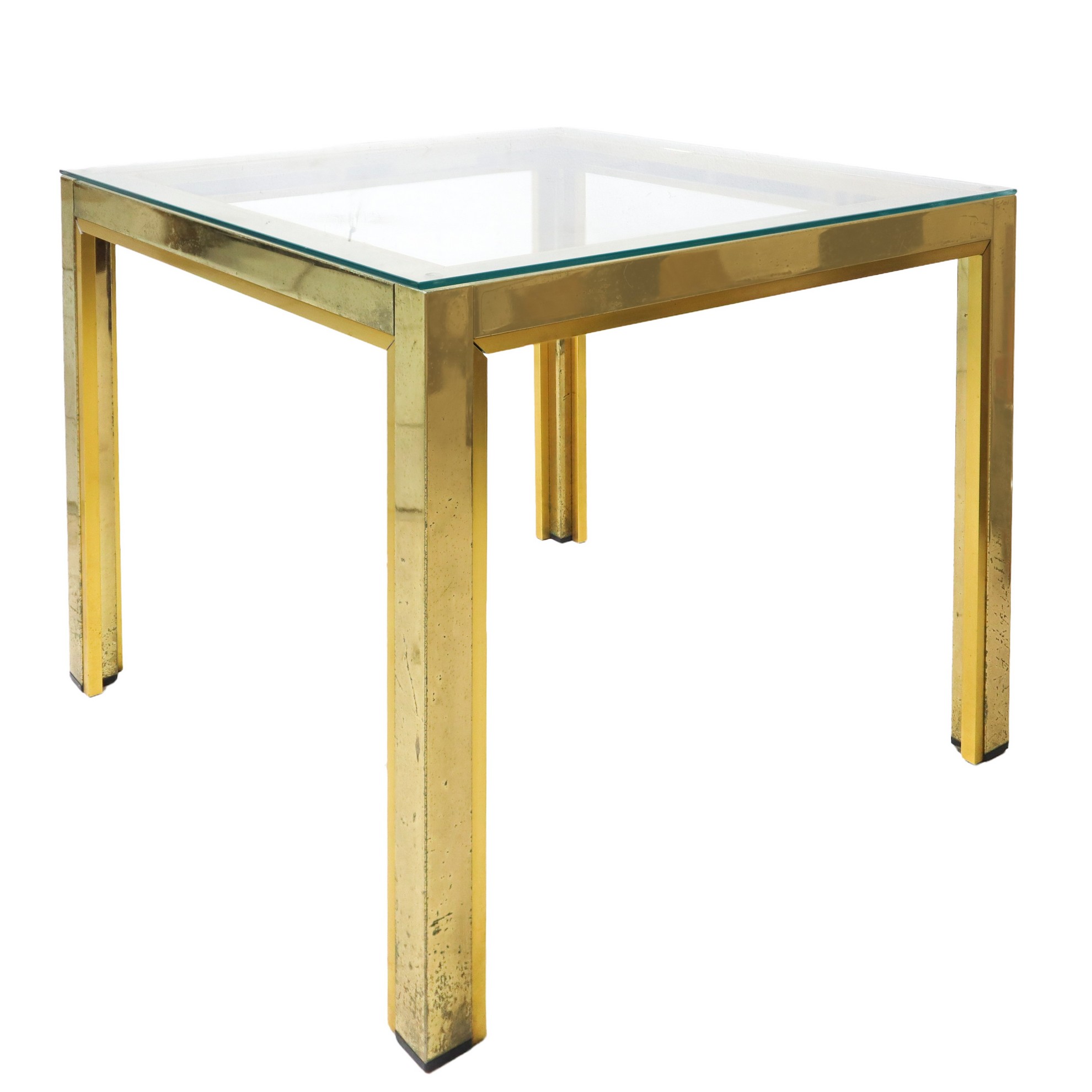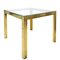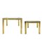 Coppia di tavolini H cm 50,5, cm 60x60, piccolo H cm 37,5, 46x46 Struttura in ottone dorato, piano in vetro color. Presenti segni d’uso.