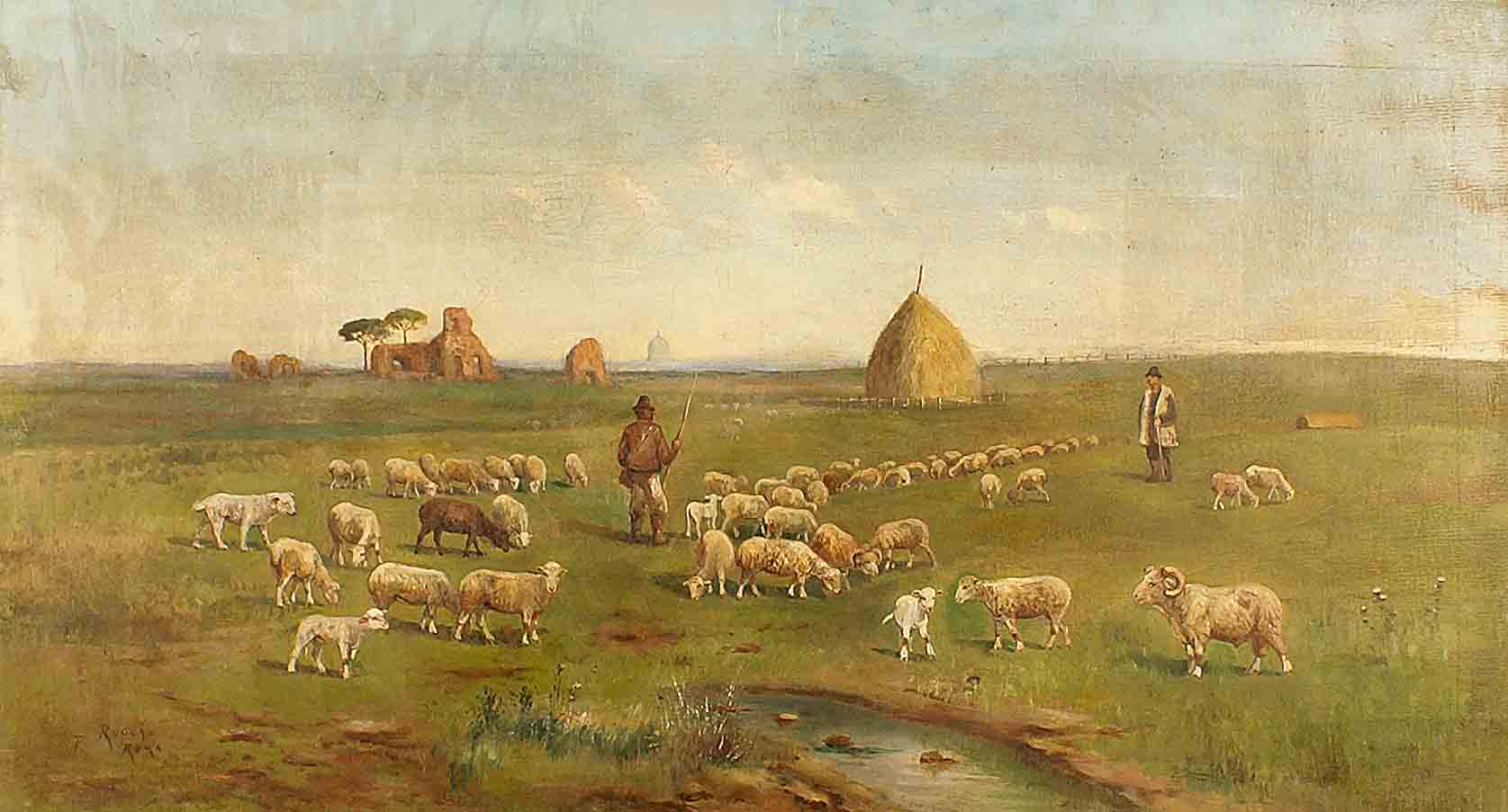 T. Rocchi (fine del XX secolo) "Veduta di campagna romana", olio su tela, cm. 55x100, firmato in basso a sinistra.
