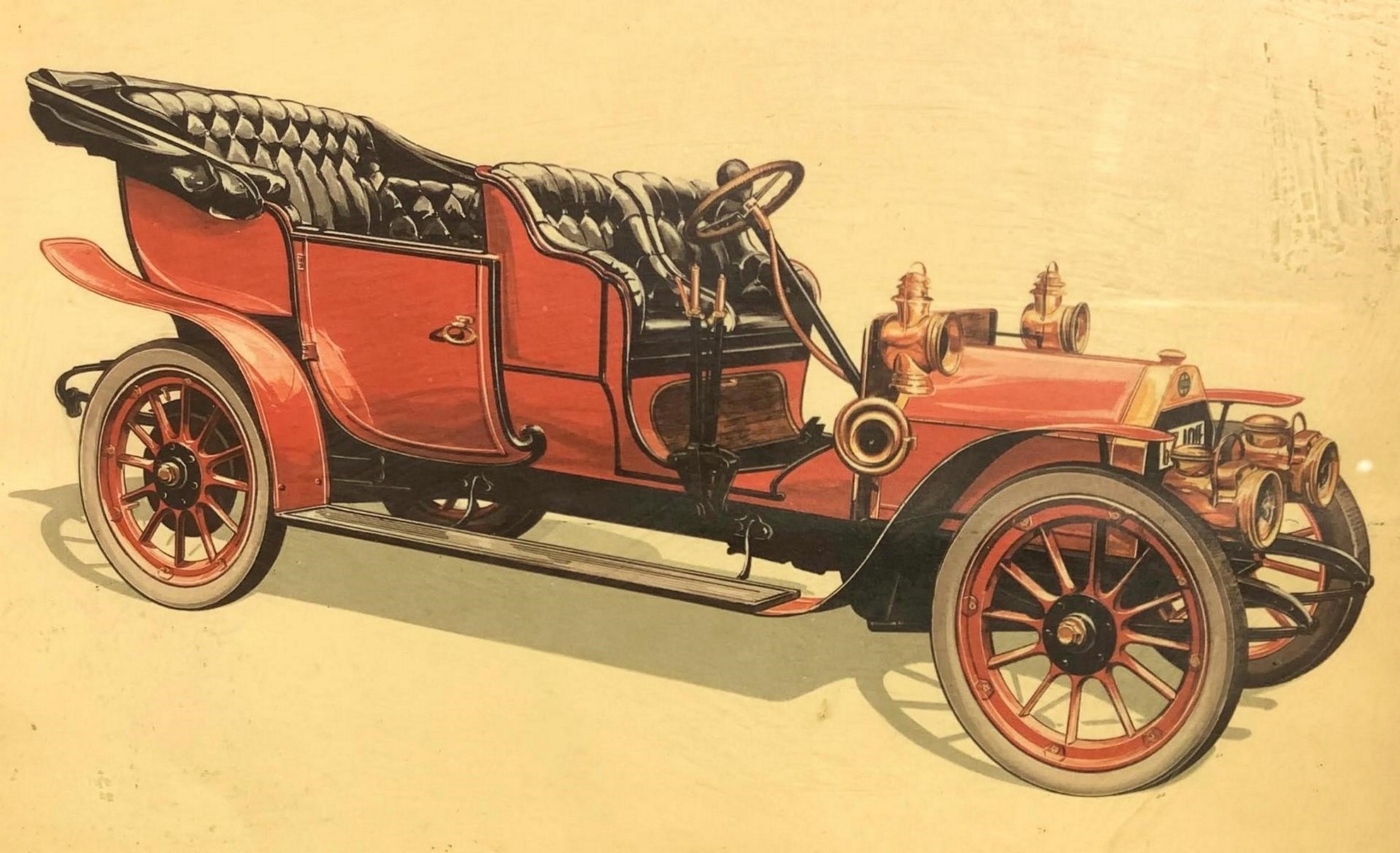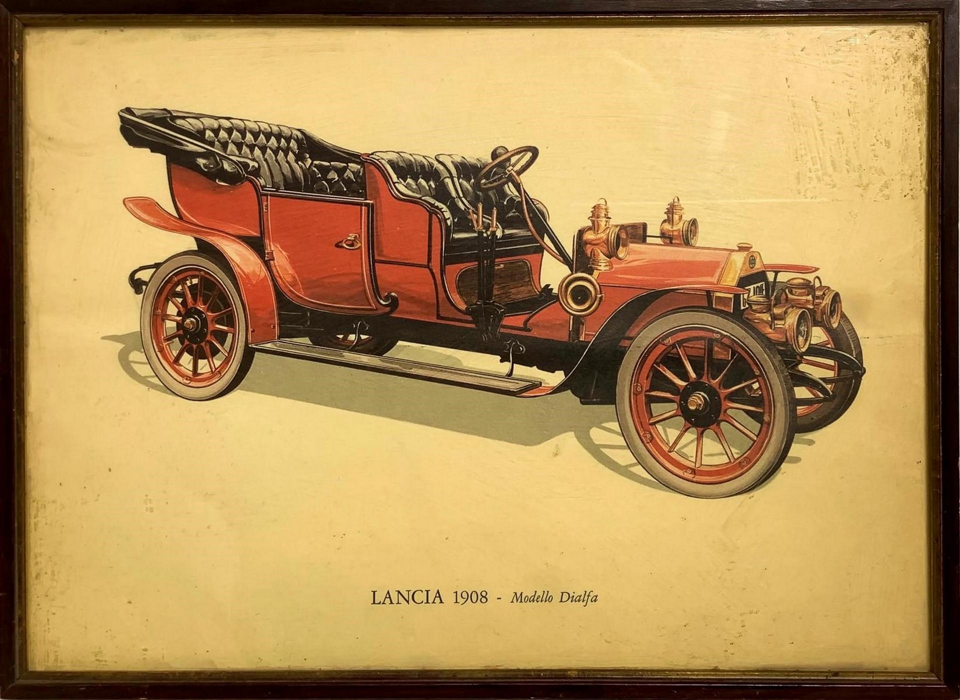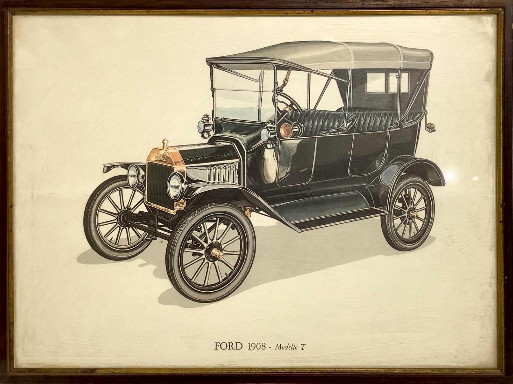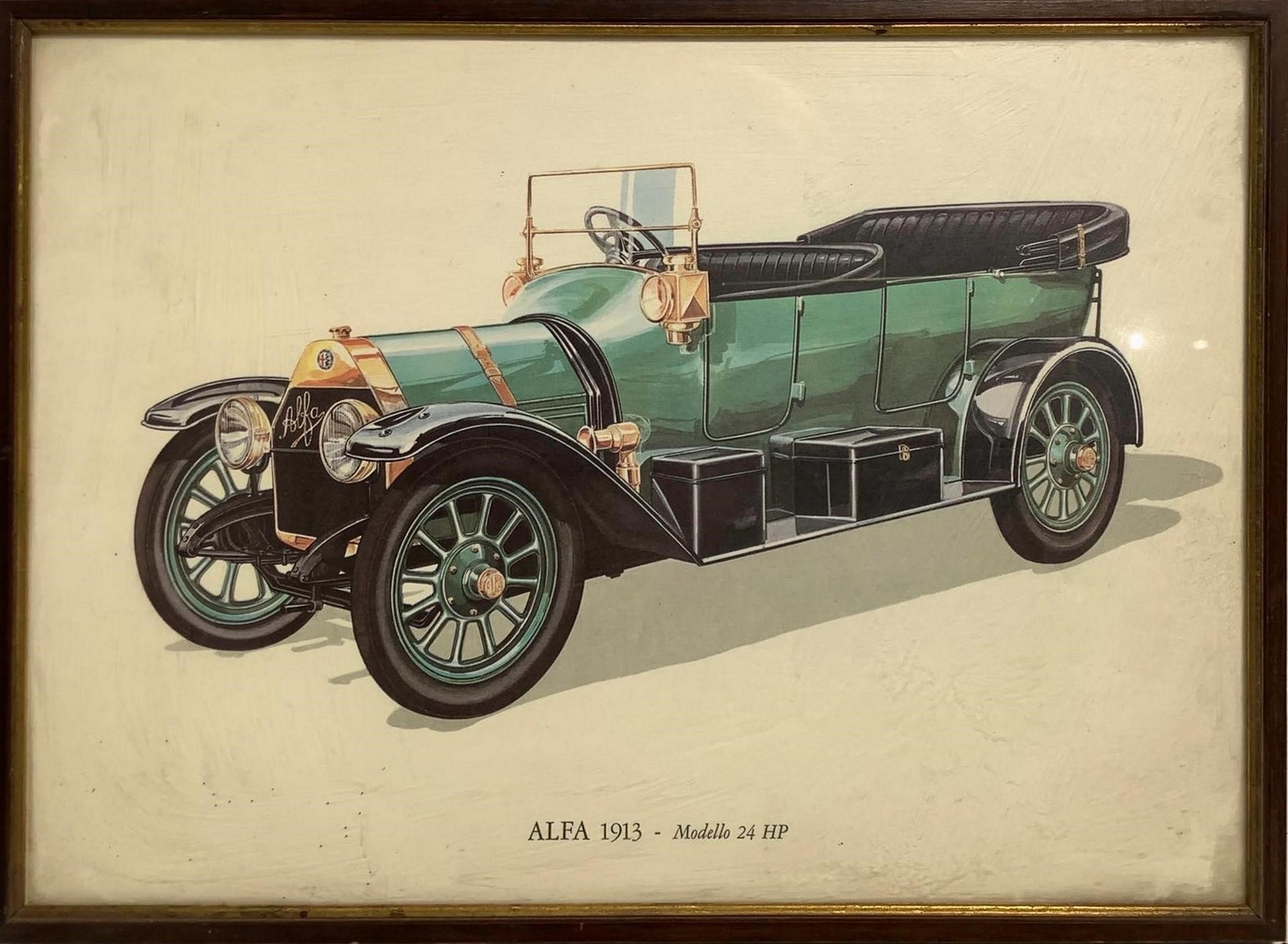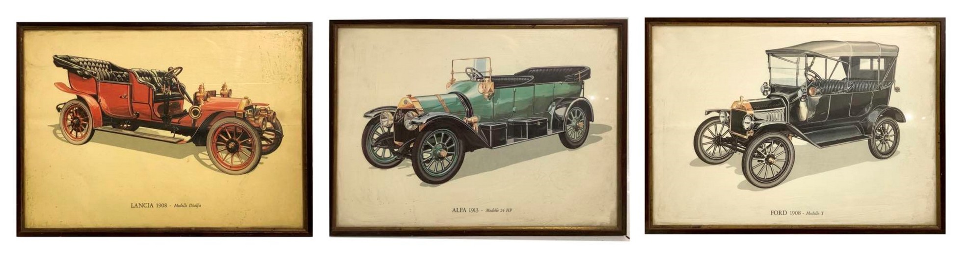Tre stampe raffigurante macchine d’epoca Cm 27x37 In cornice di legno color noce.In cornice di legno color noce.