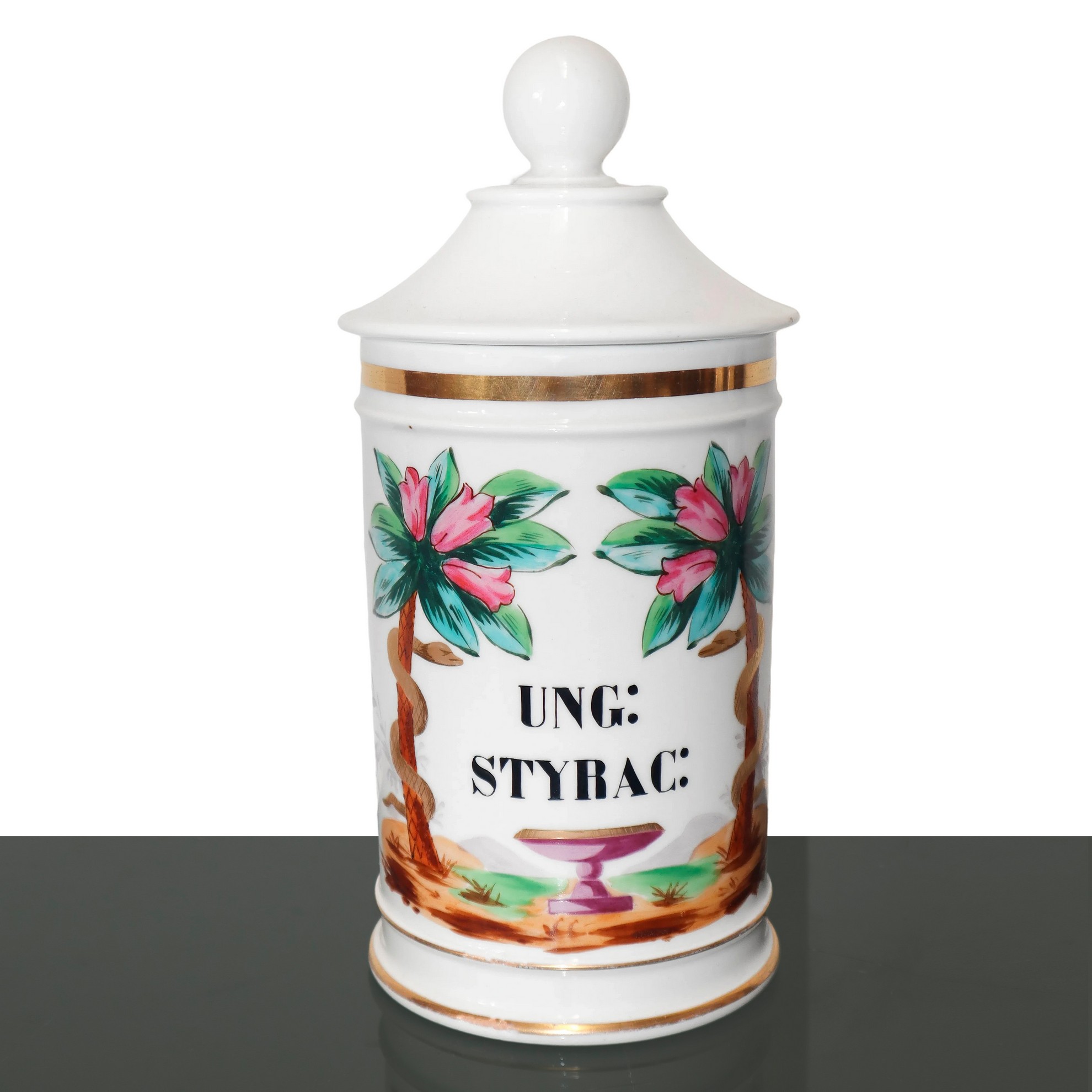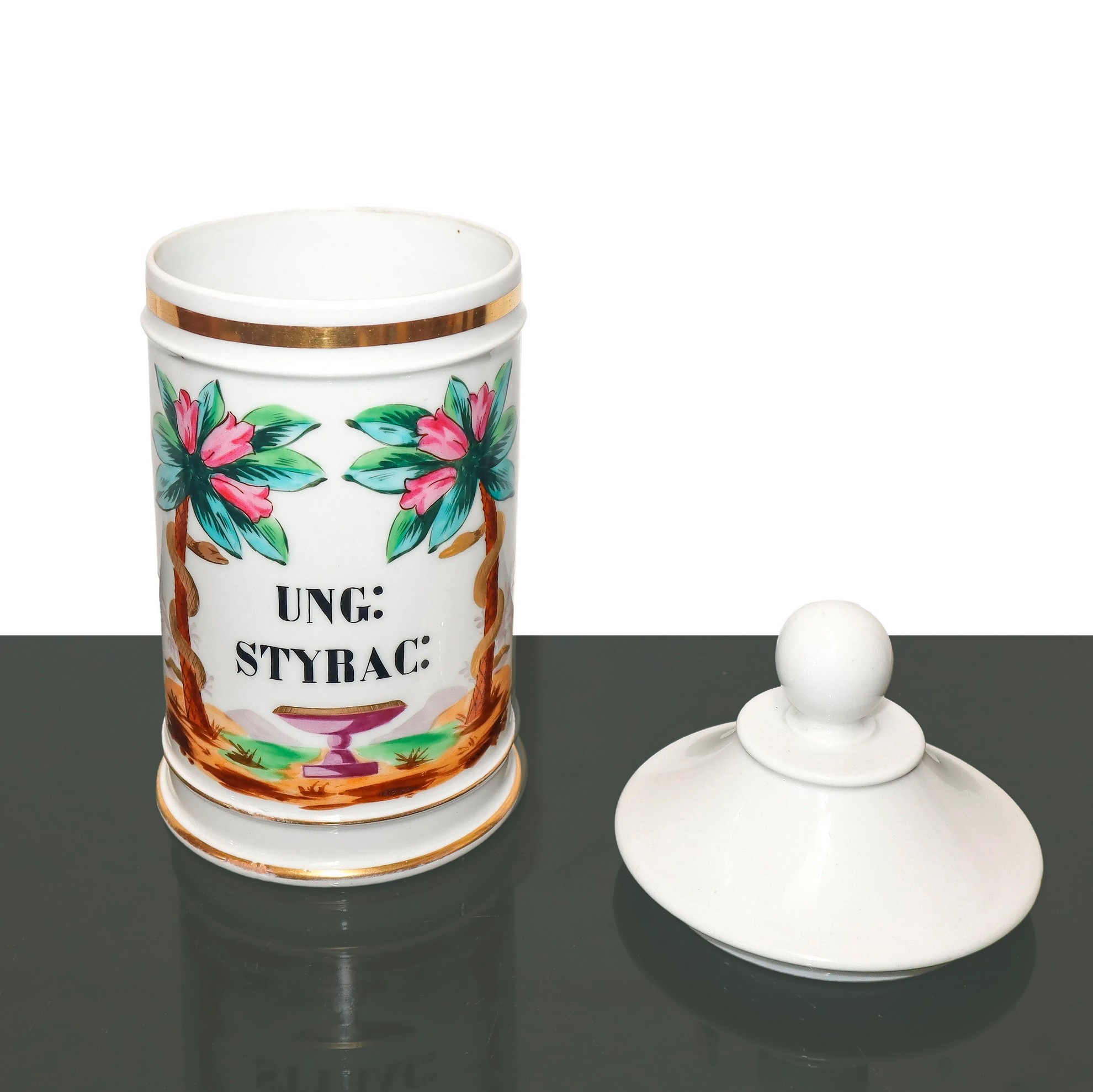 Barattolo da farmacia con speziale, decorazioni floreali e oro