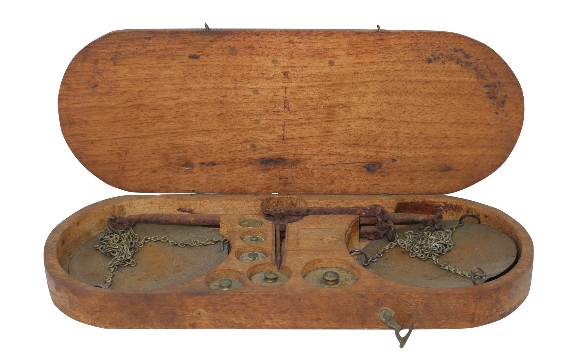 Antico bilancino su due braccia, nineteen° secolo cm 21 x cm 8 In scatola, con pesi monetari e per orificeriaIn scatola, con pesi monetari e per orificeria