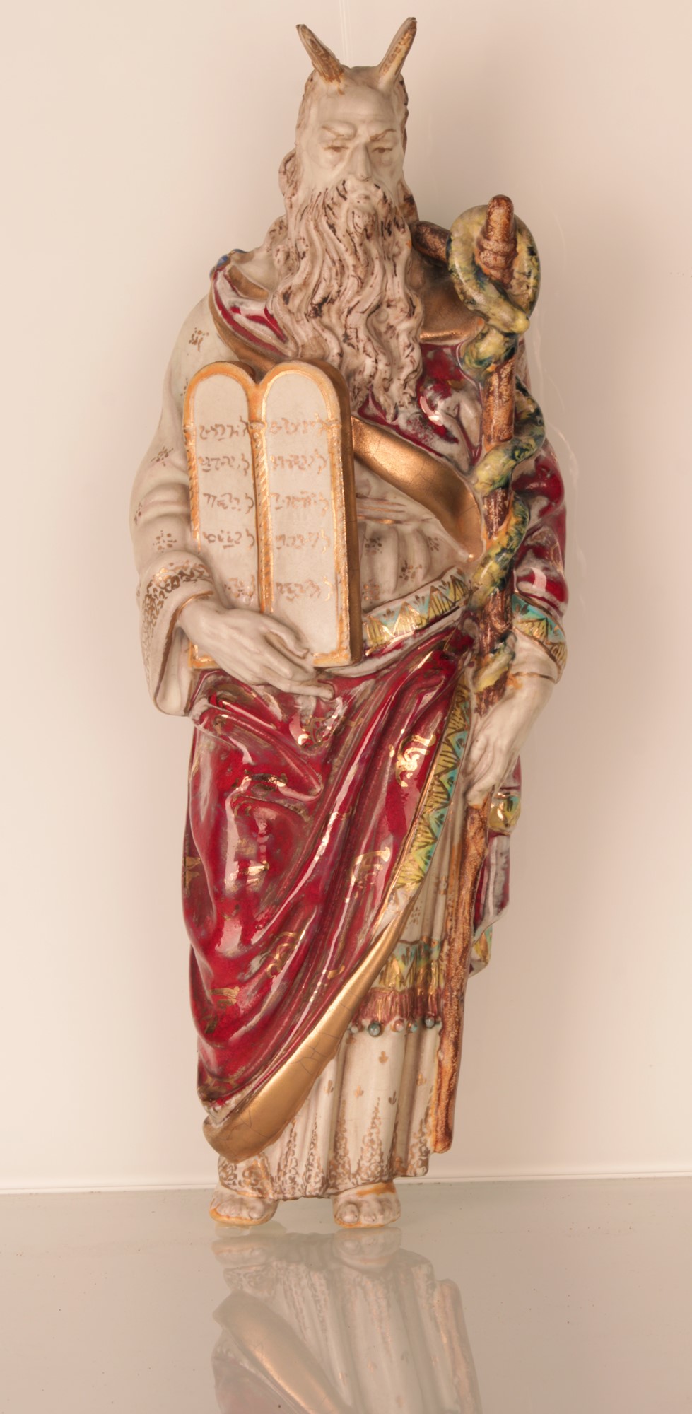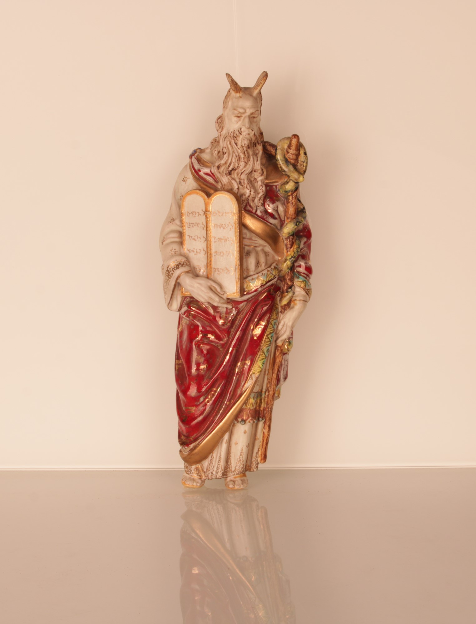 Eugenio Pattarino (Firenze 1885, Firenze - 1971, 1971) Mosè con le tavole della legge ed il bastone col serpente Maiolica policroma altezza cm 31