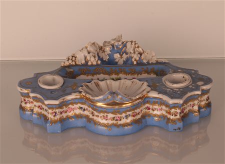 Servito da scrittoio in porcellana policroma sui tono dell'azzurro con decoro in oro al piano mistilineo e fascia di roselline ai fianchi. Porta inchiostro bianchi asportabili.