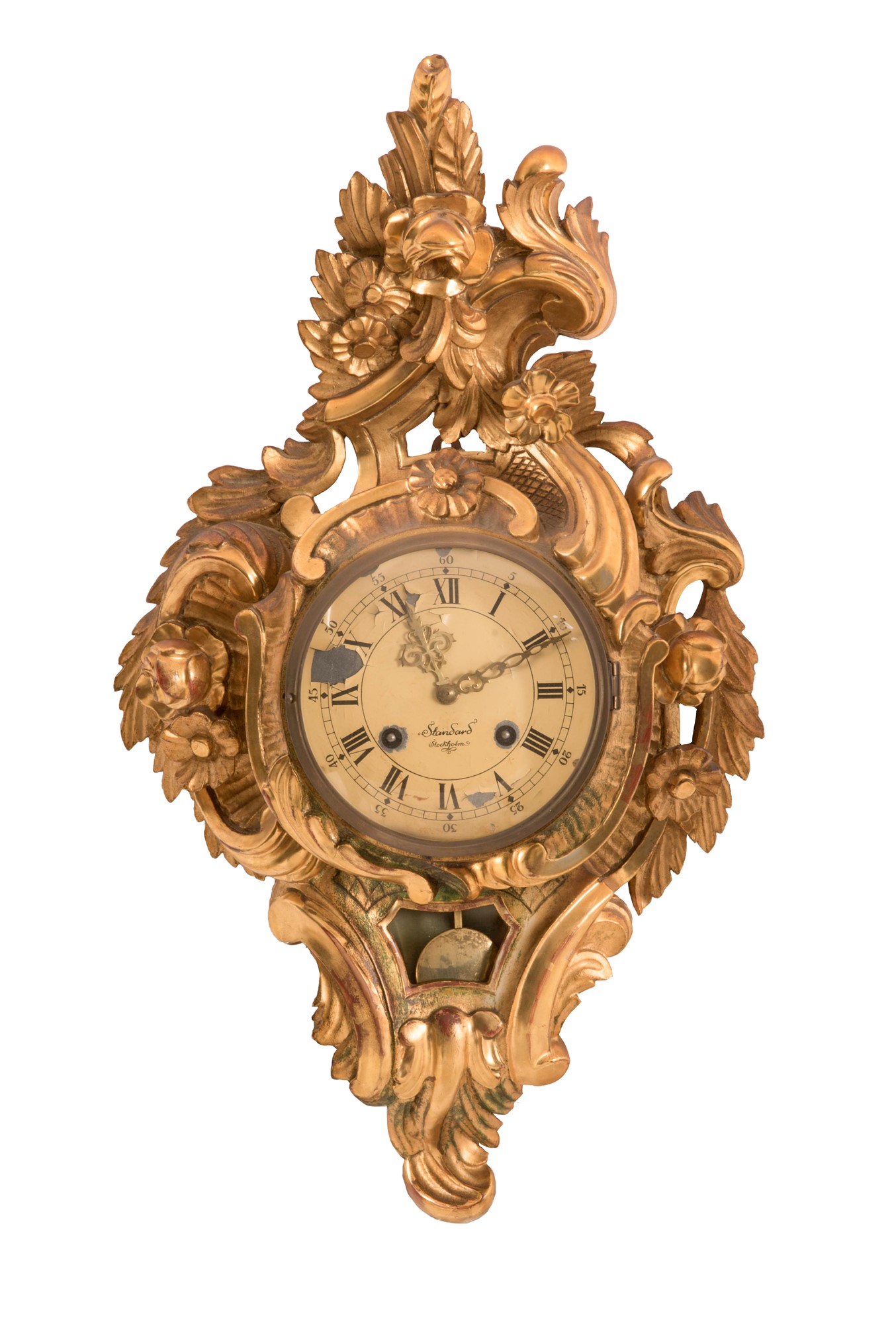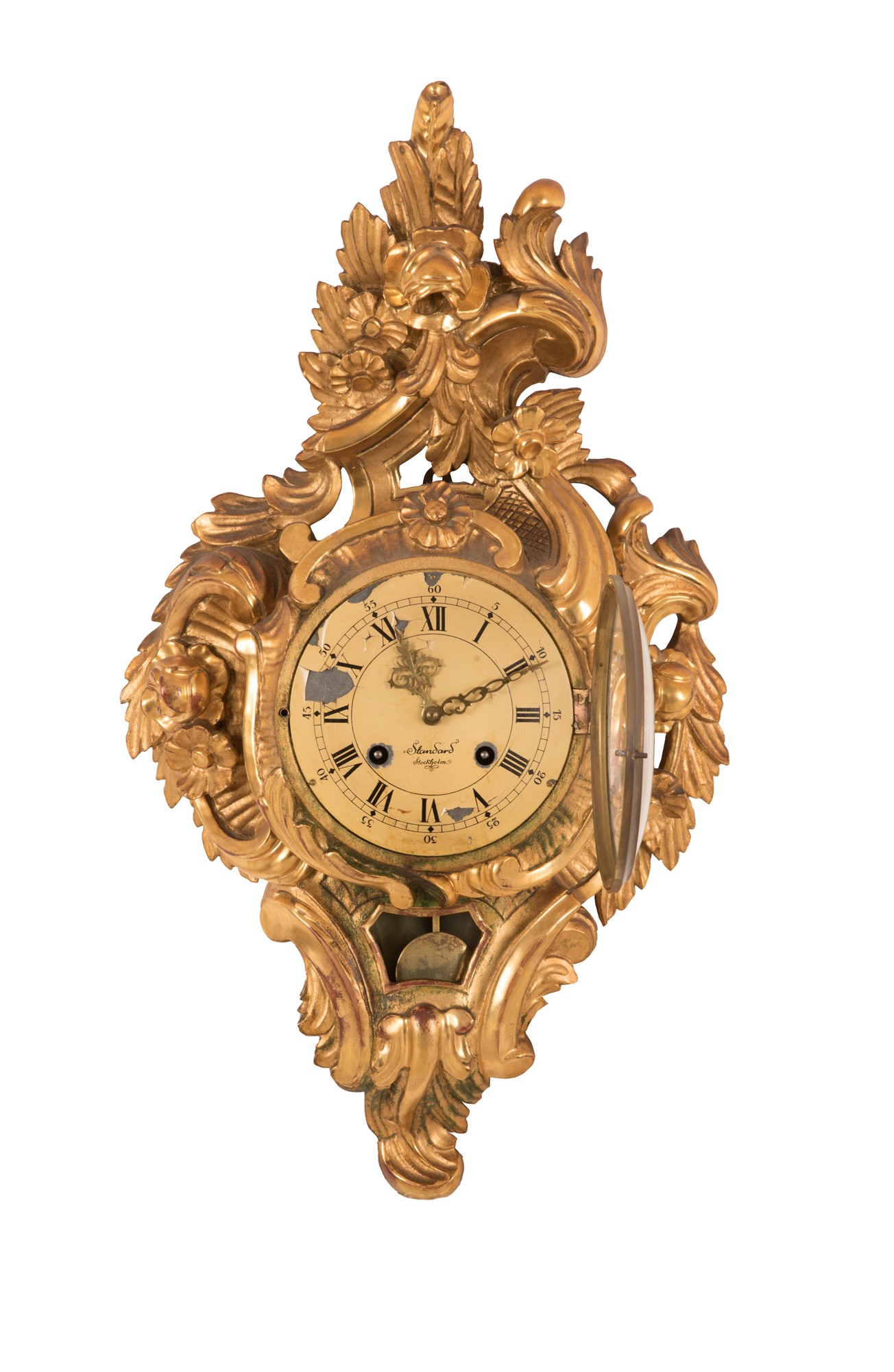 Lotto 8 | Orologio Cartel in legno dorato decorato a motivi vegetali e floreali cm 63x36