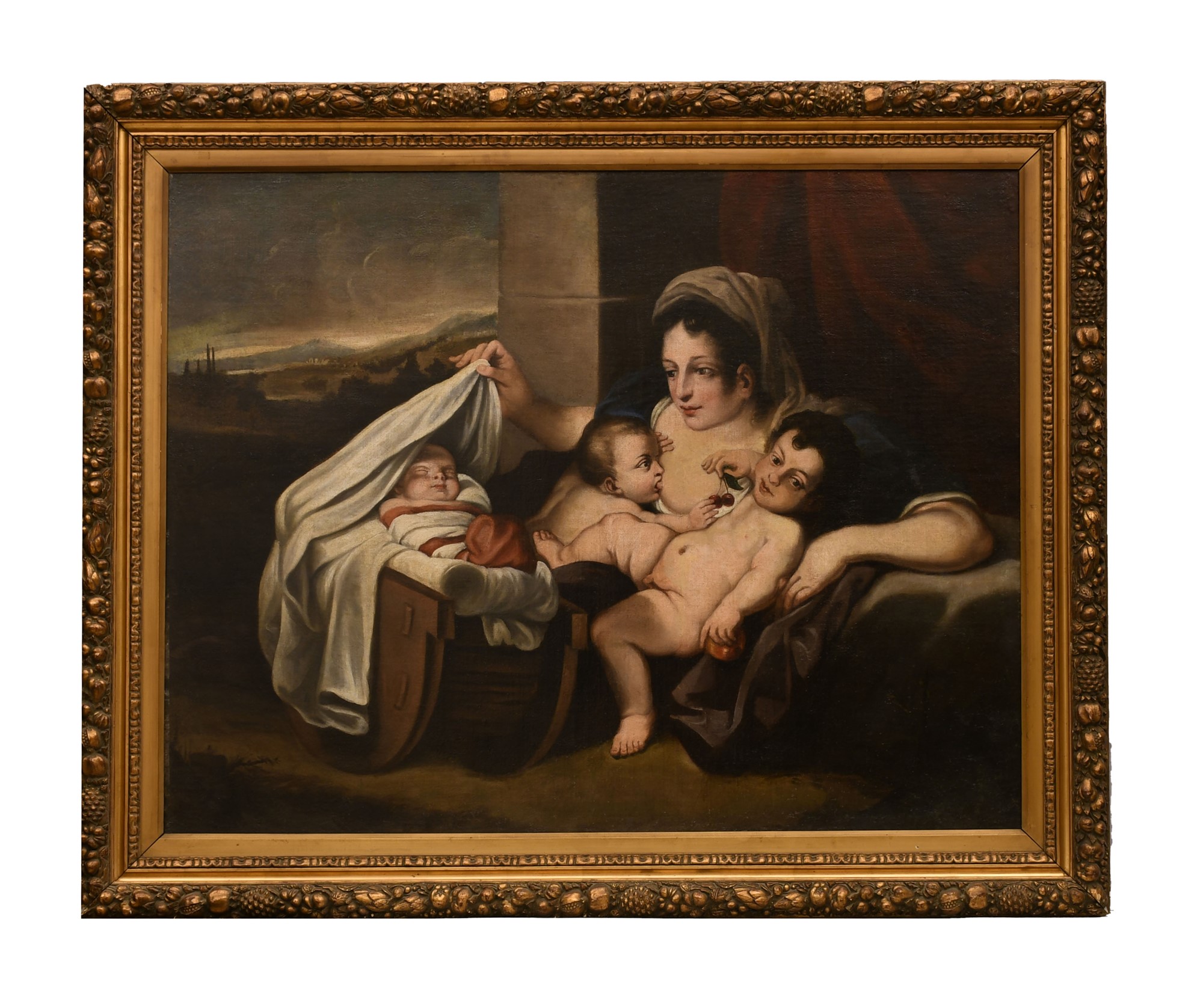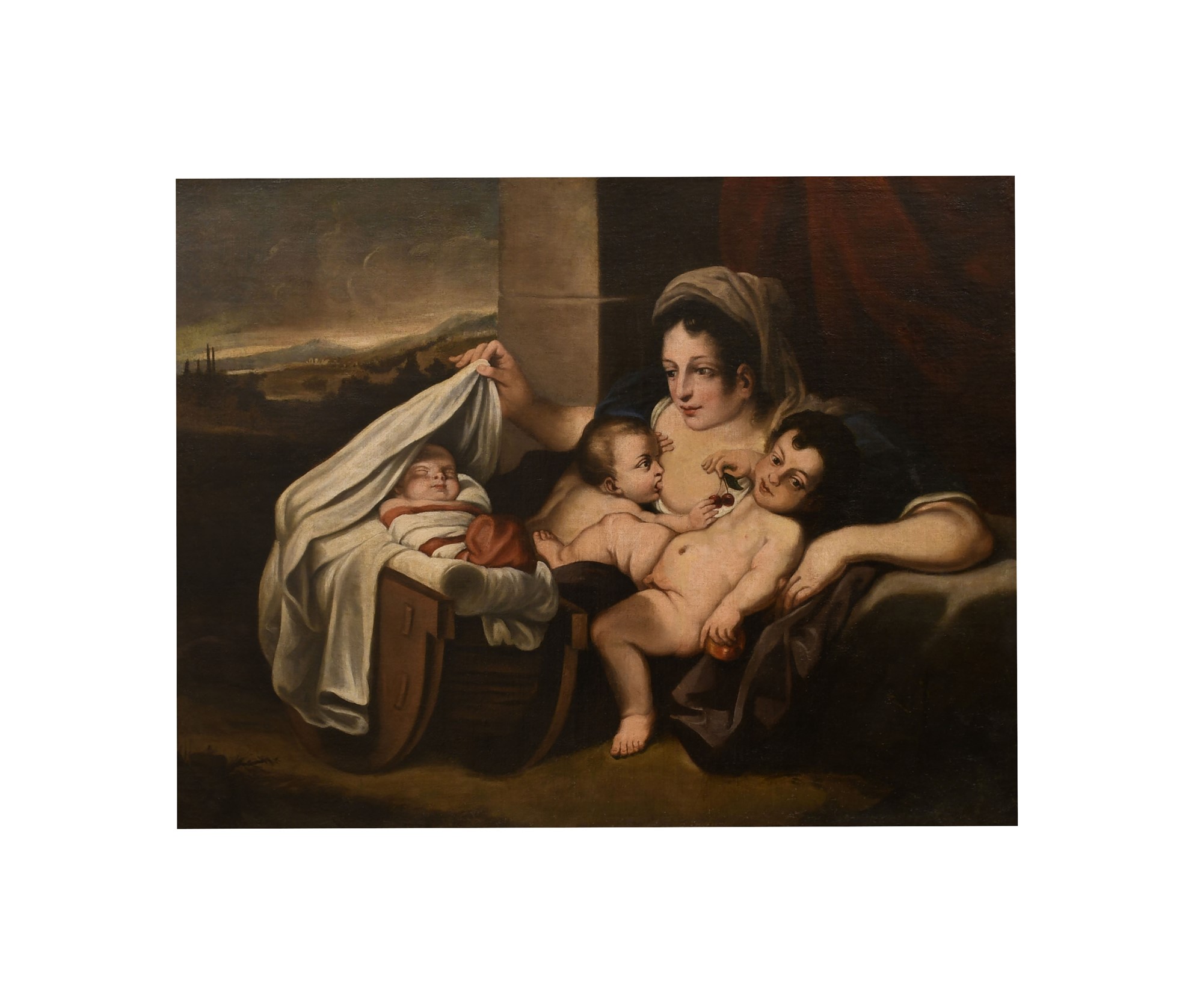Il dipinto rappresenta un soggetto iconografico che riprende uno schema diffuso e collaudato che pone al centro della composizione la madre con il bambino allattato al seno e gioca con due ciliegie che tiene in mano il più grande. La madre è rappresentata nell'atto di sollevare il lenzuolo che copre la culla del più piccolo che dorme.