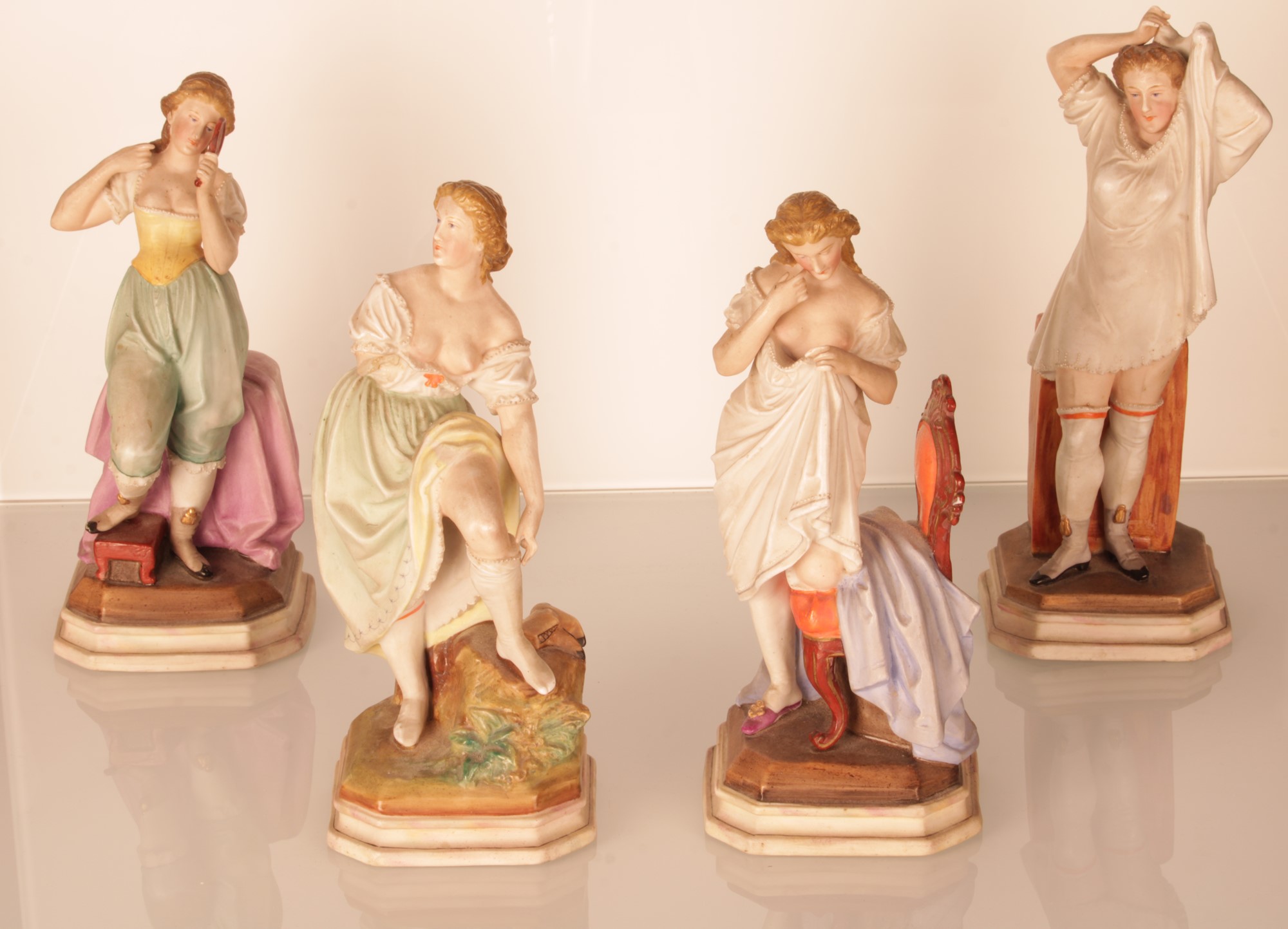 altezza cm 20 ca Lotto di quattro statuine policrome rappresentanti giovani donne nell'atto di spogliarsi