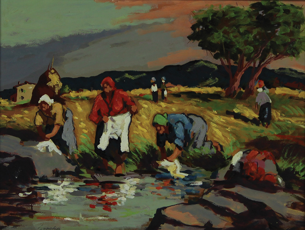 Signorini Lavandaie tempera su tavola, cm. 30x40 firmata in basso a sinsitra